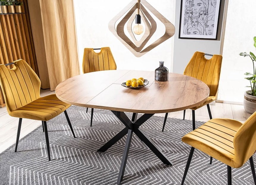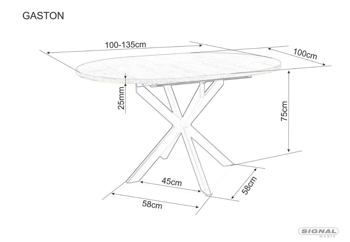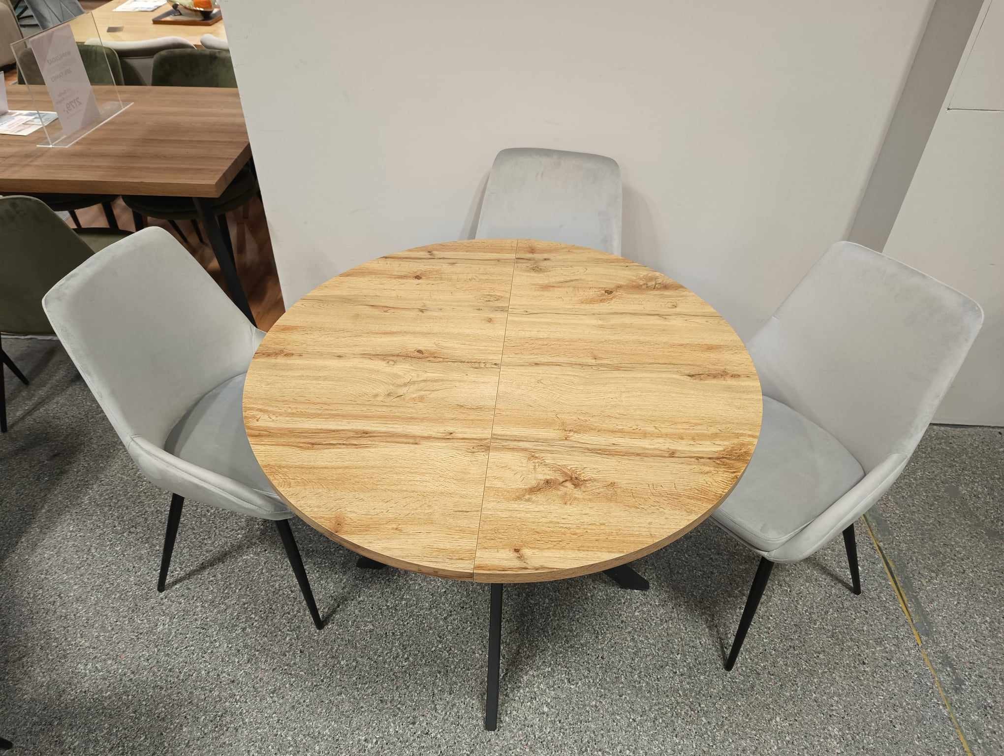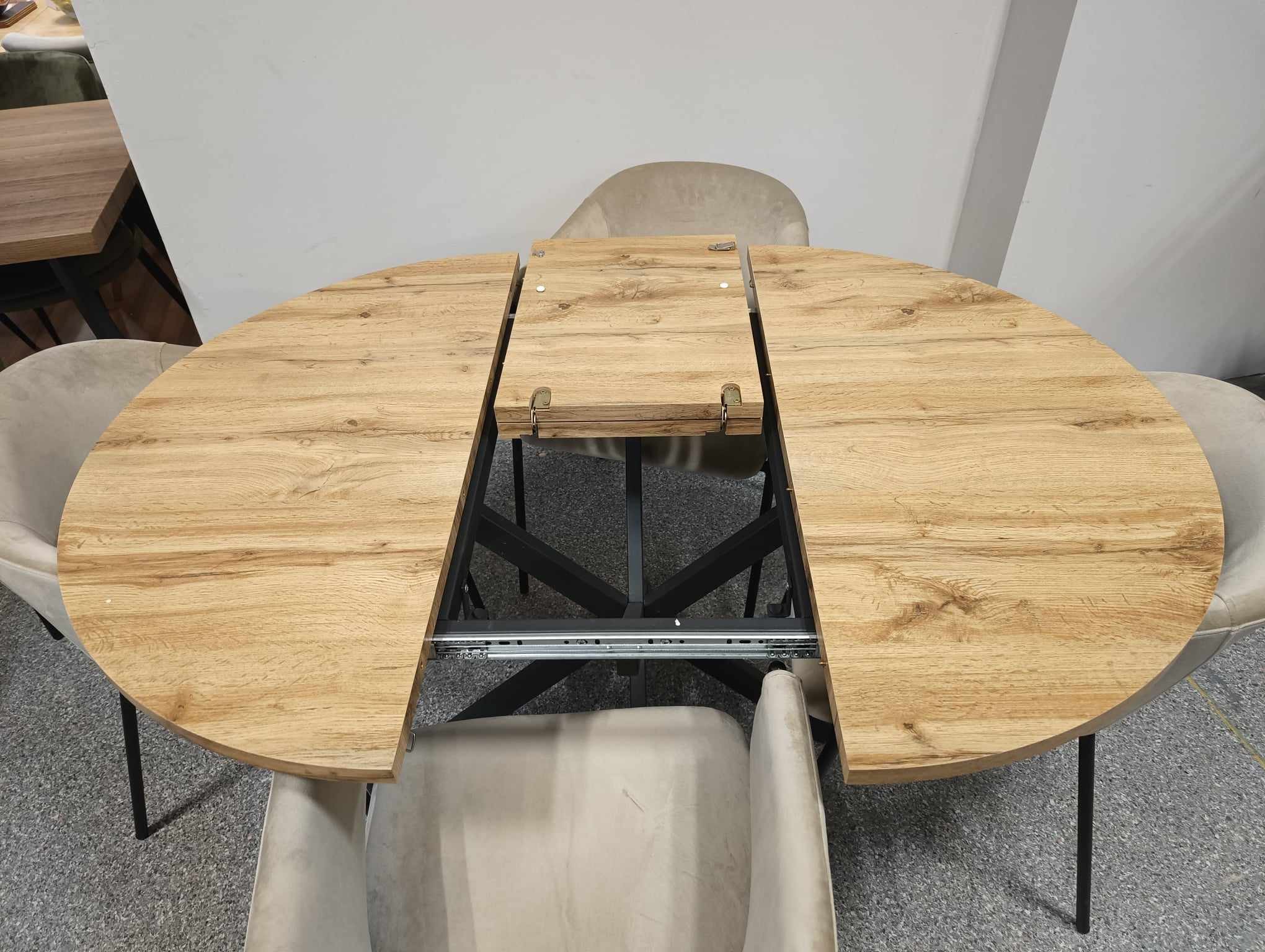 Stół Gaston to propozycja dla osób szukających niedużego stołu okrągłego w stylu loftowym, który jest rozkładany. Jego dodatkowym atutem jest wkładka która mieści się pod blatem i nie ma potrzeby przechowywania jej poza stołem. Blat wykonany został z wytrzymałej płyty laminowanej w okleinie dąb wotan, która ładnie odwzorowuje naturalne drewno. Nogi natomiast z metalu pomalowanego proszkowo na kolor czarny. Stół Gaston idealnie wpisze się we wszystkie wnętrza urządzone w industrialnym klimacie.