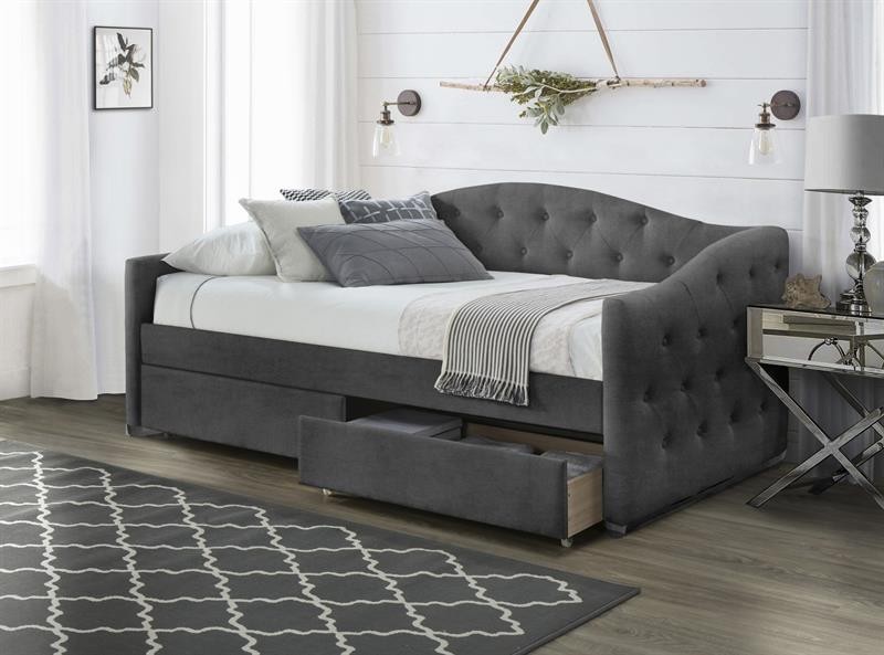 łóżko z szufladami, materiał: tkanina / drewno lite - kauczukowe, kolor: popielaty, w opcji materac POLARIS 90