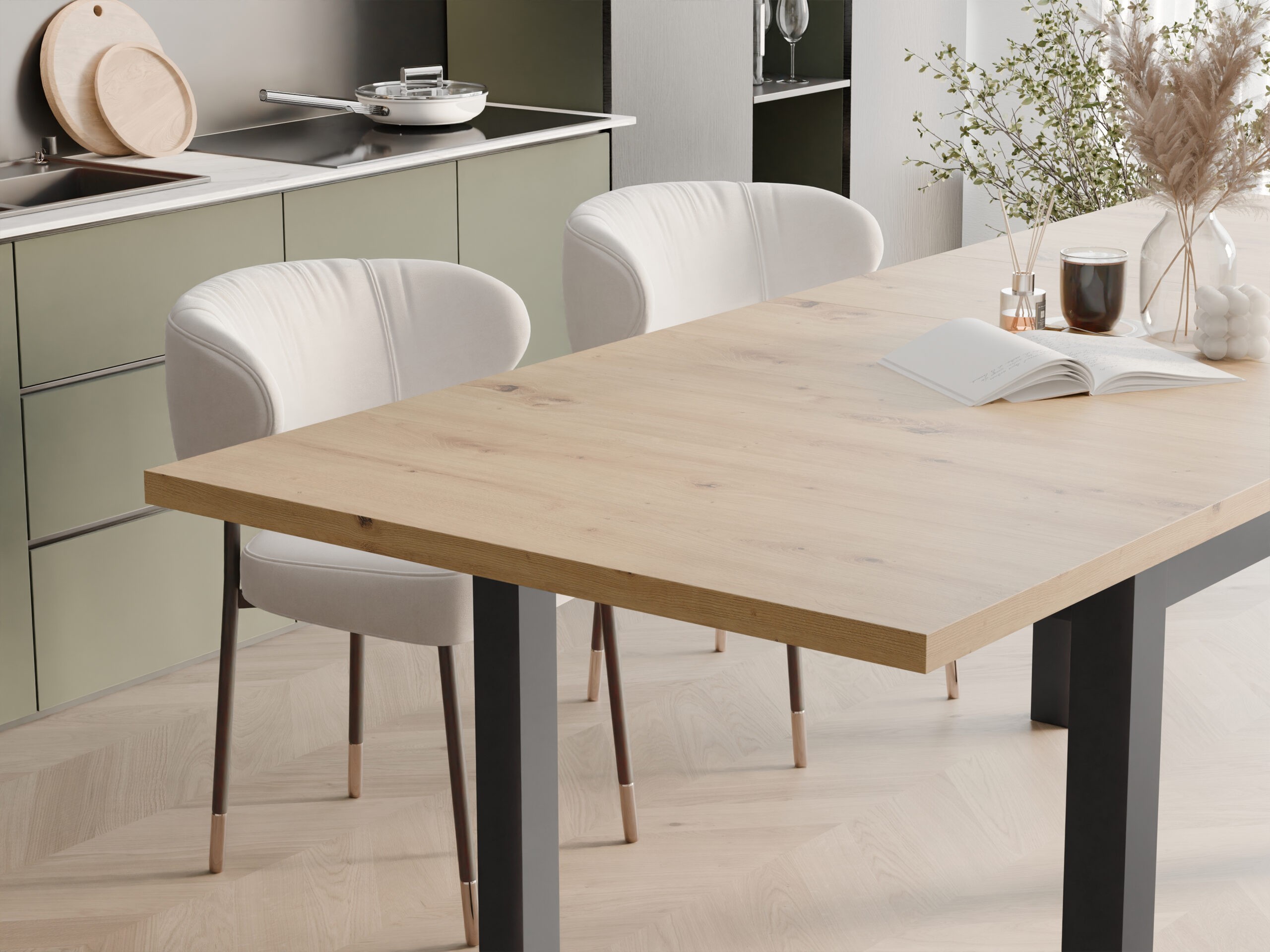 Minimalistyczny wygląd oraz modne połączenie jasnego blatu z ciemnymi nogami sprawiają, że stół doskonale wpisuje się w różne style: