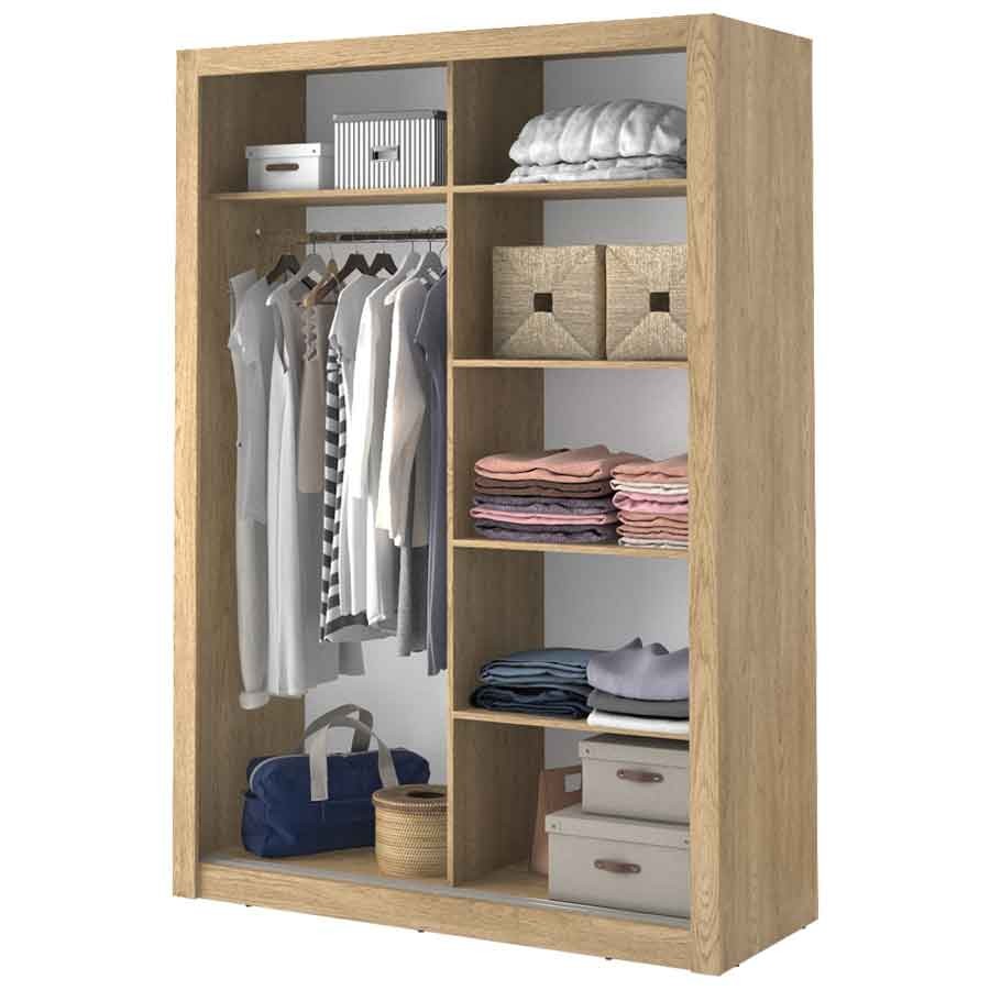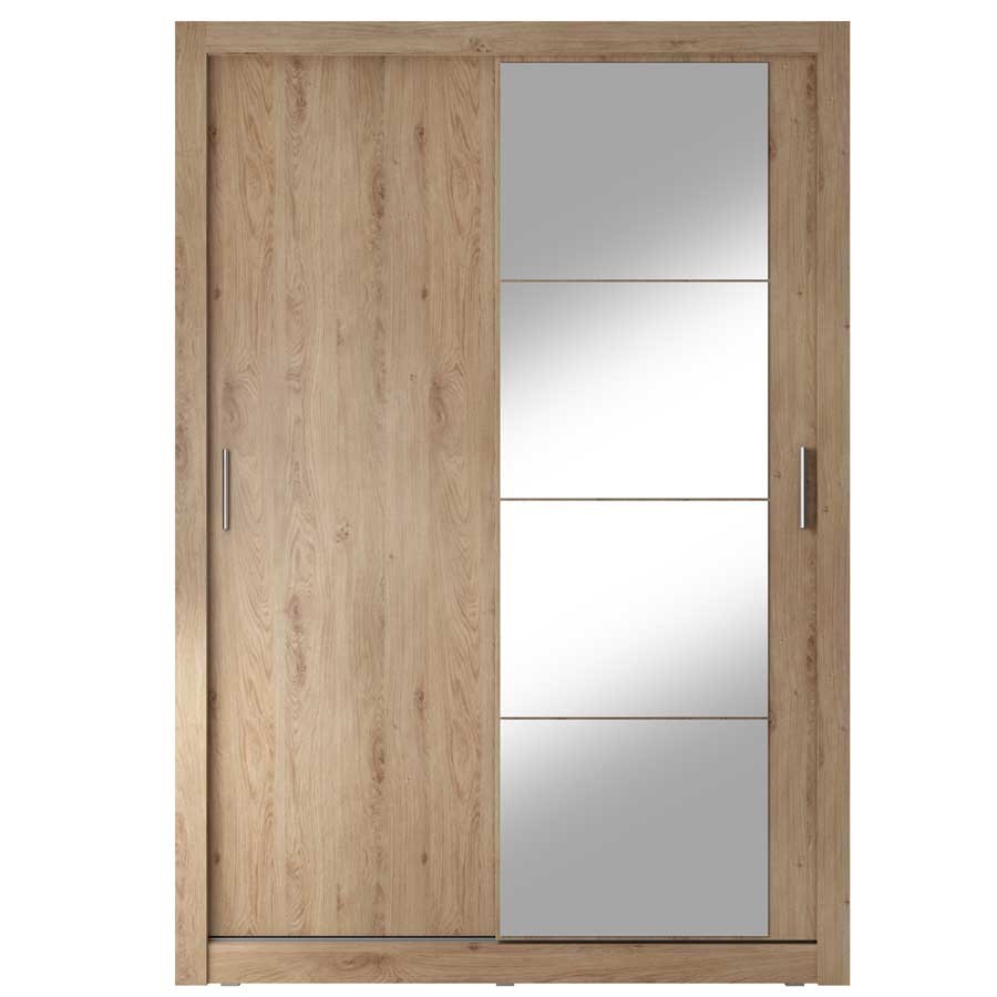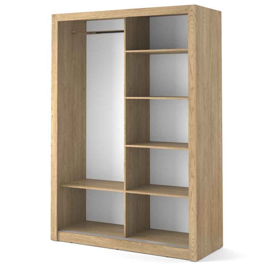 Szafa z dwojgiem drzwi przesuwnych zmieści się w każdym pomieszczeniu. Lustro umieszczone na jednym z frontów optycznie powiększa przestrzeń. Wewnątrz znajduje się drążek na wieszaki oraz półki. Na górnej półce zmieścisz rzadziej używane rzeczy lub walizki.