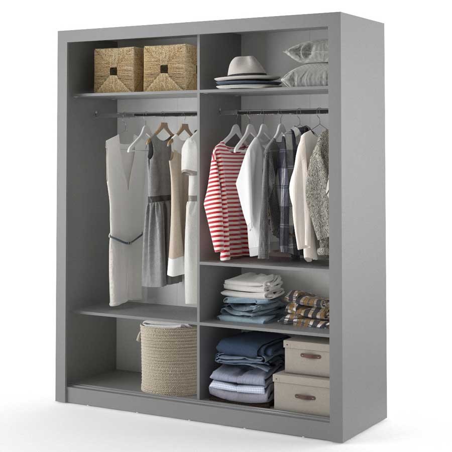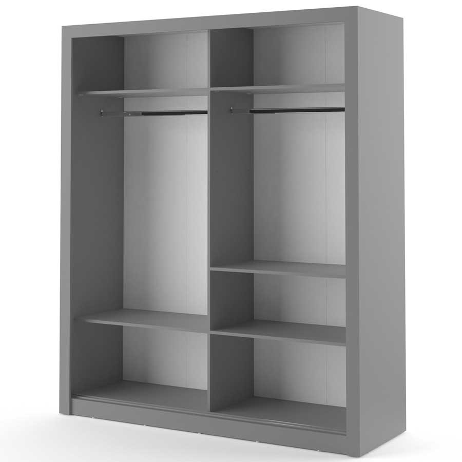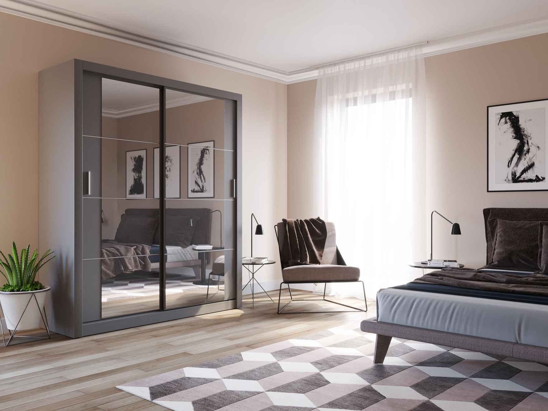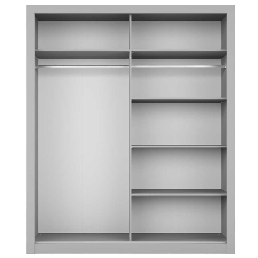 Pojemna szafa z dwojgiem drzwi przesuwnych. Na frontach drzwi znajdują się lustra, które optycznie powiększają przestrzeń, rozjaśniają wnętrze oraz znacząco wpływają na wygodę korzystania z mebla. Wnętrze szafy kryje dwa drążki na odzież oraz pięć praktycznych półek.