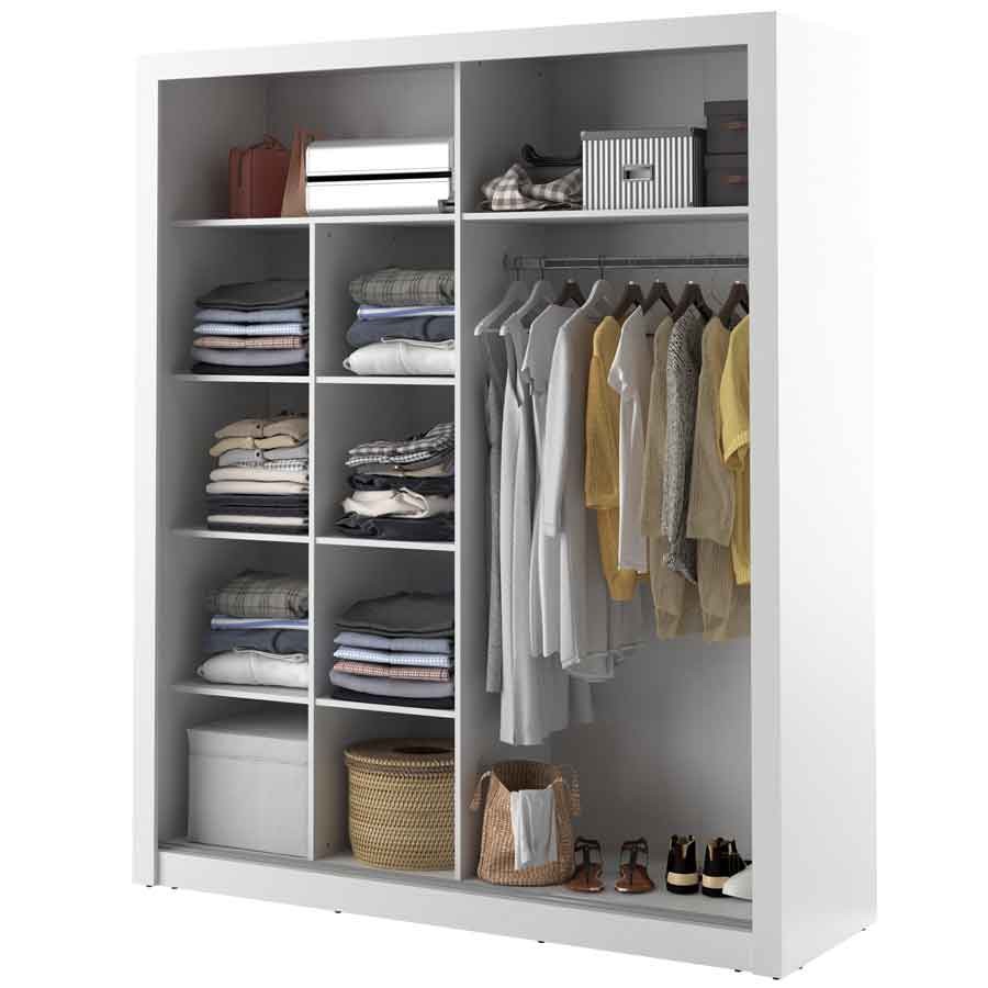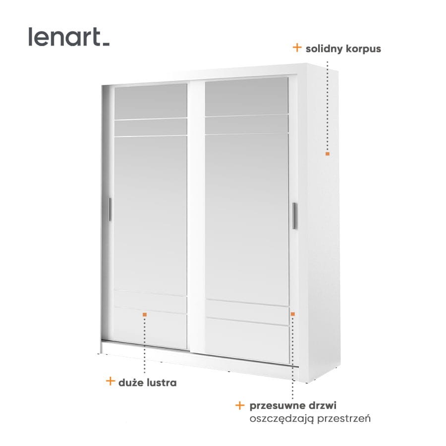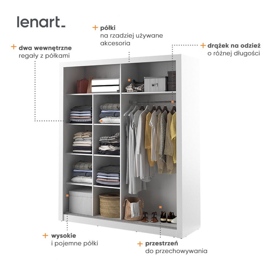 Pojemna szafa z dwojgiem drzwi przesuwnych i ergonomicznym układem wnętrza. Na frontach znajdują się lustra, które optycznie powiększają wnętrze. Wewnątrz szafy znajduje się drążek na ubrania, regał z półkami oraz pojemne górne półki, na których wygodnie przechowasz sezonową odzież i obuwie lub walizki.