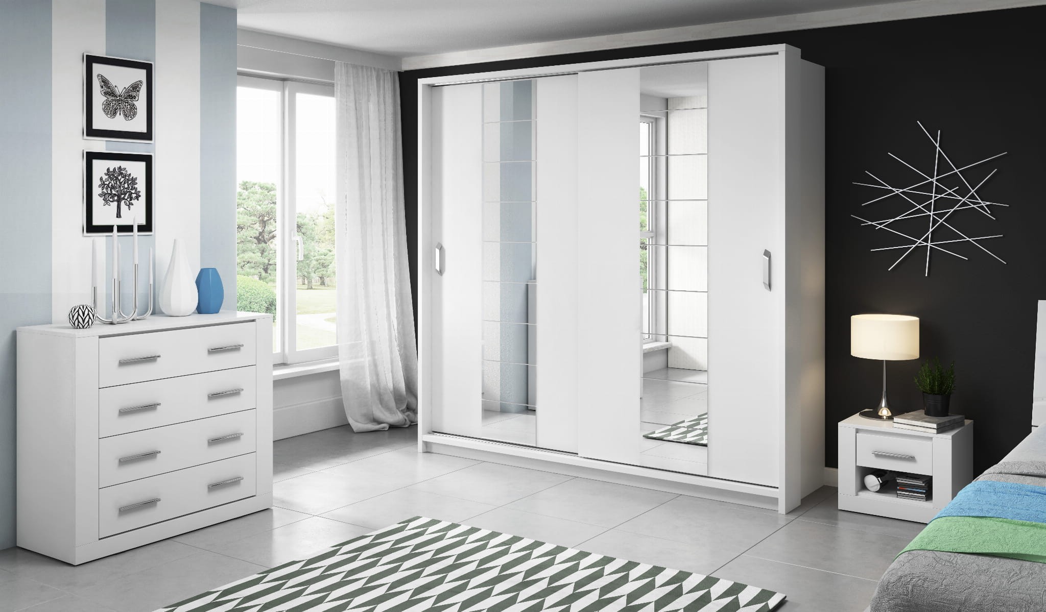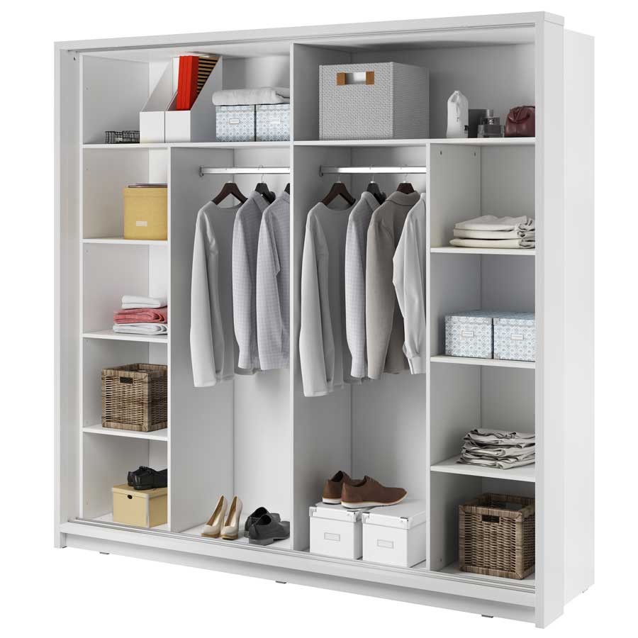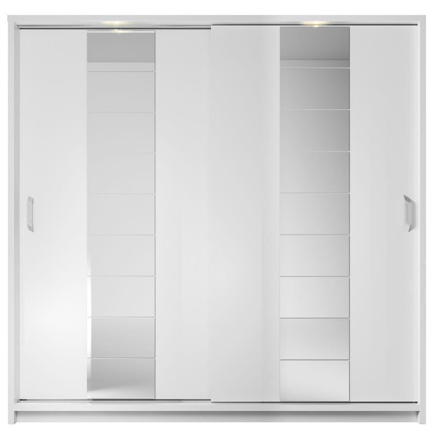 Pojemna szafa z dwojgiem drzwi przesuwnych i energooszczędnym oświetleniem ledowym. Lustra umieszczone na obydwu frontach optycznie powiększają wnętrze, a oryginalne uchwyty nadają szafie ciekawy charakter. Szafa jest wyposażona z dwa drążki na wieszaki dwa wewnętrzne regały na ubrania.