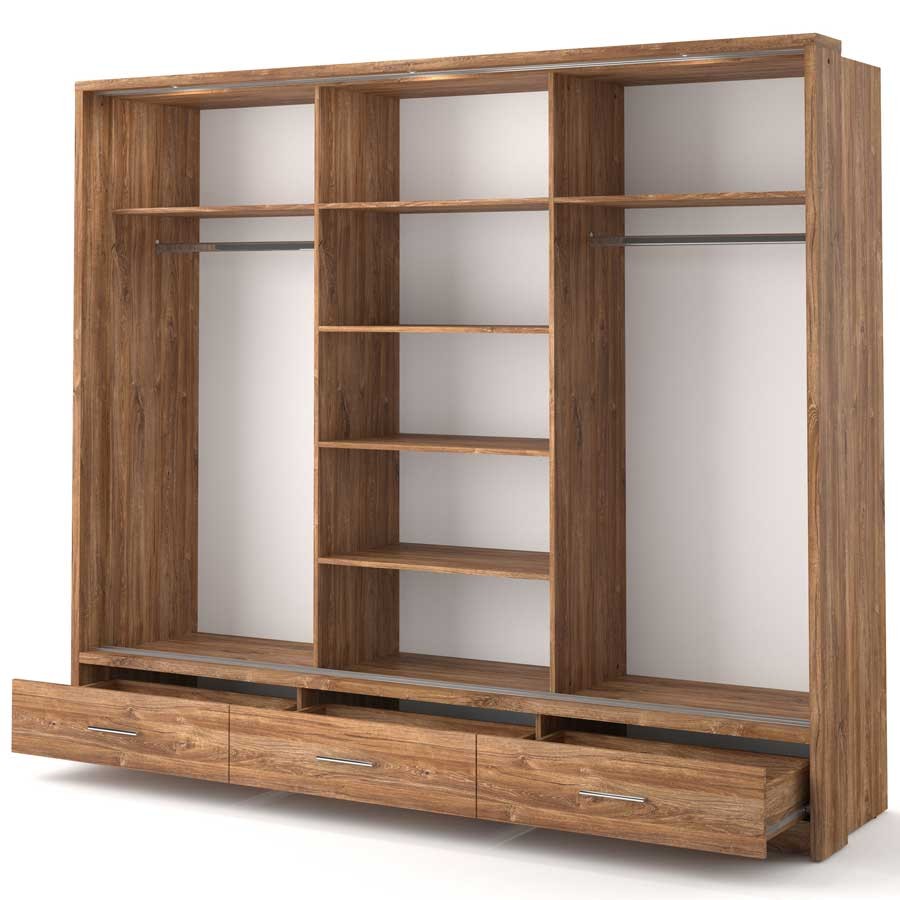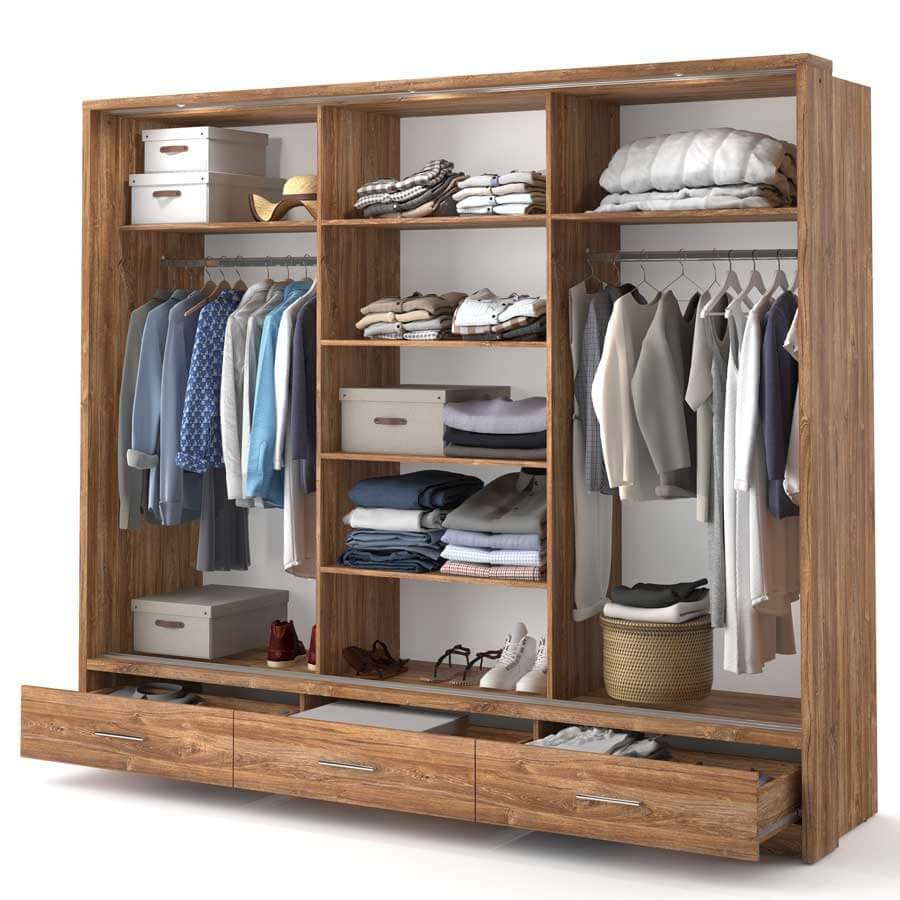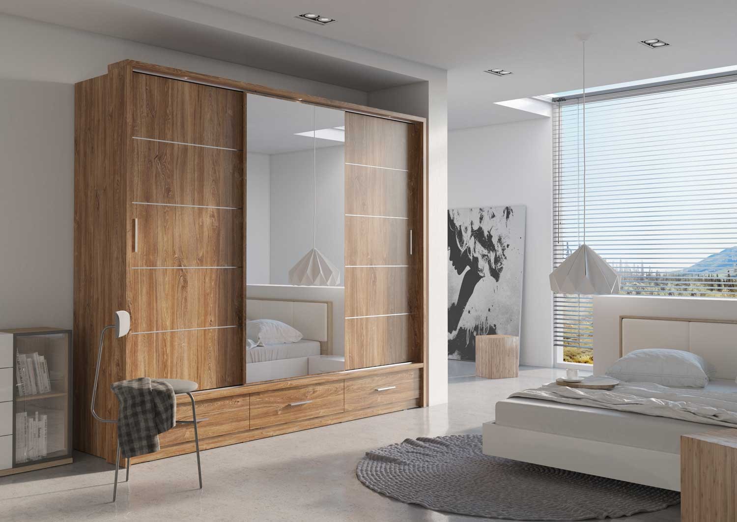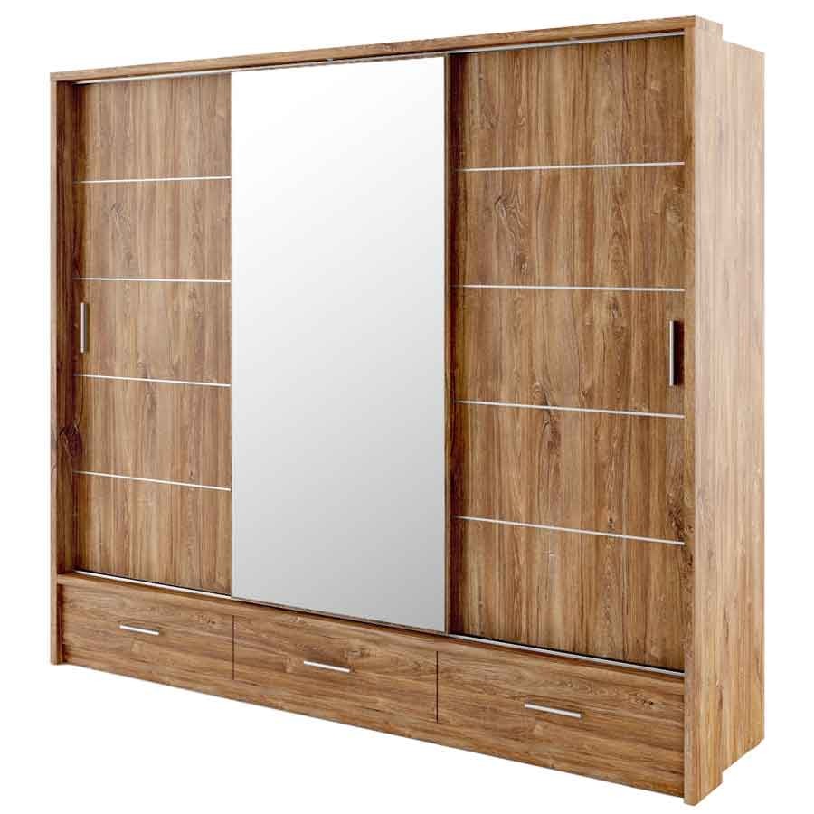 Pojemna szafa z trojgiem drzwi przesuwnych. Na froncie środkowych drzwi znajduje się duże lustro-niezbędny element każdej garderoby. Na dole szafy zaplanowano trzy łatwo dostępne szuflady, a wewnątrz znajdziesz dwa drążki na ubrania oraz kilka pojemnych półek. Oświetlenie do szafy w komplecie. Mebel wykonano z wytrzymałej płyty laminowanej wykończonej trwałym obrzeżem ABS.
