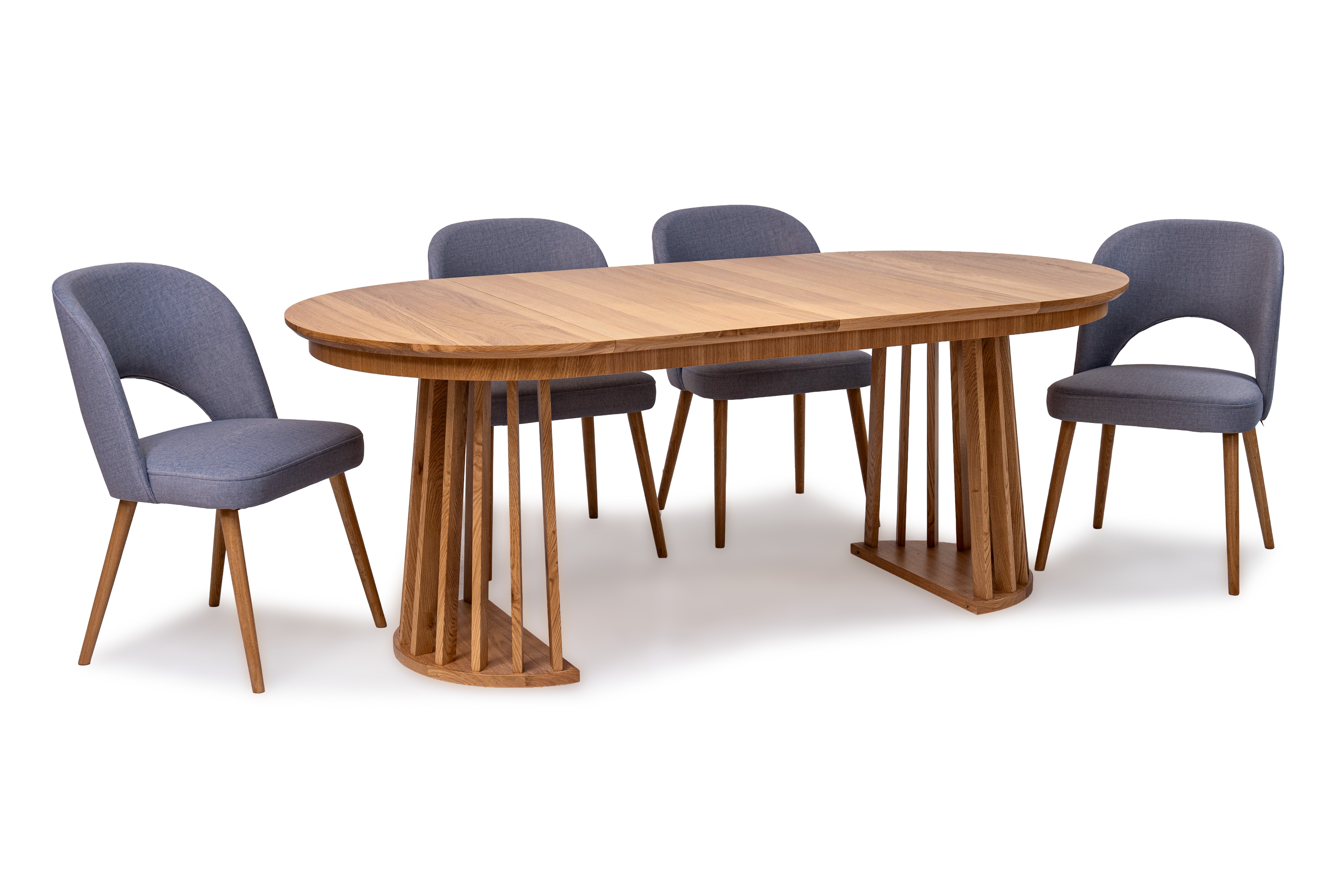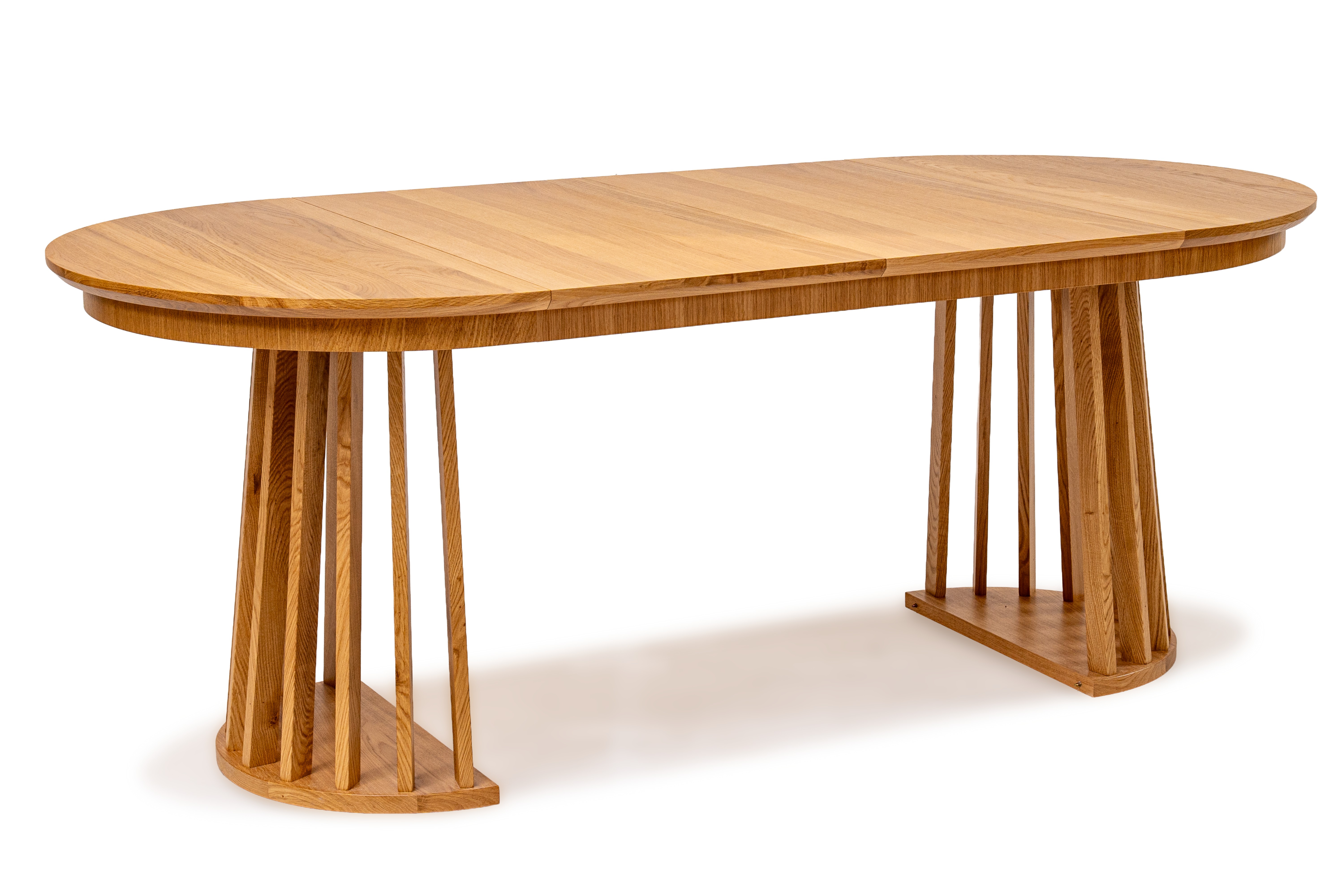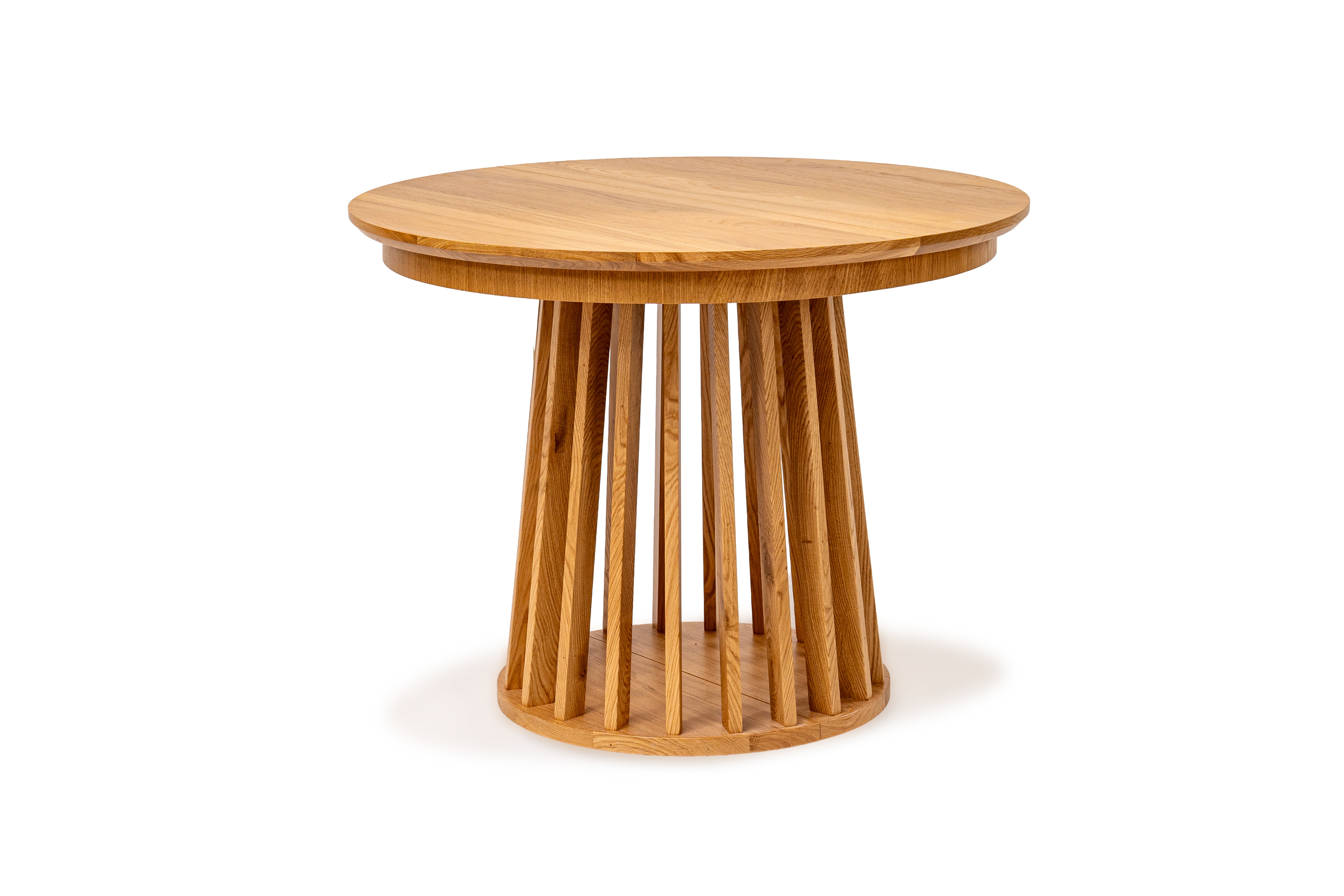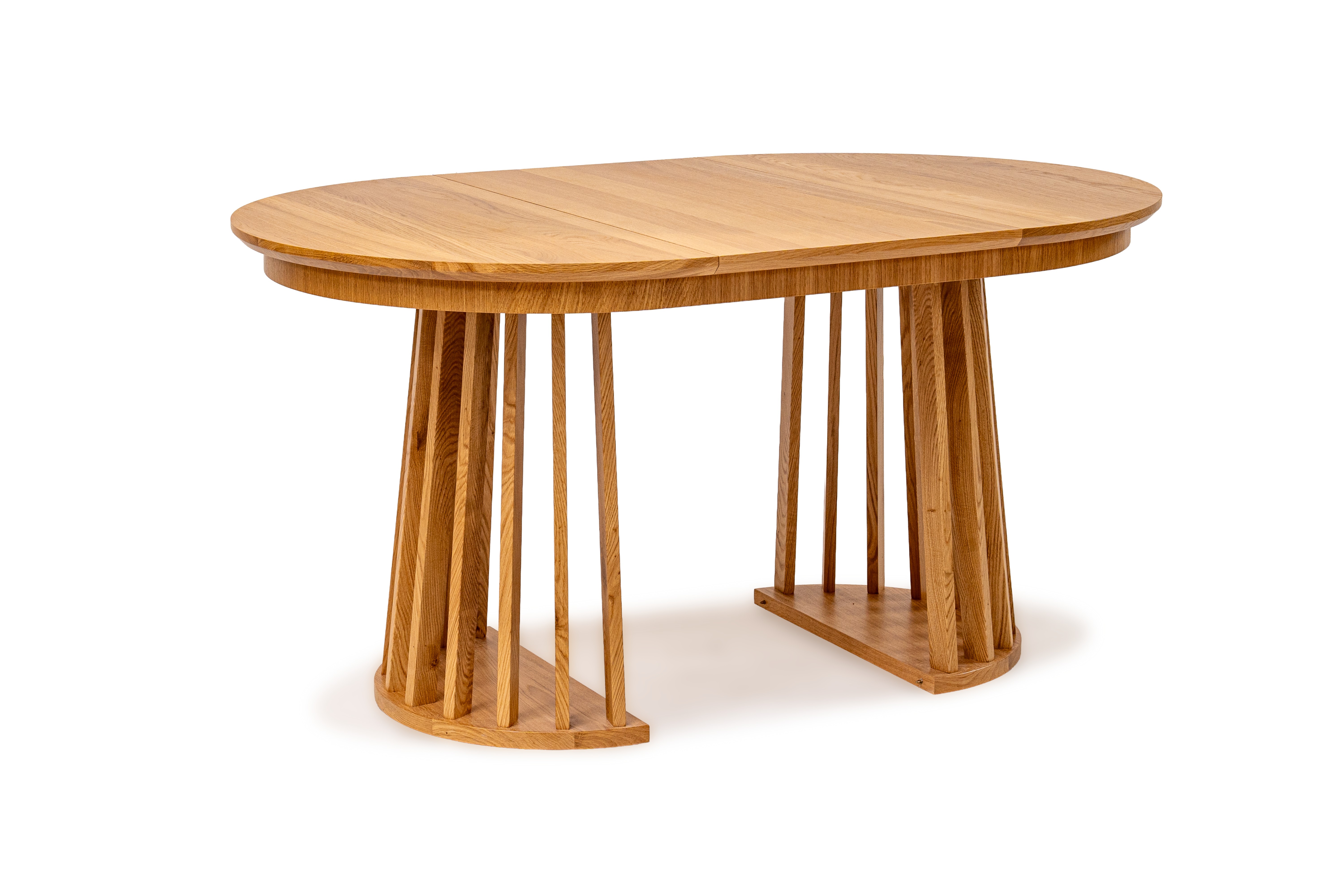 Najbardziej charakterystycznym elementem stołu jest jego oryginalna podstawa wykonana z pionowych, drewnianych listew. Taka forma nadaje meblowi lekkości wizualnej, a jednocześnie zapewnia stabilność i trwałość. Blat wykończony naturalną okleiną dębową podkreśla szlachetny charakter drewna i wprowadza do wnętrza ciepły, naturalny klimat.