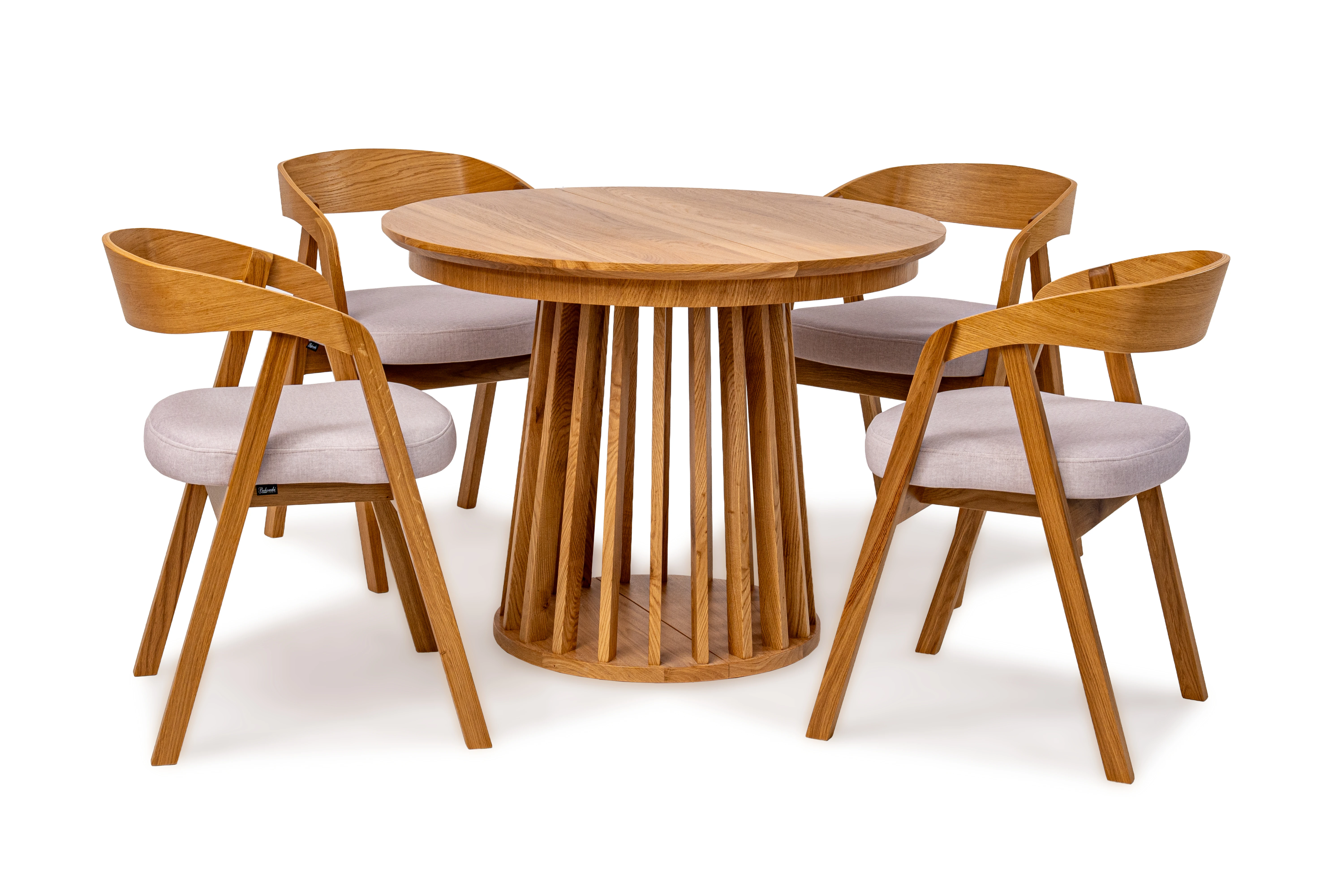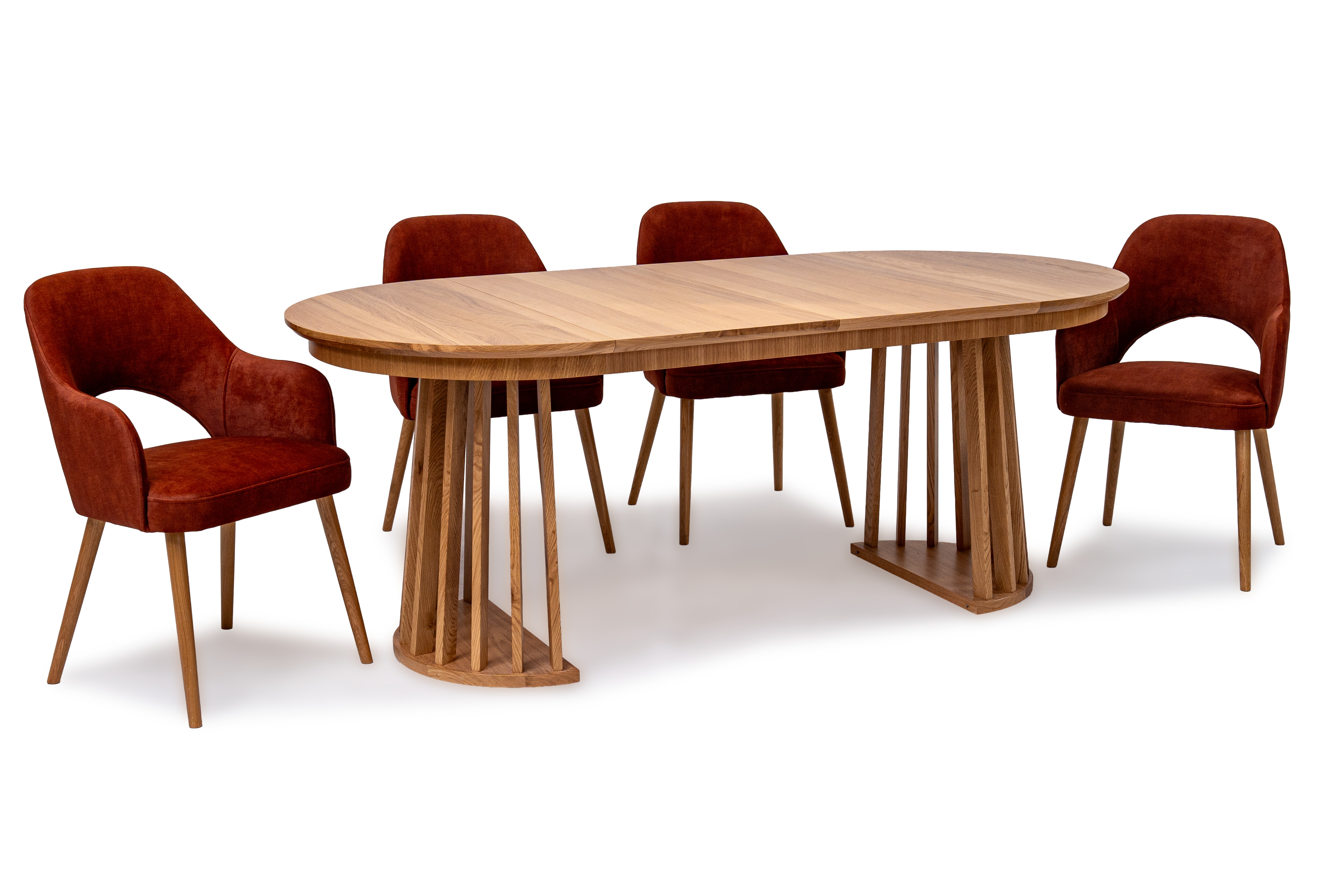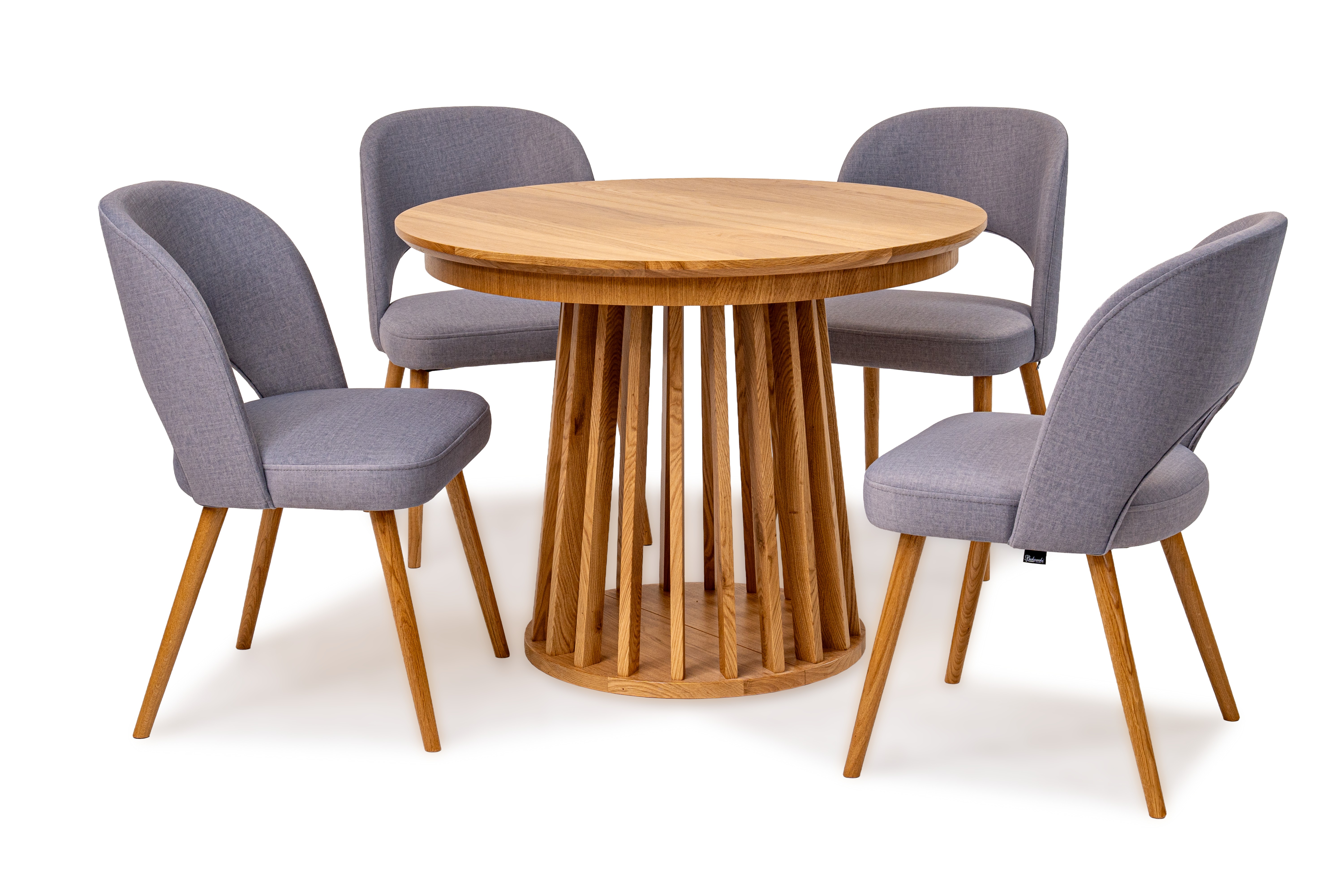 Najbardziej charakterystycznym elementem stołu jest jego oryginalna podstawa wykonana z pionowych, drewnianych listew. Taka forma nadaje meblowi lekkości wizualnej, a jednocześnie zapewnia stabilność i trwałość. Blat wykończony naturalną okleiną dębową podkreśla szlachetny charakter drewna i wprowadza do wnętrza ciepły, naturalny klimat.