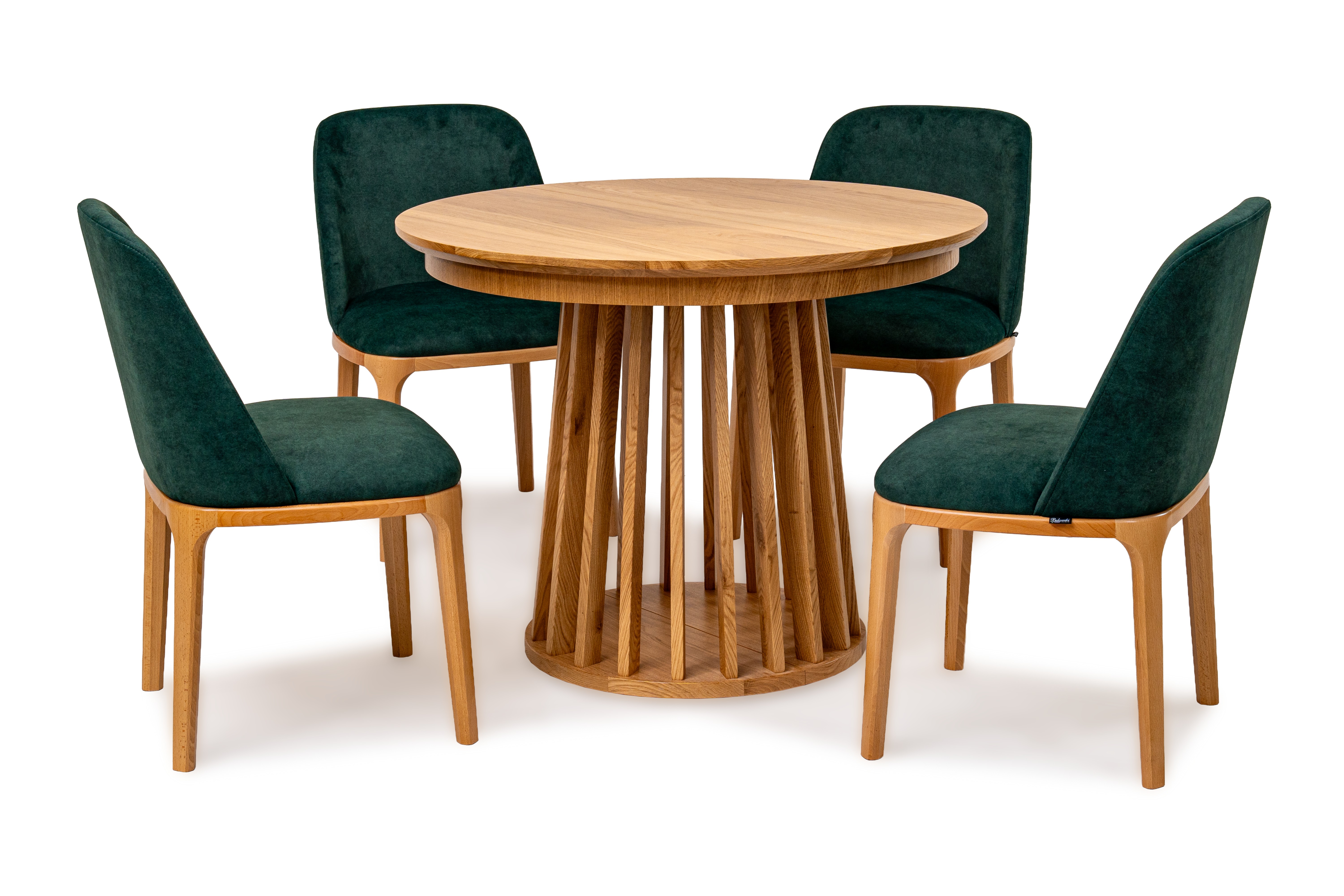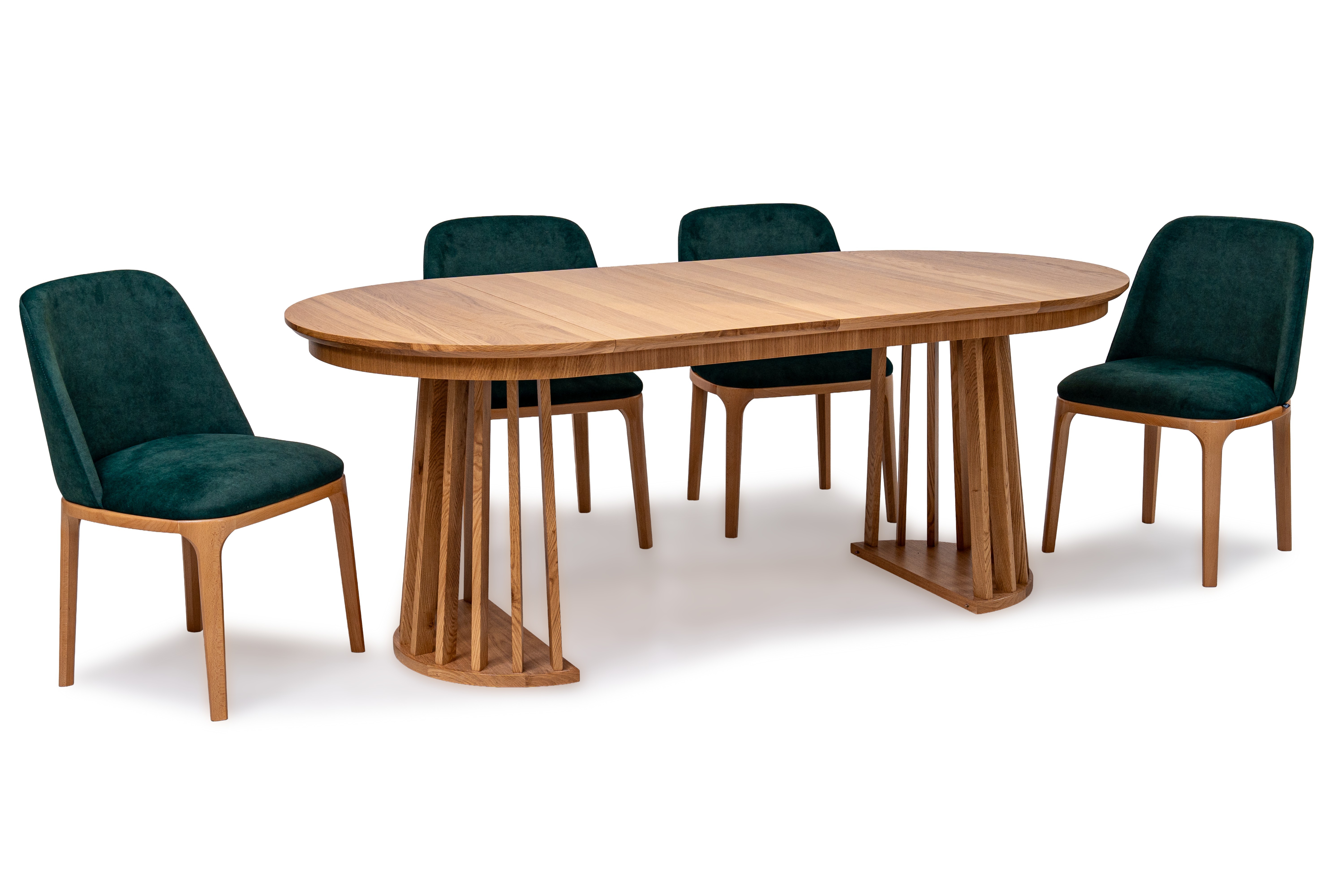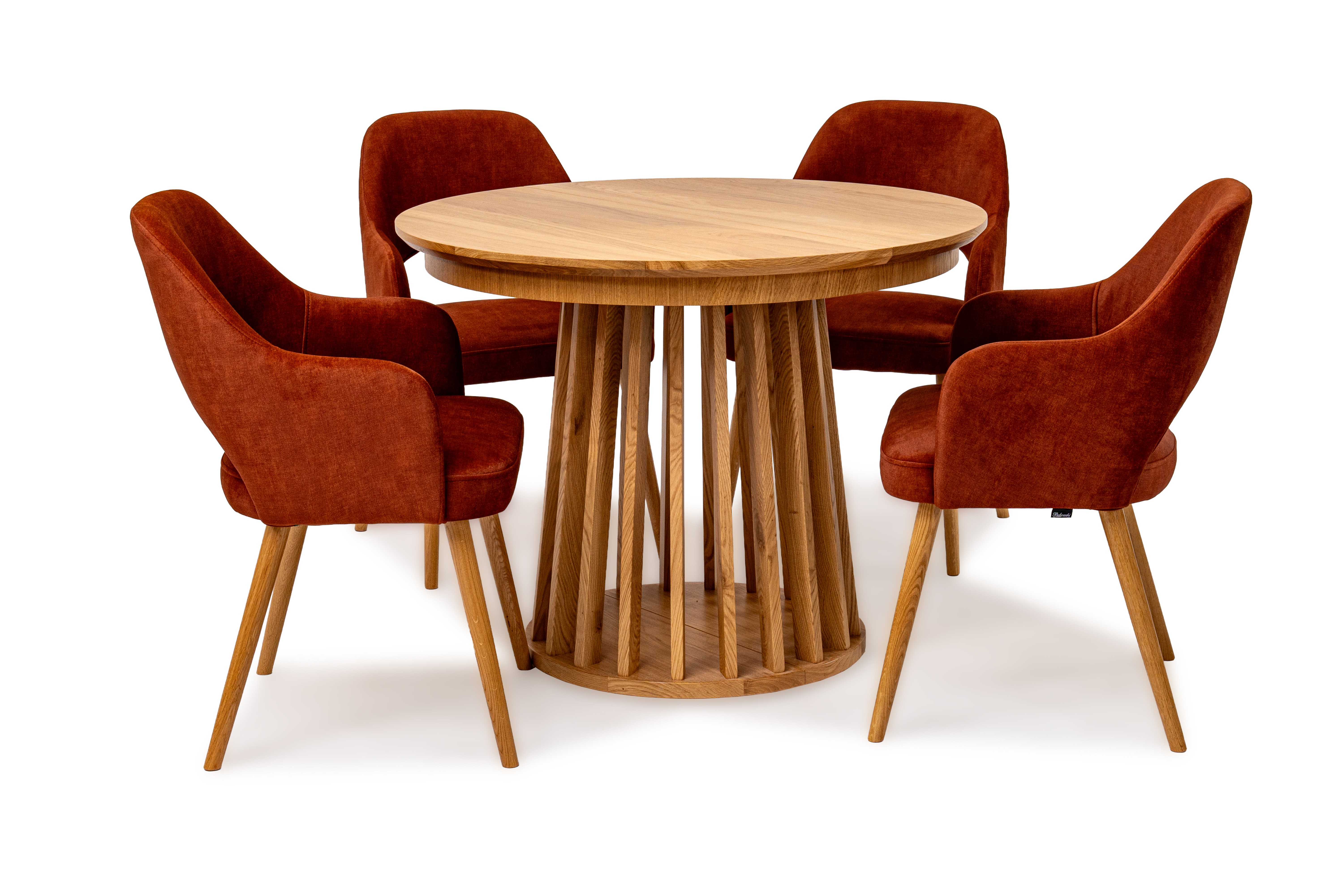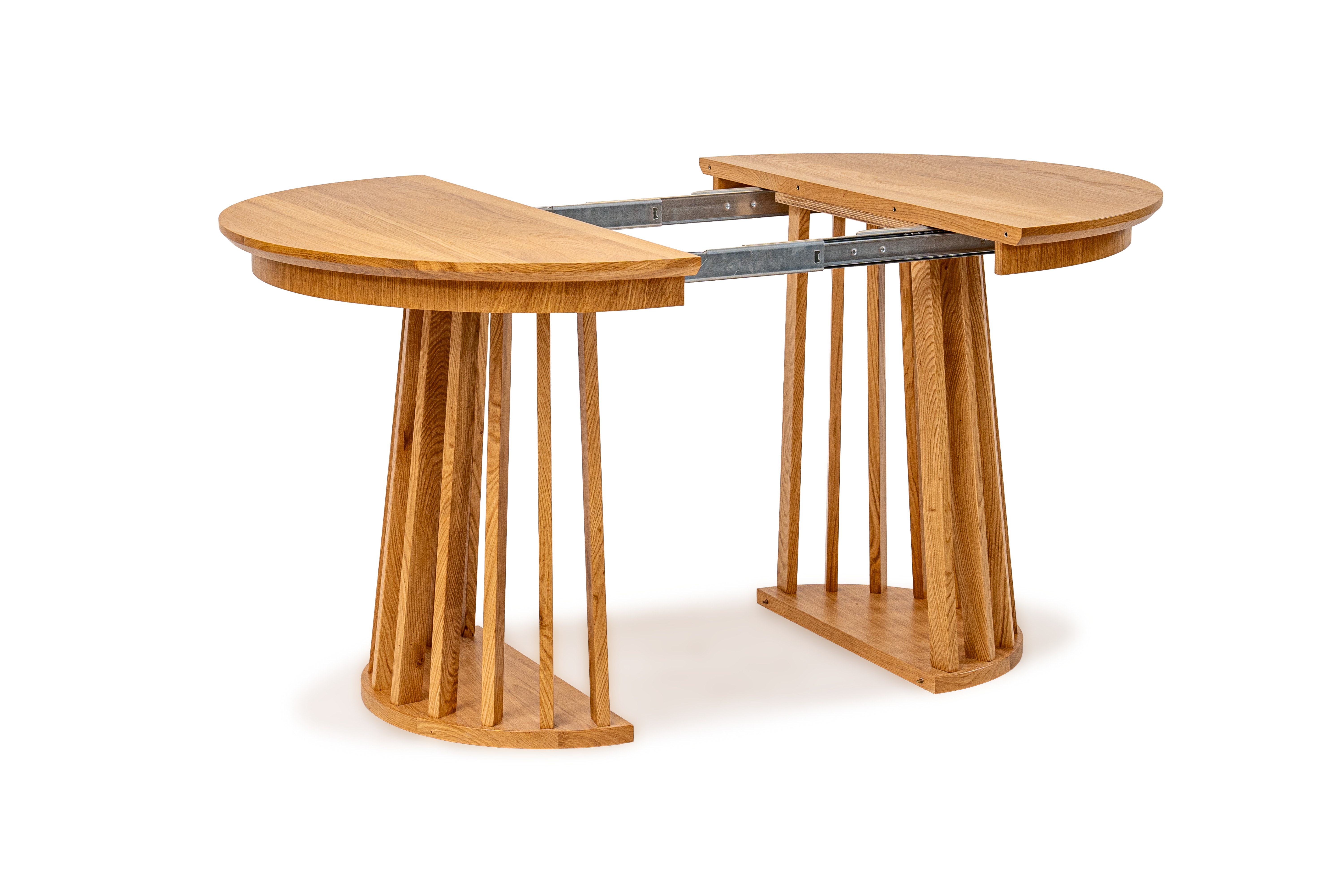 Najbardziej charakterystycznym elementem stołu jest jego oryginalna podstawa wykonana z pionowych, drewnianych listew. Taka forma nadaje meblowi lekkości wizualnej, a jednocześnie zapewnia stabilność i trwałość. Blat wykończony naturalną okleiną dębową podkreśla szlachetny charakter drewna i wprowadza do wnętrza ciepły, naturalny klimat.
