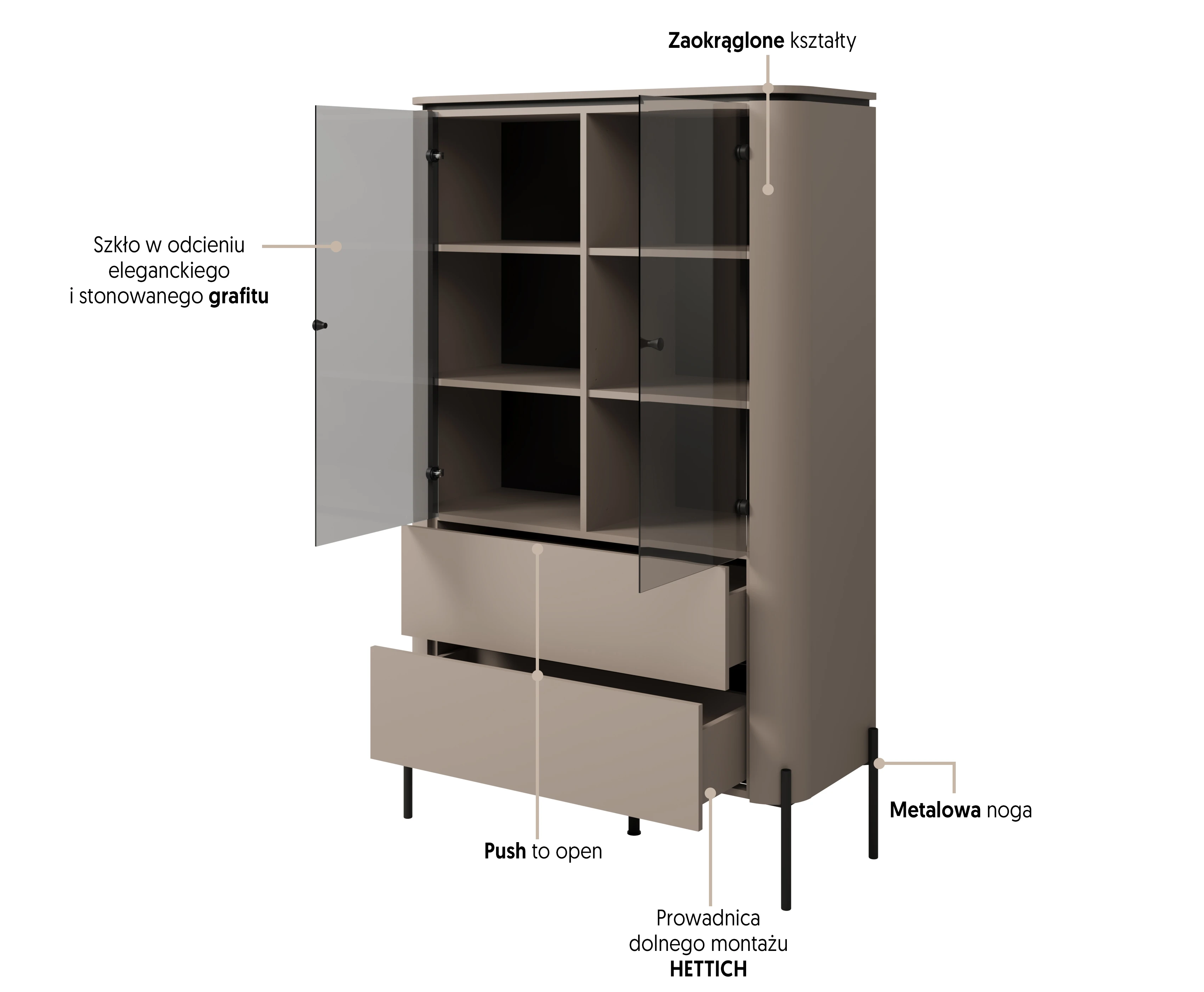 Beżowy odcień Congo w matowym wykończeniu sprawia, że witryna doskonale wpisuje się w modne aranżacje – od minimalistycznych, przez skandynawskie, aż po loftowe. Zaokrąglone krawędzie nadają bryle subtelności i wyróżniają ją na tle klasycznych, prostych form.
