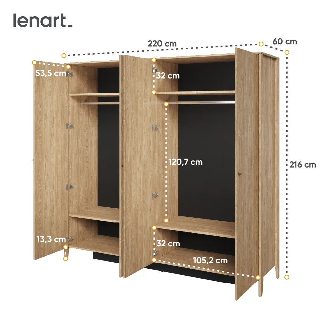 - Wyposażenie: 6 półek i 2 drążki garderobiane