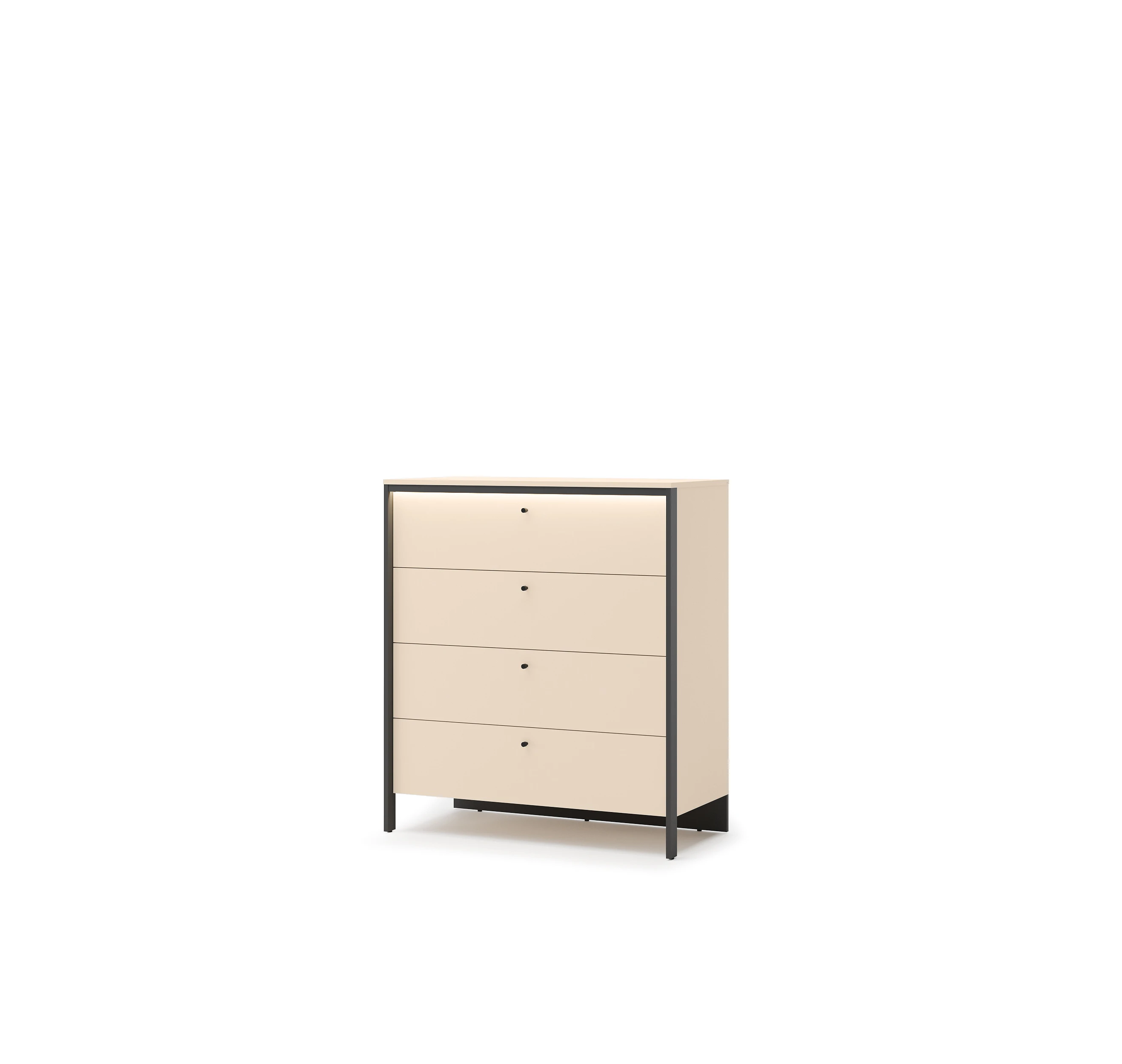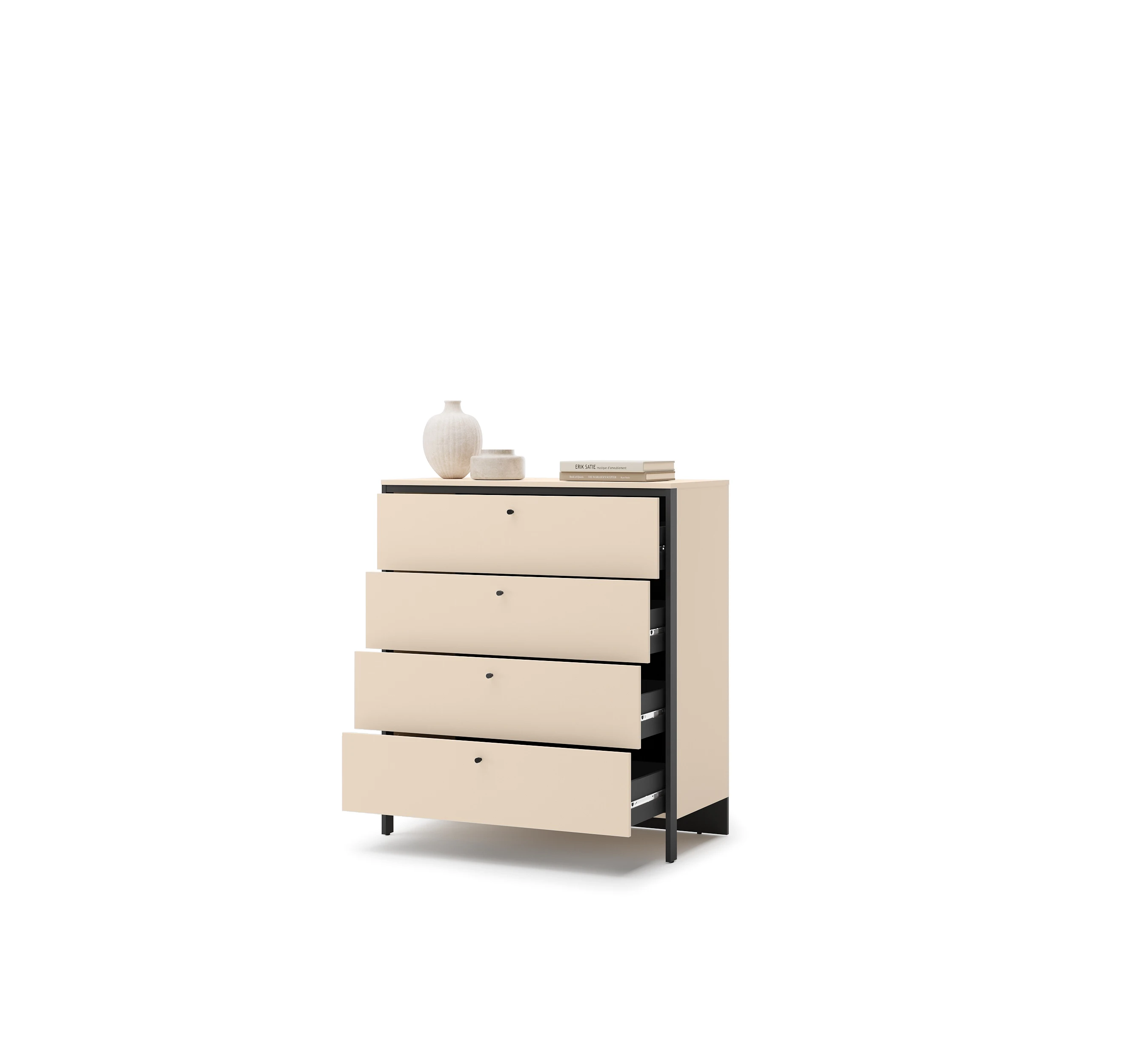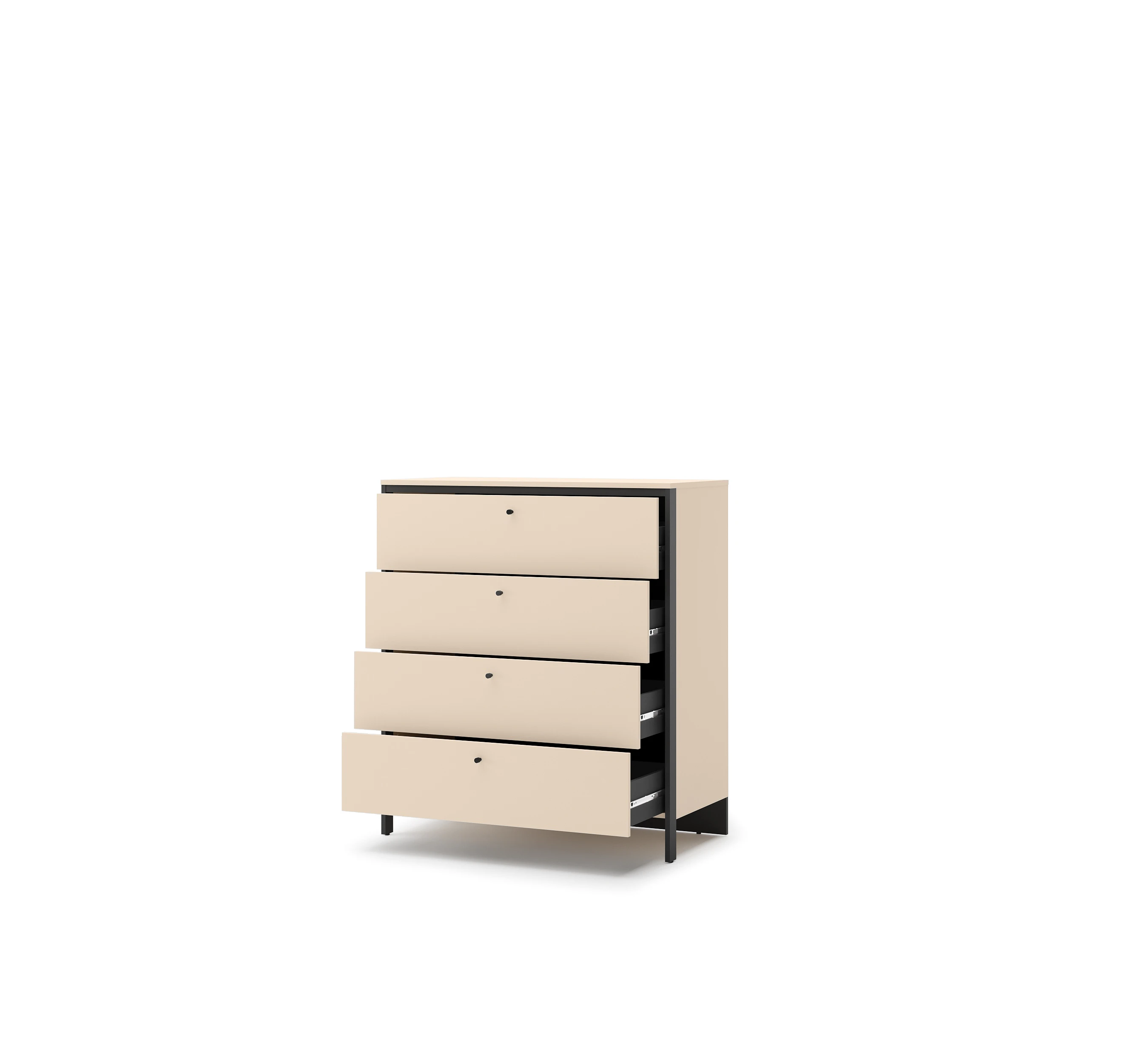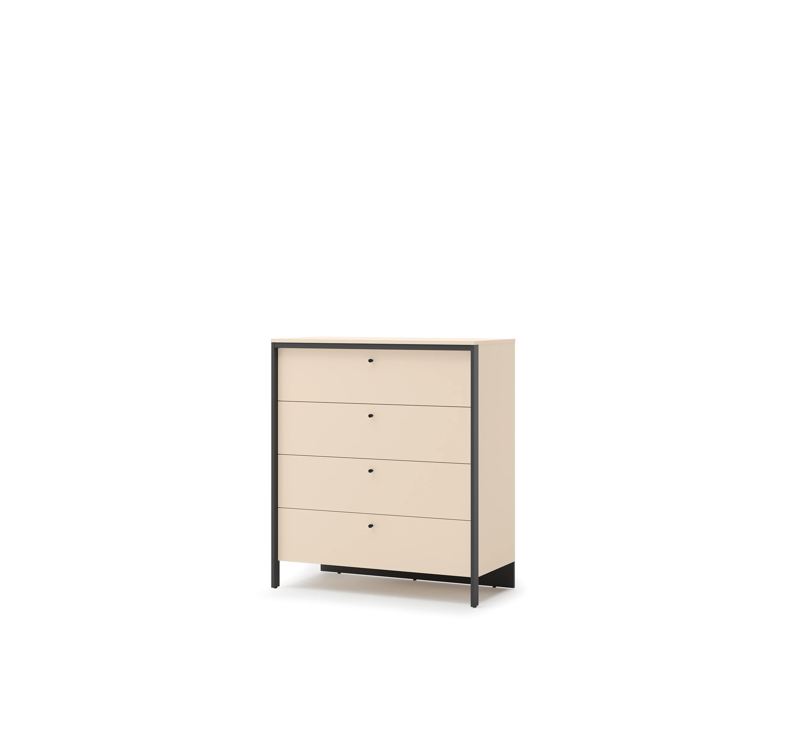 Model wyposażony jest w cztery pojemne szuflady z kulkowymi prowadnicami, które zapewniają płynne, ciche i wygodne użytkowanie. To idealne rozwiązanie do przechowywania ubrań, bielizny oraz innych niezbędnych akcesoriów.