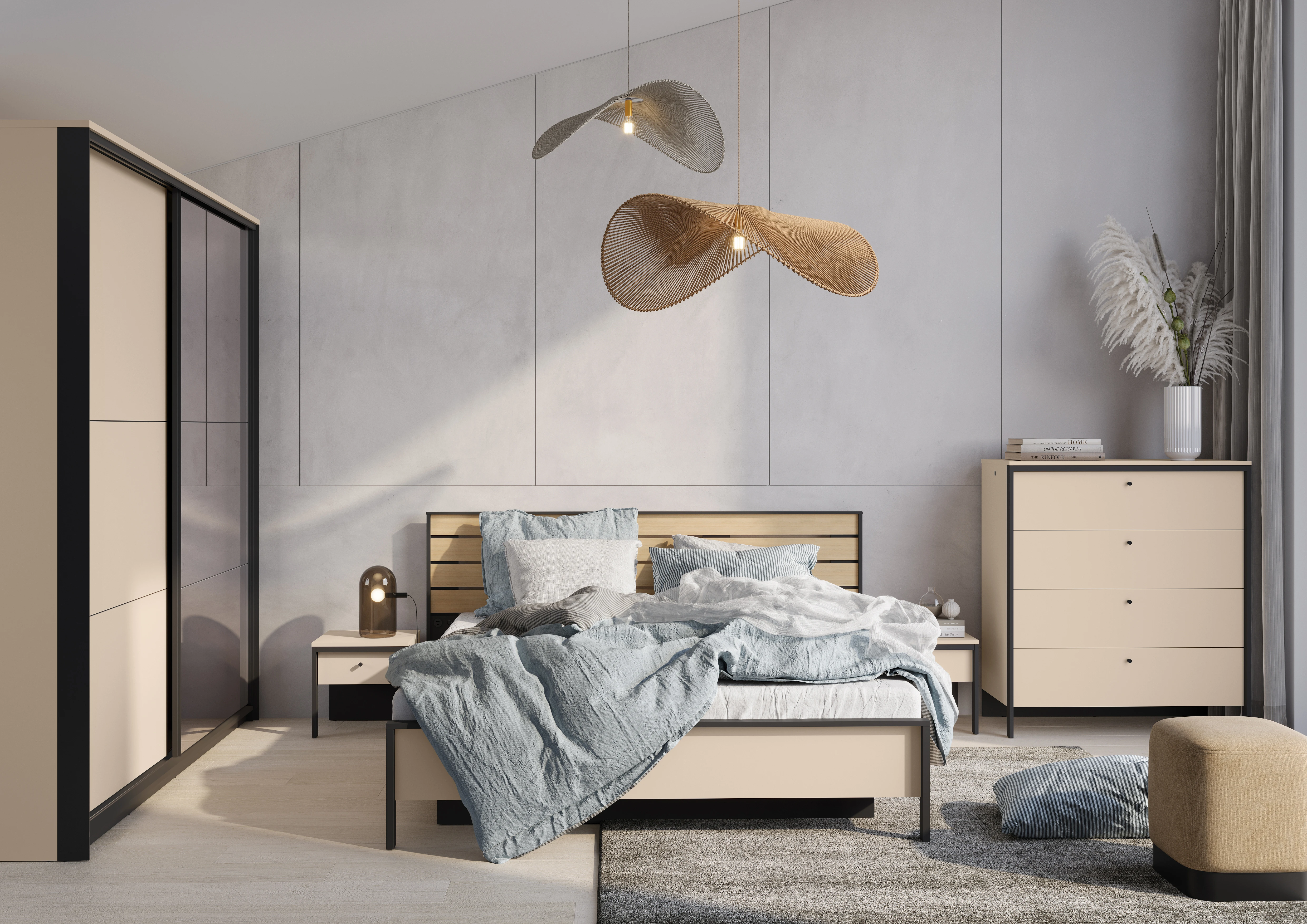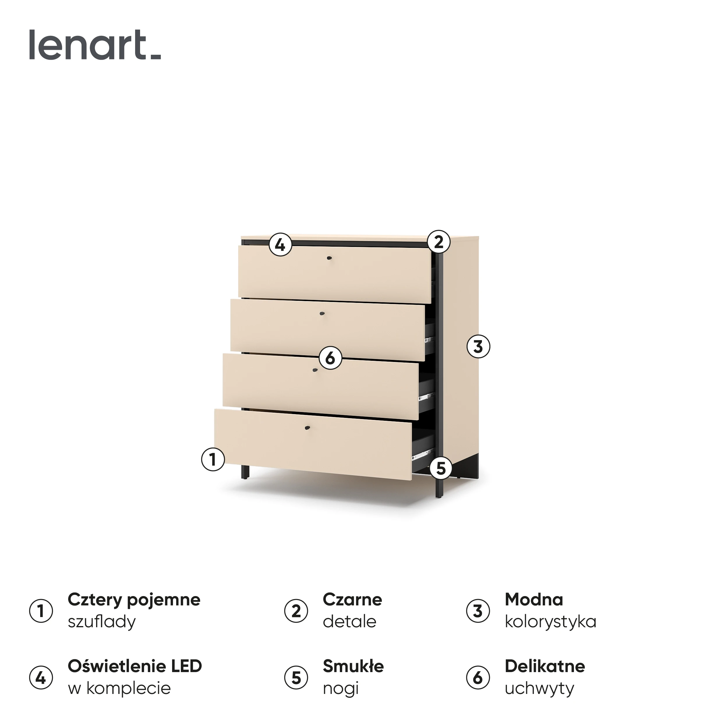 Komoda z szufladami EN-03 z kolekcji Enna marki Lenart to nowoczesna komoda do sypialni, która łączy elegancki design z wysoką funkcjonalnością. Dzięki przemyślanej konstrukcji i uniwersalnej kolorystyce beż/czarny mebel doskonale sprawdzi się zarówno w nowoczesnych, jak i klasycznych aranżacjach wnętrz.