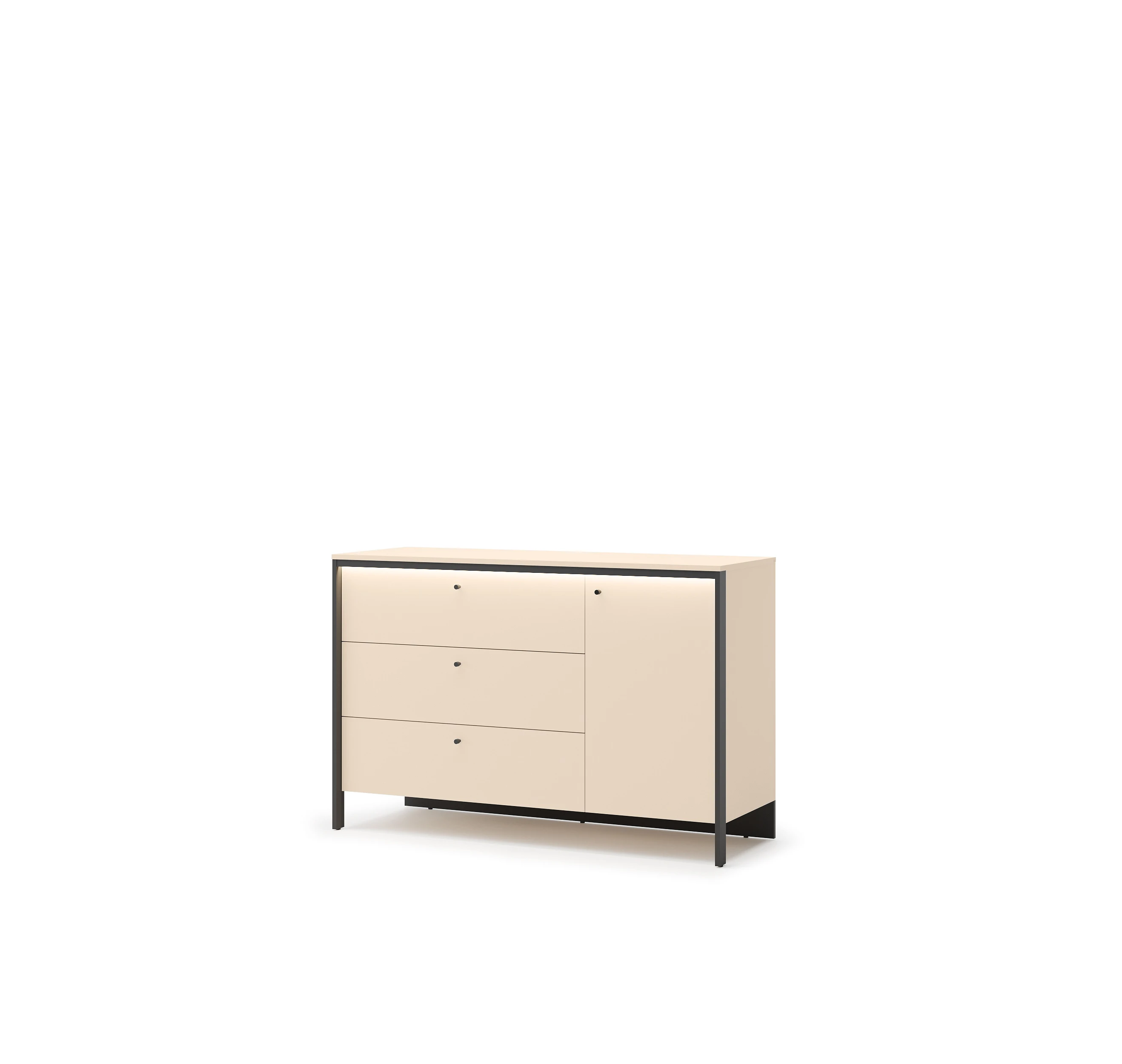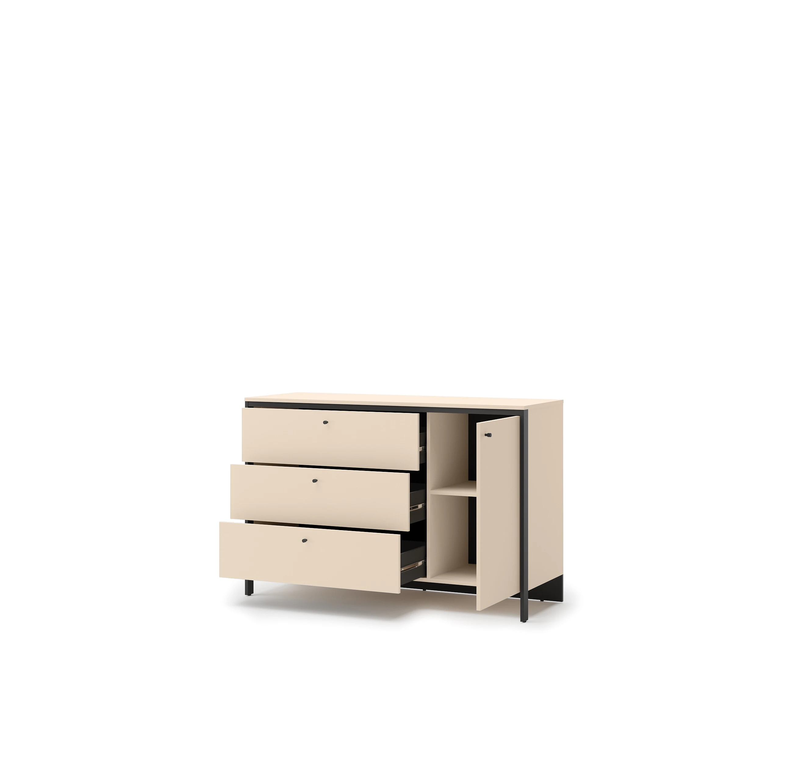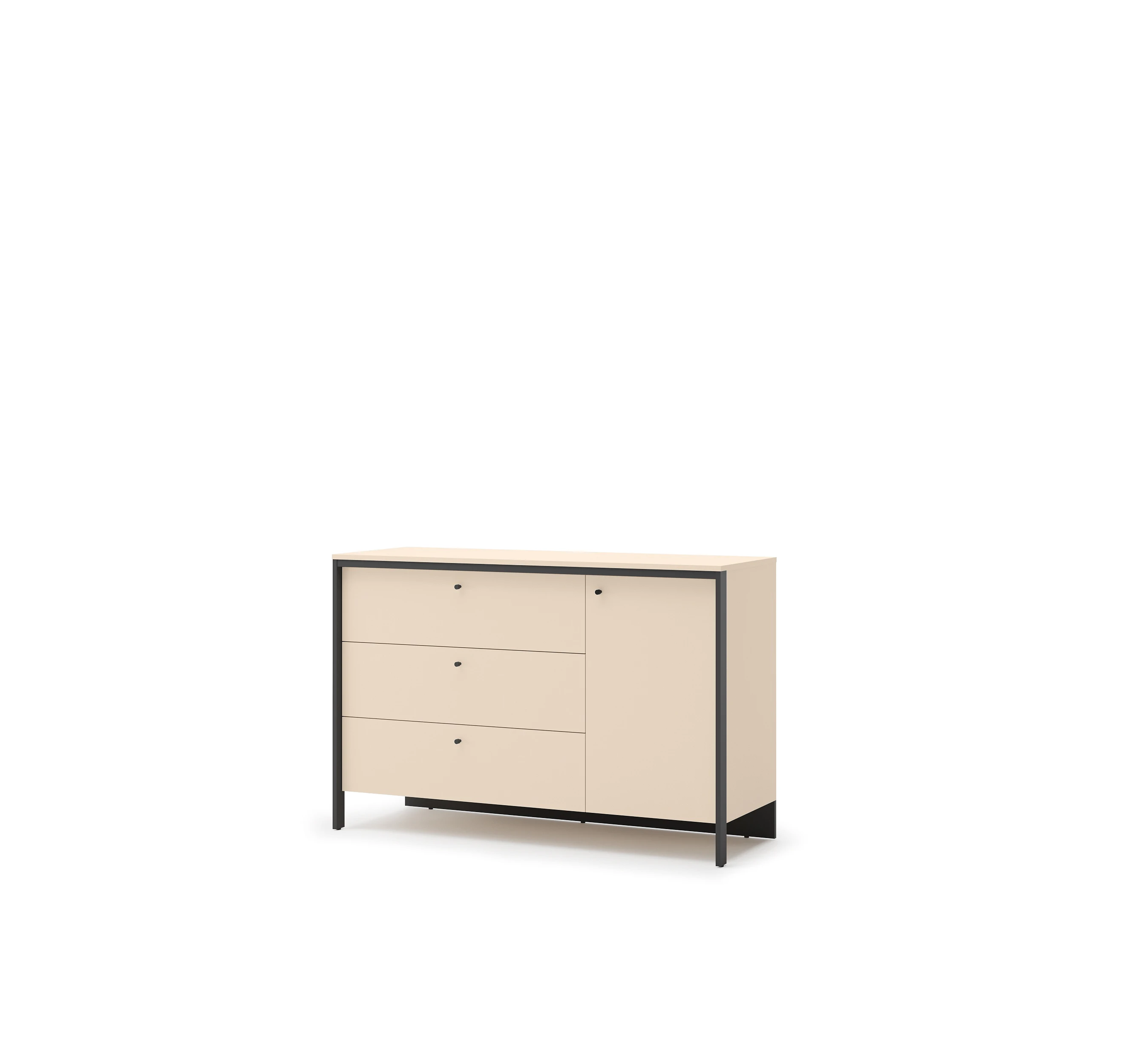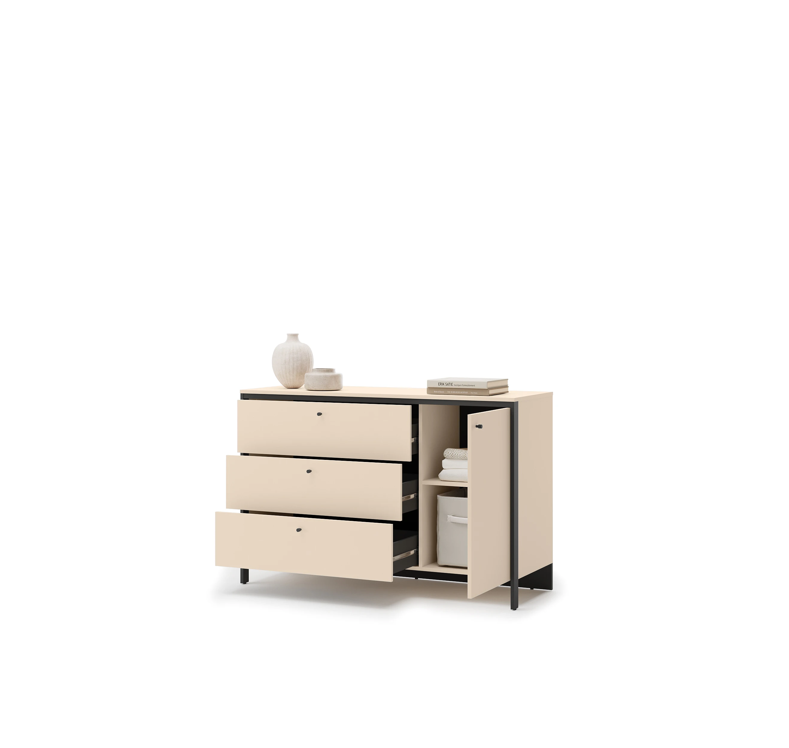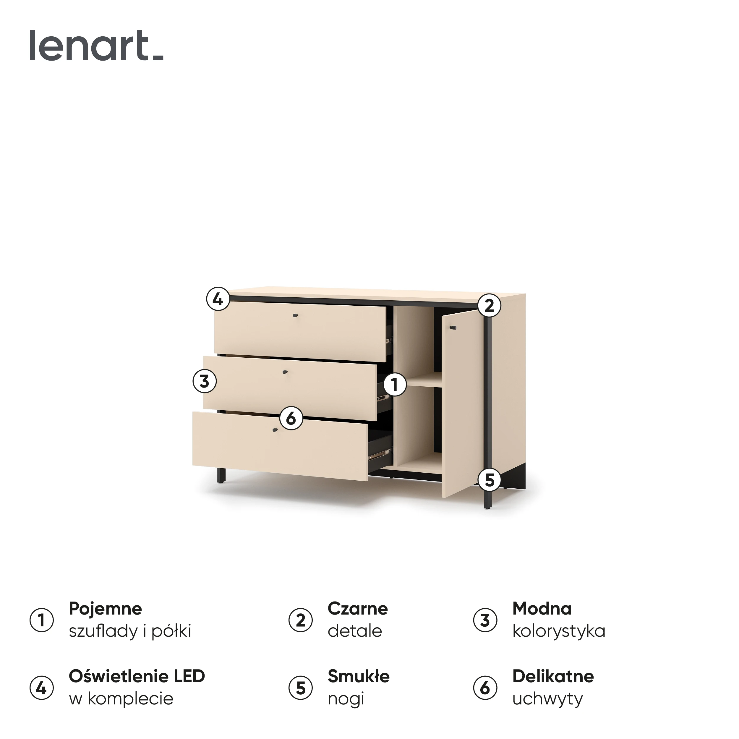 Komoda została wykonana z trwałej płyty laminowanej, odpornej na codzienne użytkowanie. Obrzeża ABS chronią krawędzie przed uszkodzeniami, a czarne detale i wykończenie wnętrza kontrastują z jasnymi frontami, tworząc nowoczesną i spójną całość.