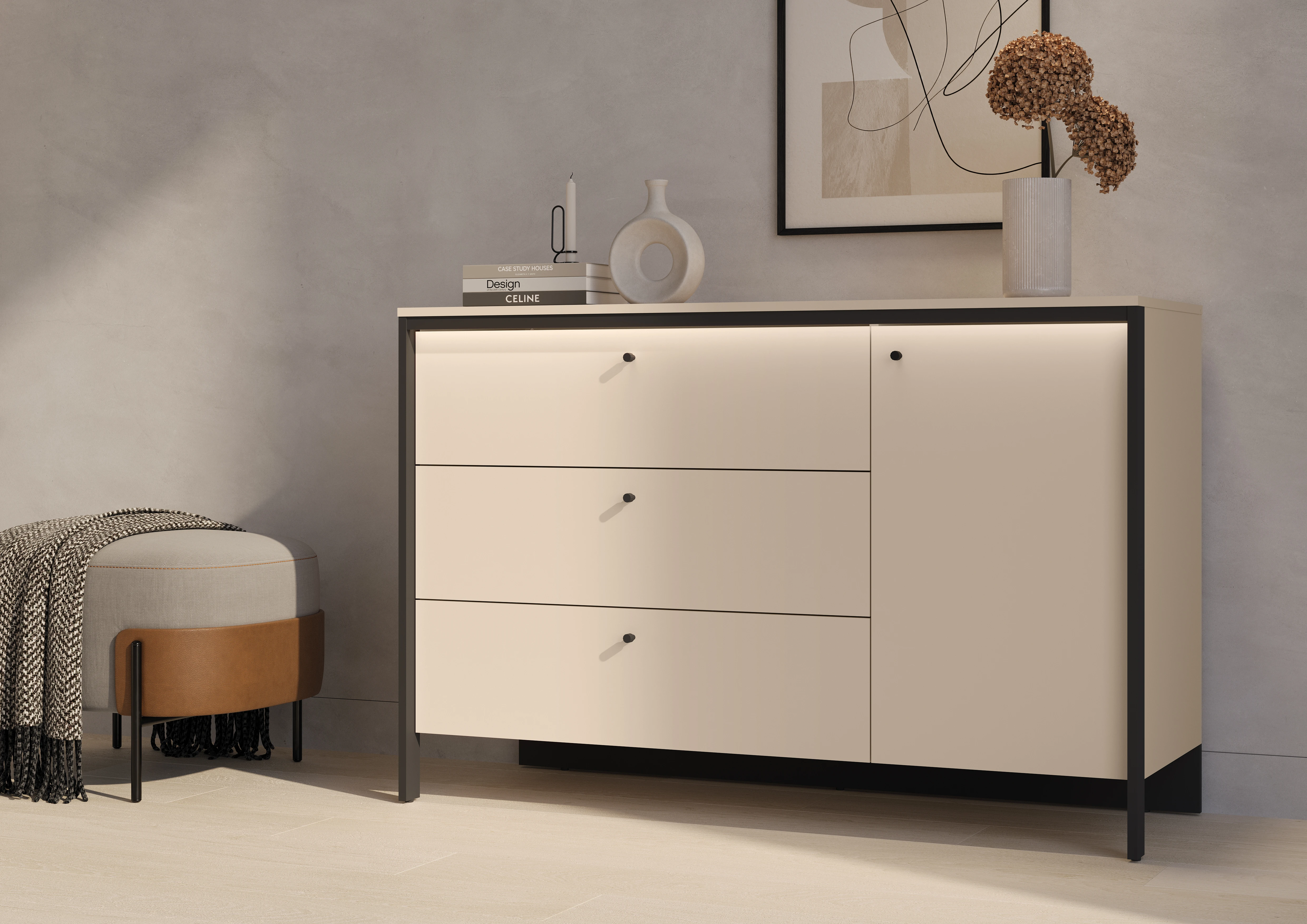 Nowoczesna kolorystyka beż/czarny w zestawieniu z metalowymi uchwytami oraz subtelnym oświetleniem LED nadaje meblowi elegancki i ponadczasowy charakter.