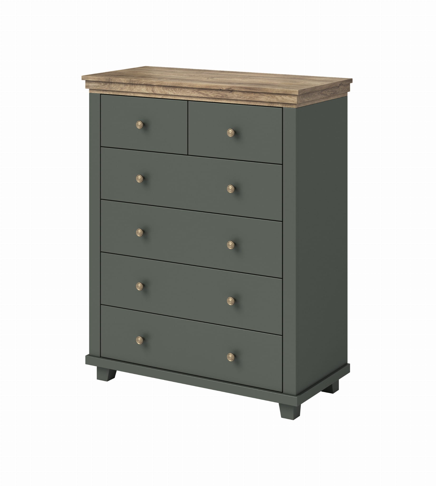 Wymiary 90 × 42 × 113 cm sprawiają, że jest to wysoka komoda z szufladami, która pozwala maksymalnie wykorzystać przestrzeń w pionie, nie zajmując przy tym zbyt dużo miejsca w pomieszczeniu. Modna kolorystyka zielony / Dąb Lefkas nadaje wnętrzu wyrazisty i stylowy charakter.