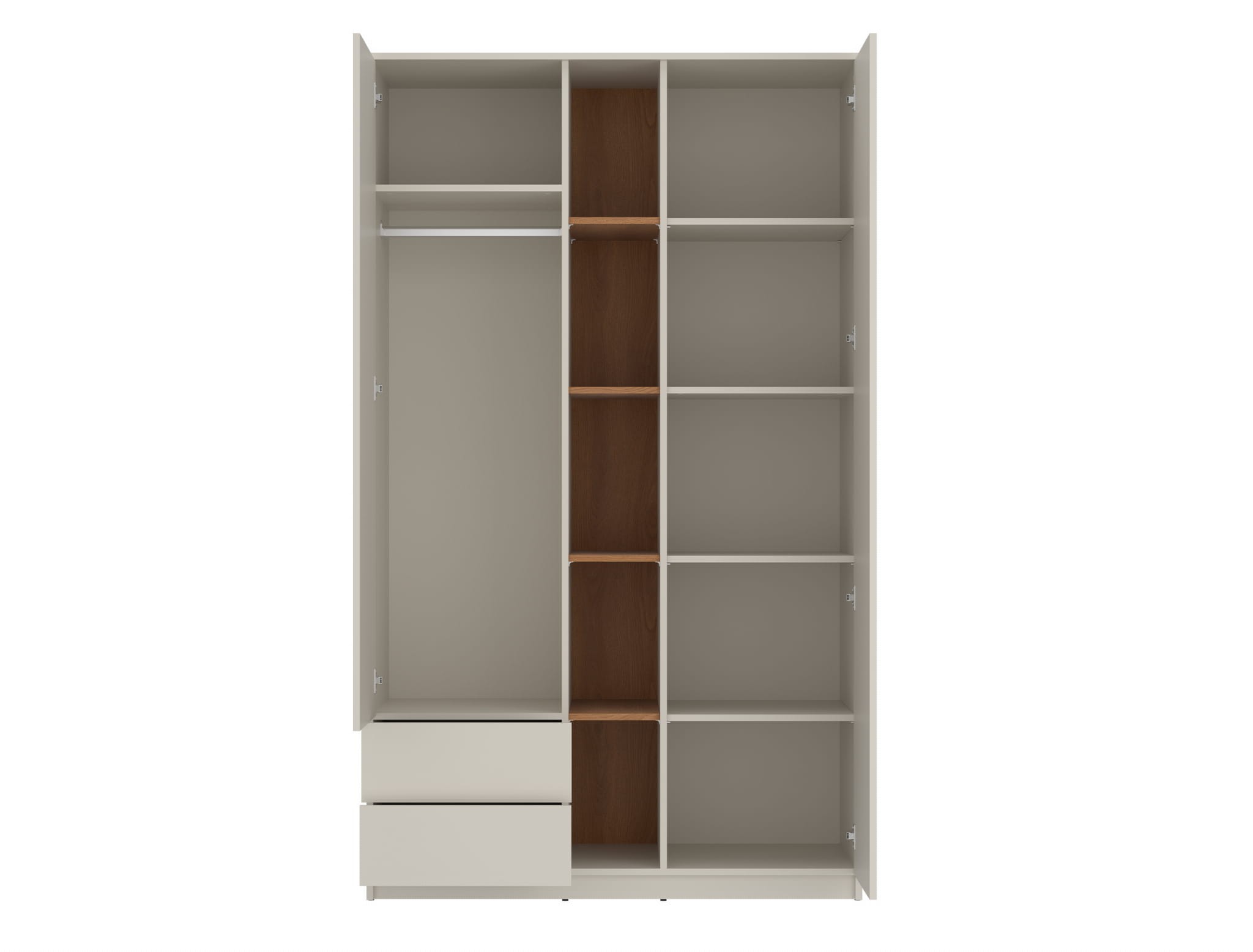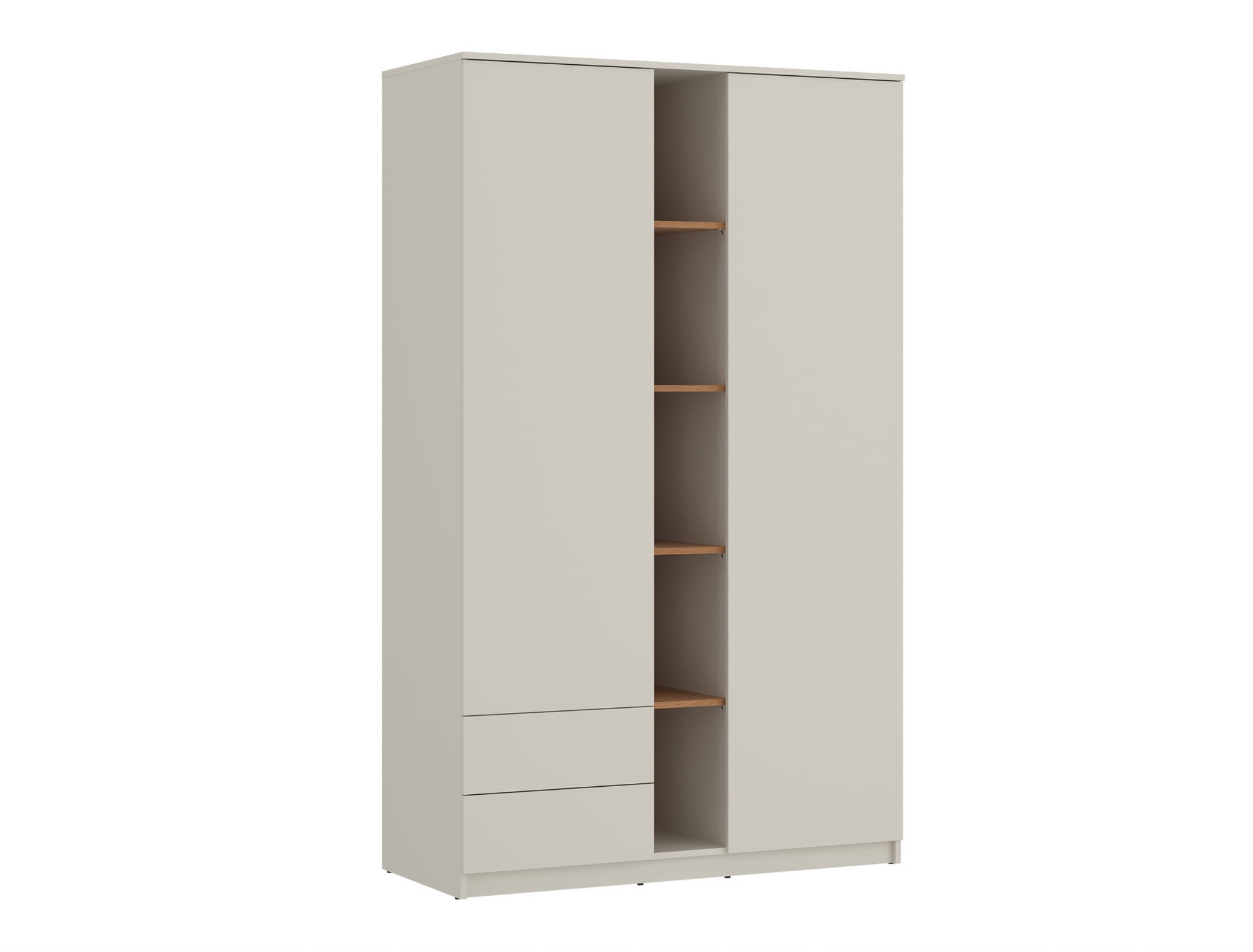 Szafę dwudrzwiową FANO wyróżnia nowoczesna, a zarazem wyjątkowo funkcjonalna stylistyka, zachwycająca designem i praktycznością codziennego zastosowania. Pojemna szafa w odcieniu Cashmere wykonana została w systemie bezuchwytowym, zapewniającym minimalistyczny efekt wizualny. Element w postaci otwartych półek w odcieniu Dąb Karmel dodaje bryle unikalnego charakteru, a jednocześnie zapewnia możliwość ekspozycji niewielkich przedmiotów dekoracyjnych. Szafa powstała z płyty wiórowej laminowanej. Szuflady mebla wyposażono w prowadnice kulkowe, zapewniające pełen wysuw. Za frontami drzwiowymi znajduje się drążek, pozwalający na zawieszenie odzieży na wieszakach oraz pojemne półki na odzież złożoną.