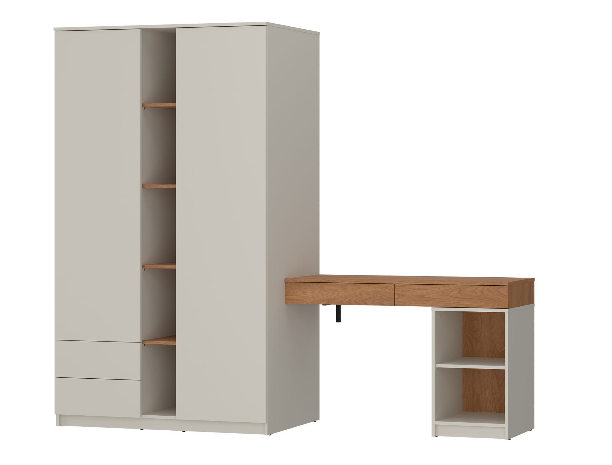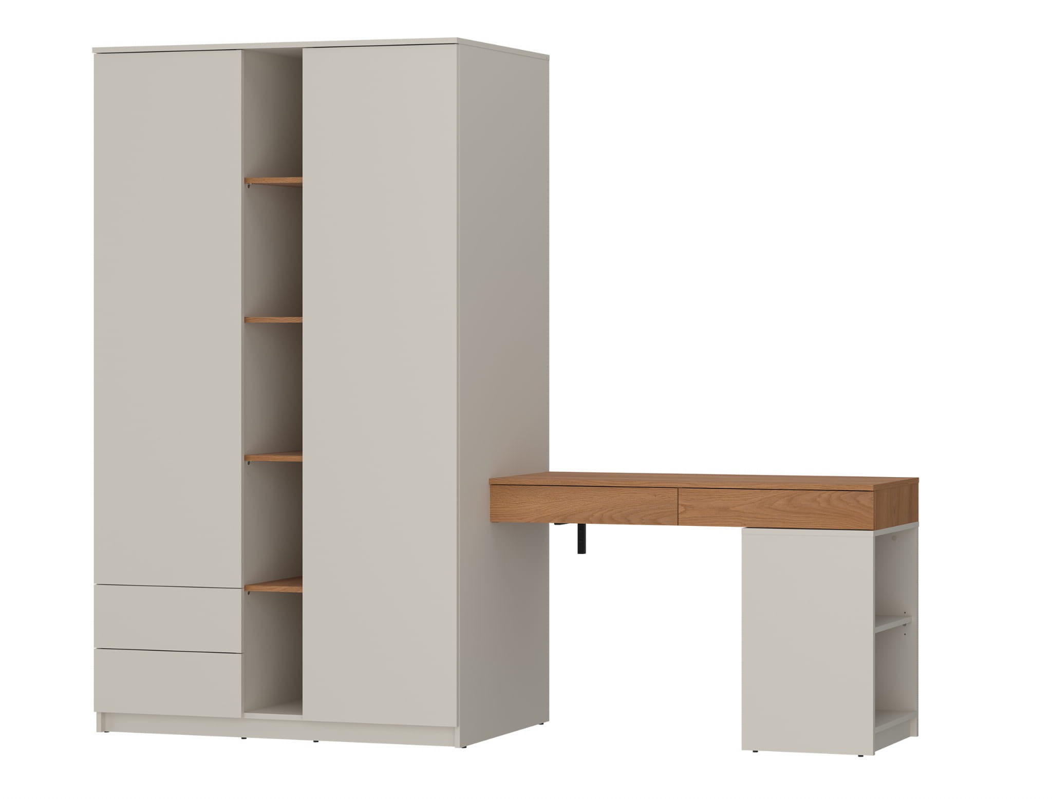 Stylowa, nowoczesna szafa FANO, dedykowana do pokoju młodzieżowego doskonale wkomponuje się zarówno w wystrój minimalistyczny, jak i vintage. Dzięki ponadczasowemu zestawieniu kaszmiru z karmelowym wybarwieniem dębu łatwo dopasować do niej dodatki kolorystyczne. Świetnie sprawdzają się pastelowe odcienie, zwłaszcza szarość i beż. Dobrze wygląda w towarzystwie elementów loftowych, takich jak cegła oraz czarne, metalowe dodatki.