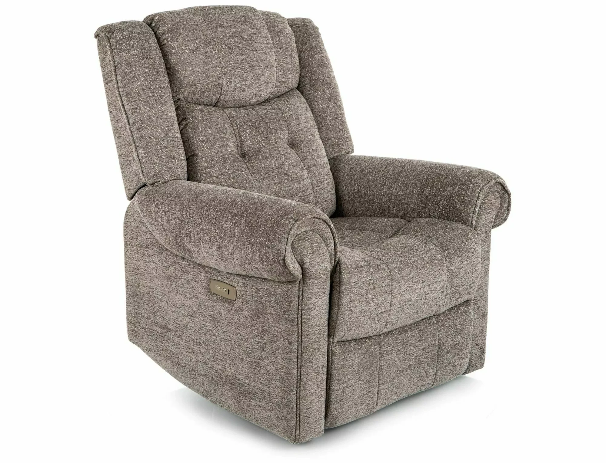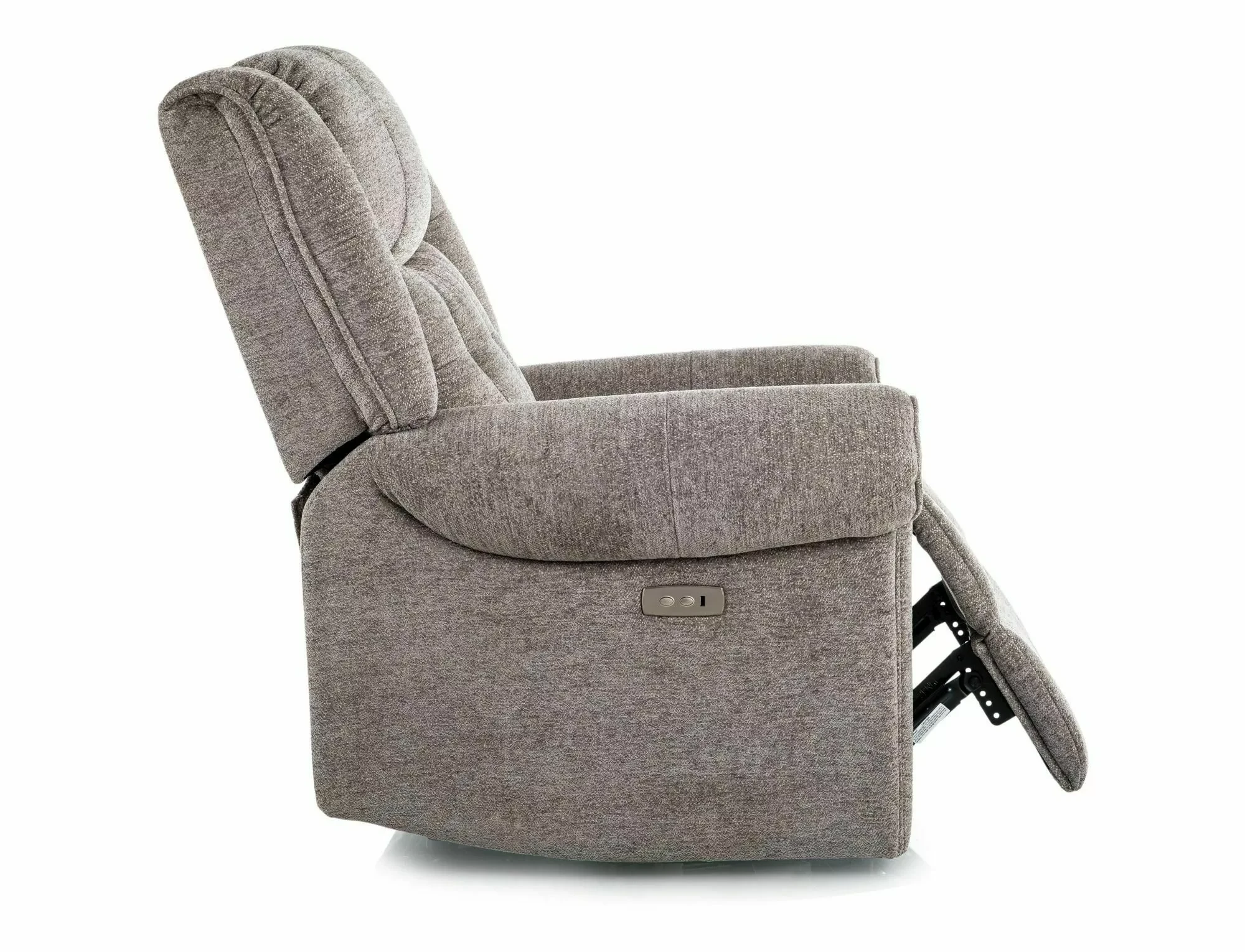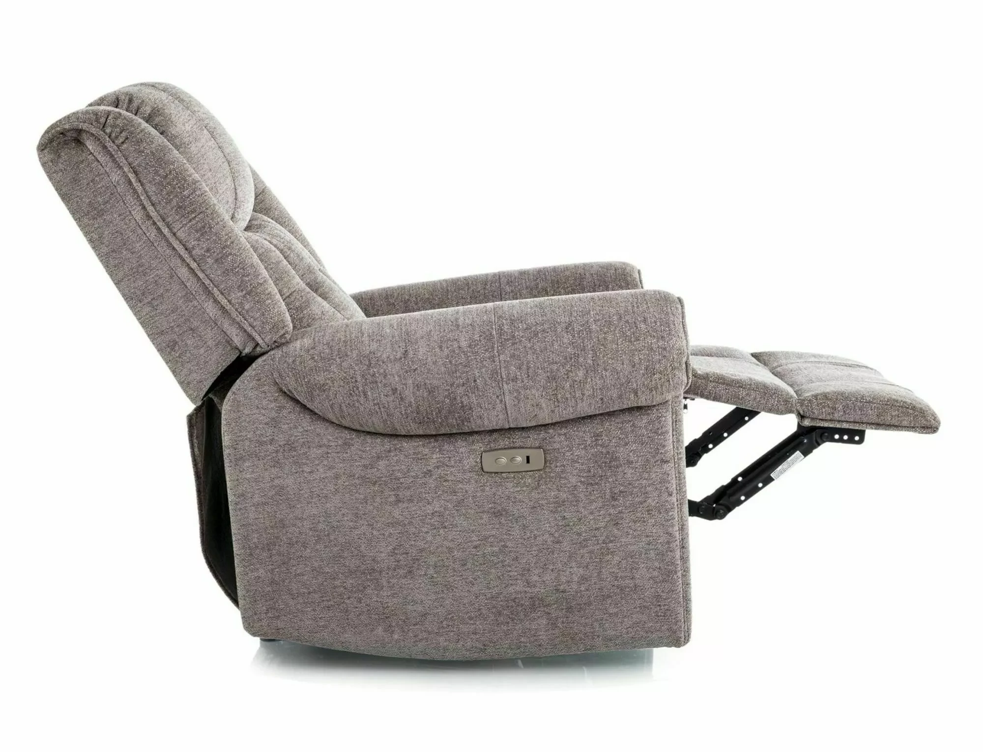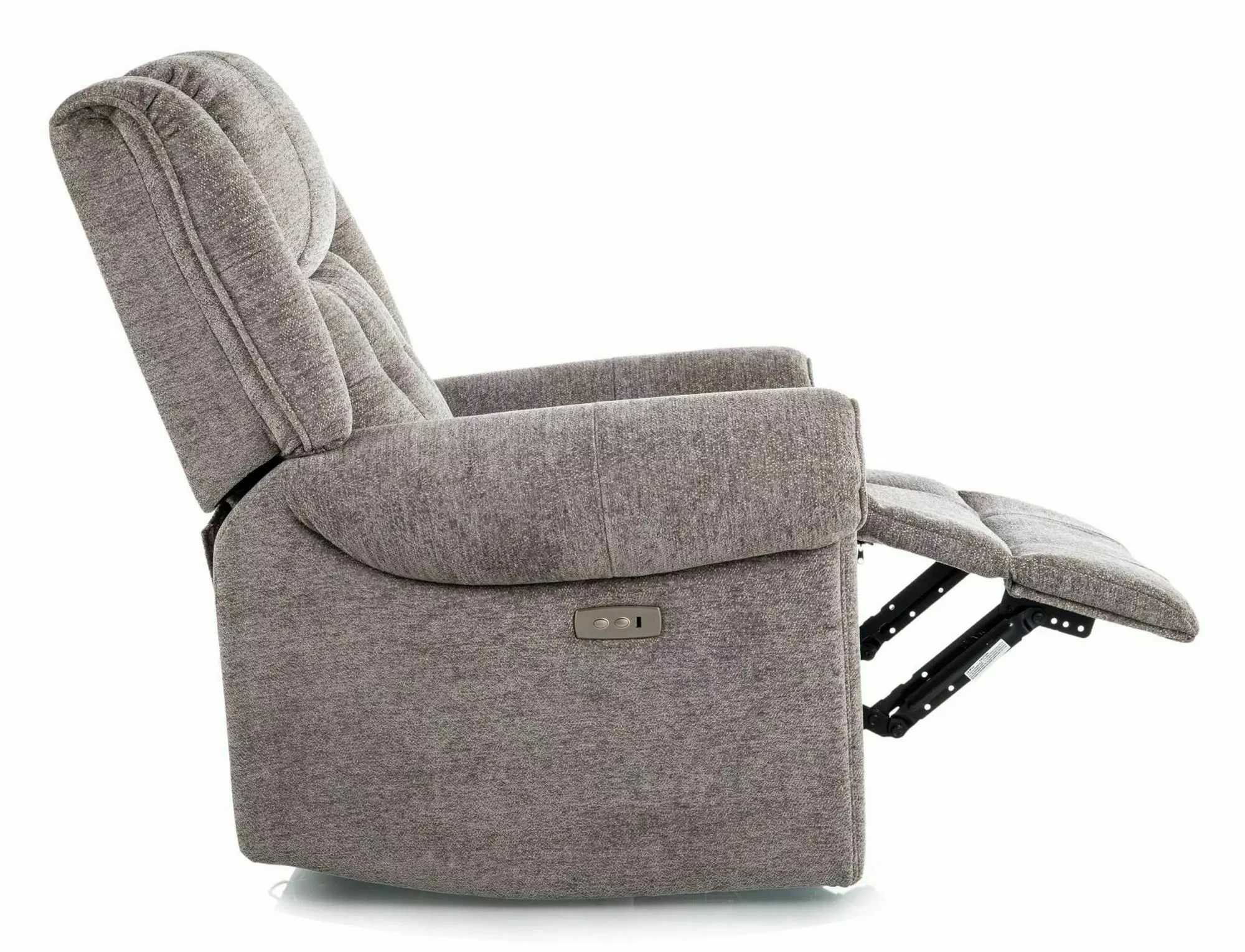 Fotel rozkładany elektrycznie, tkanina: Raven, kolor: szary 07. Port USB. Wymiary fotela: A - 110, B - 94, C - 47, D - 51, E - 94÷164 cm.