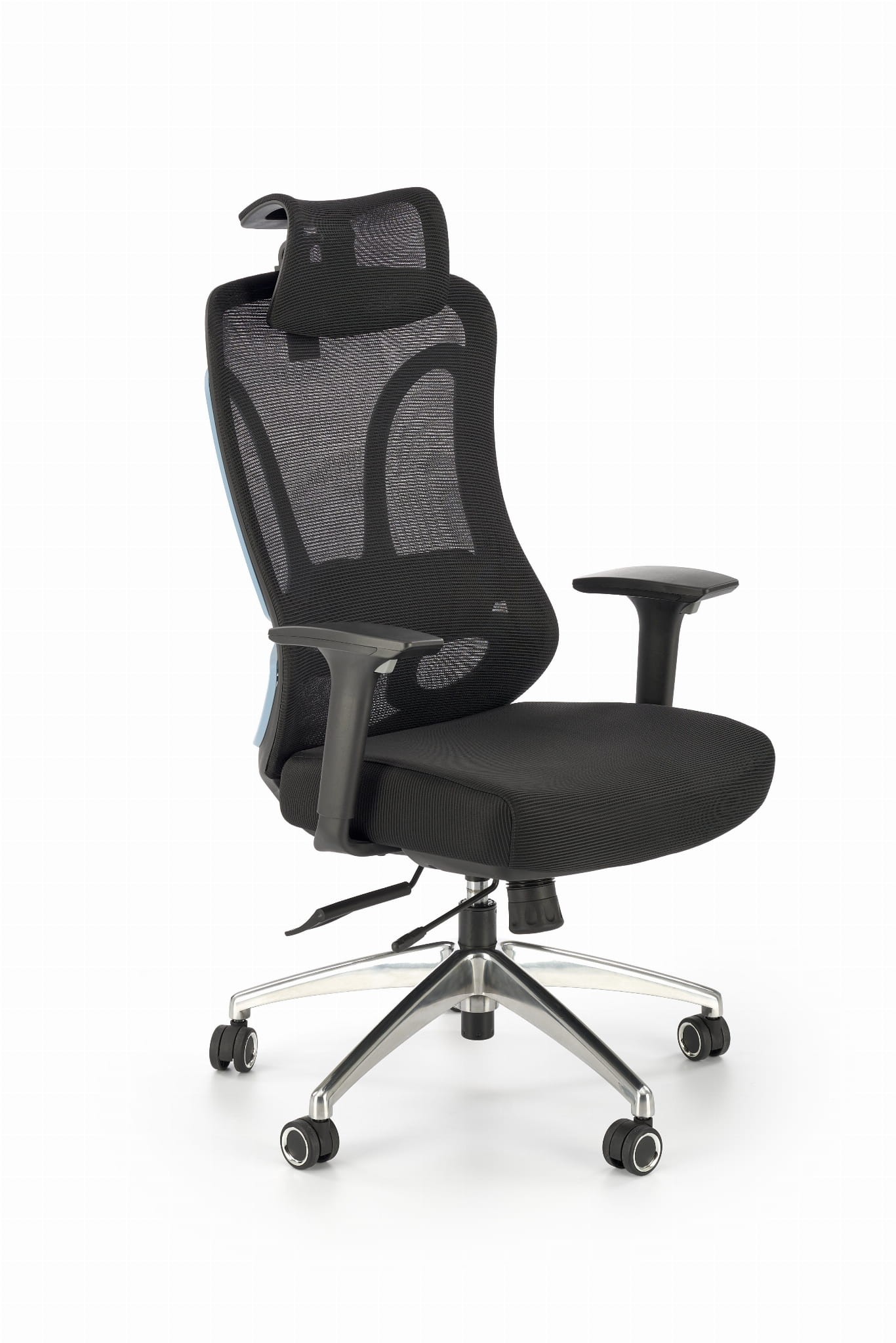 wymiary: 64/70/121-129/45-53 cm, mechanizm synchroniczny / regulowany zagłówek / regulowane podłokietniki / regulowany punkt podparcia pleców / wysuwane siedzisko / aluminiowa podstawa, tkanina membranowa / siatka, kolor: czarny