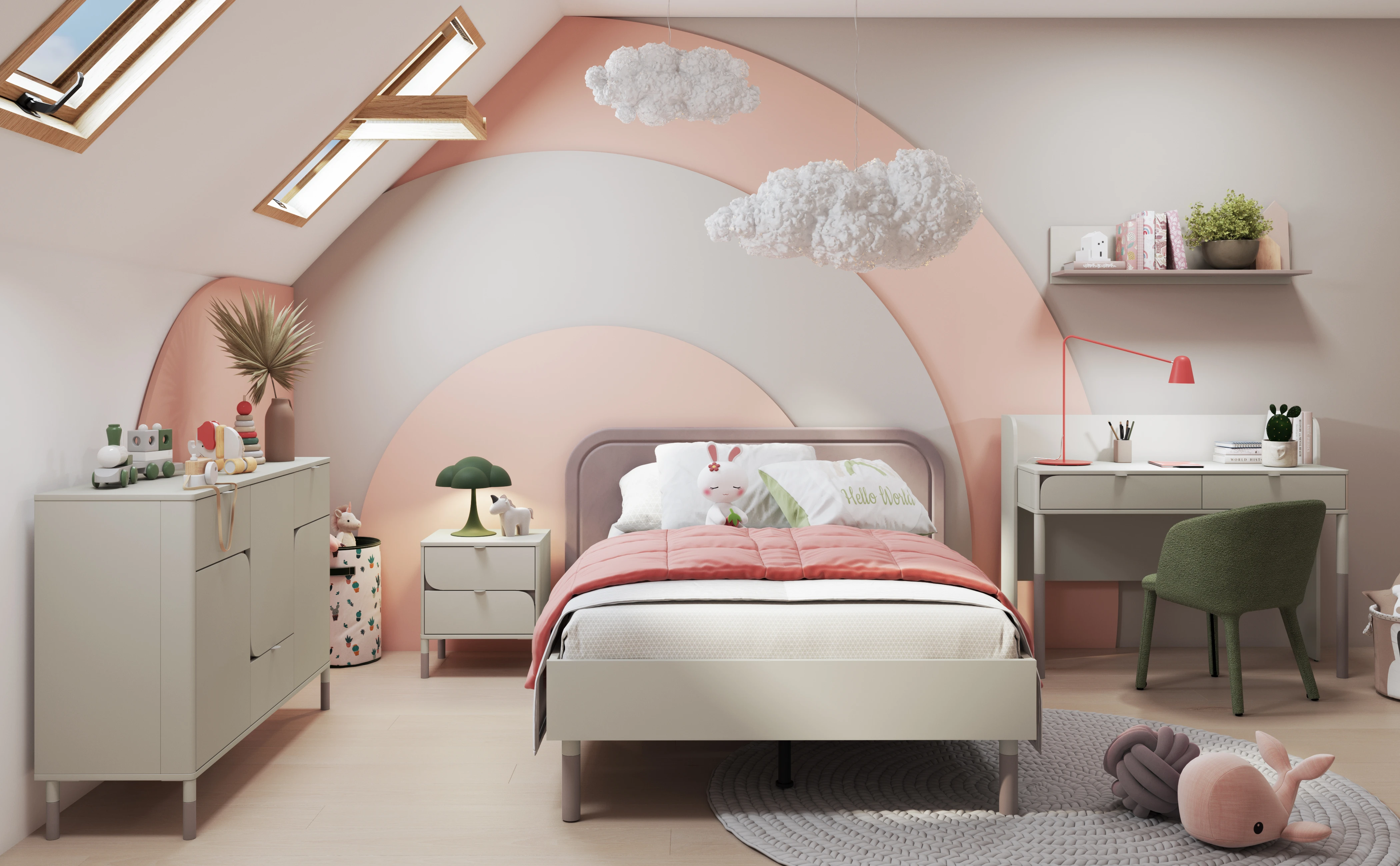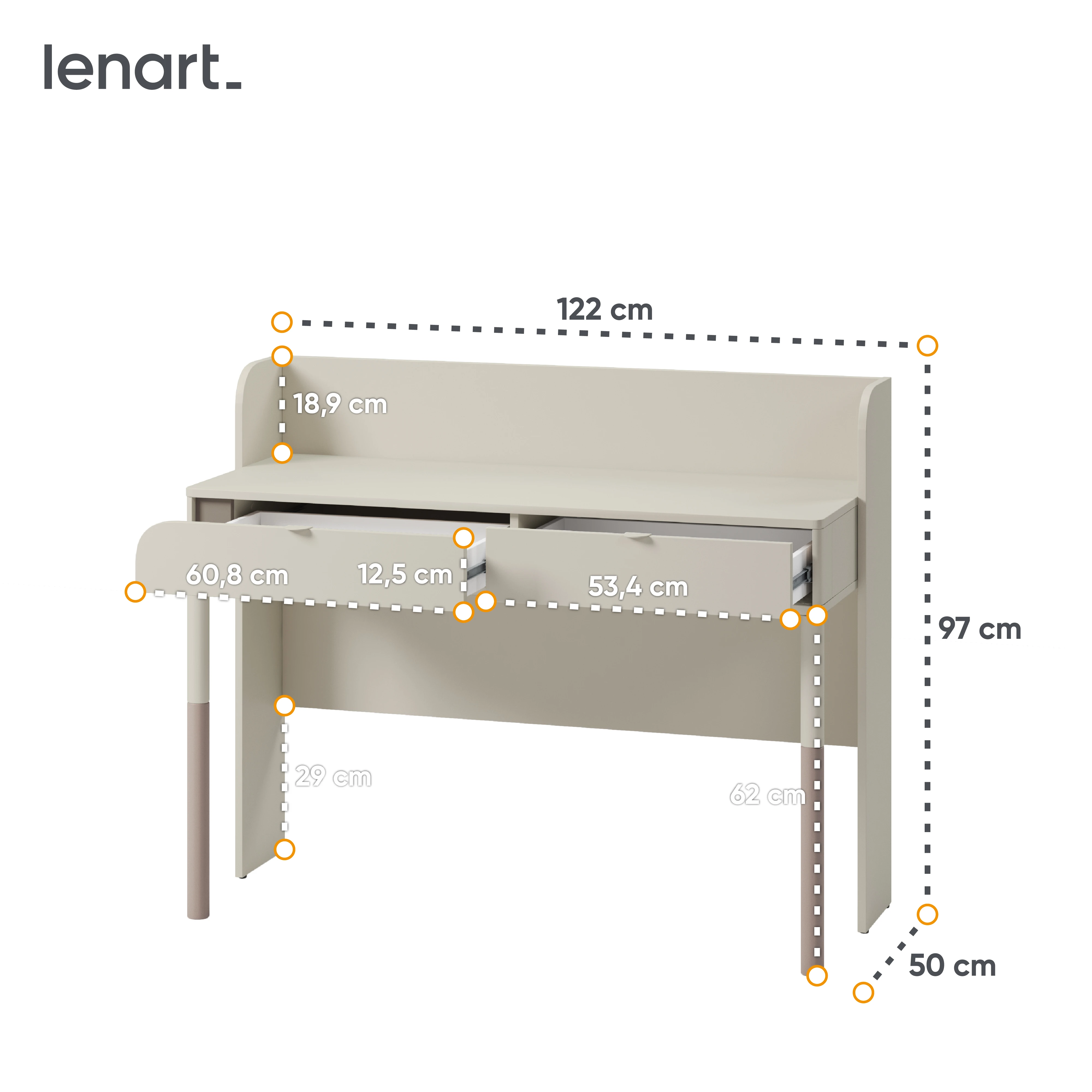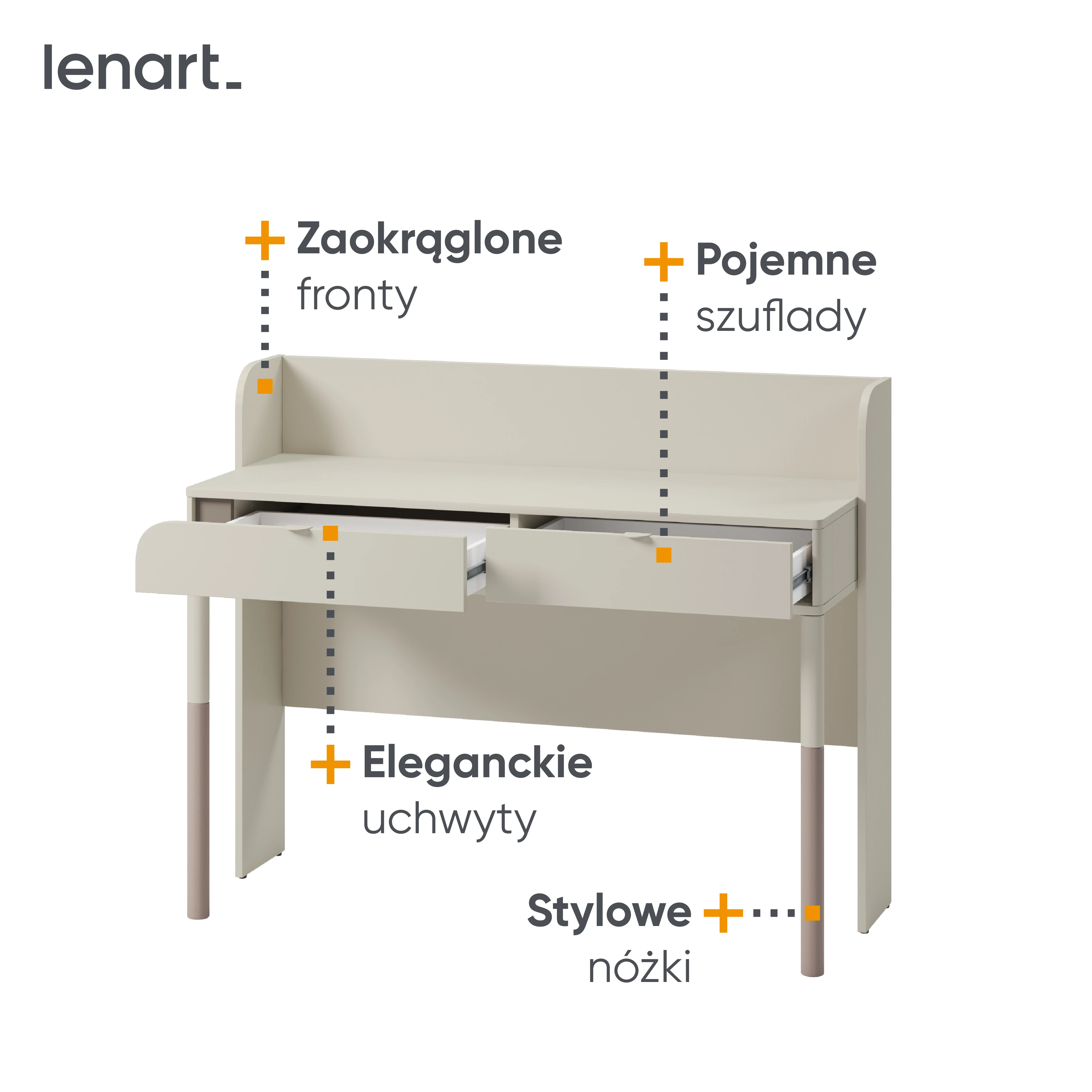 Biurko wyróżnia się eleganckim wykończeniem w kolorach kaszmir i trufla, które wprowadzają do wnętrza spokój i harmonię. Minimalistyczna forma sprawia, że mebel doskonale pasuje zarówno do nowoczesnych, jak i bardziej klasycznych aranżacji pokoju dziecięcego lub młodzieżowego.
