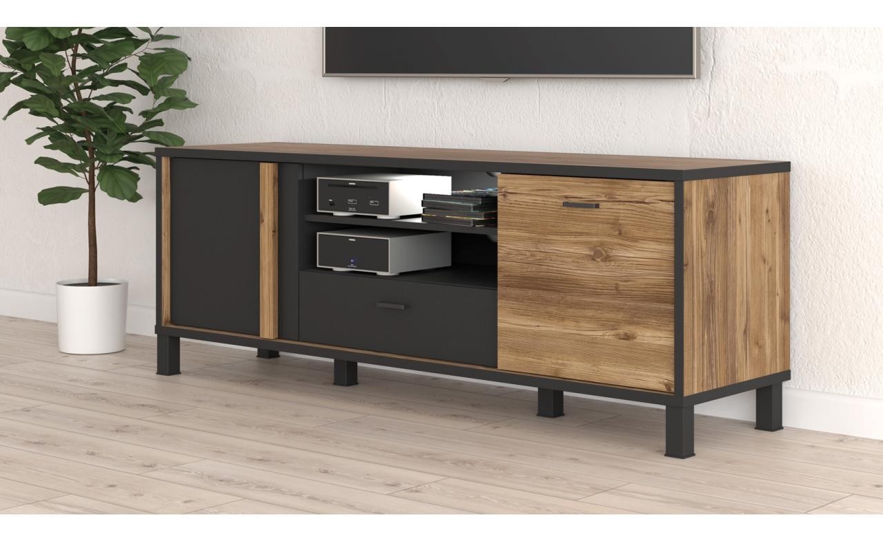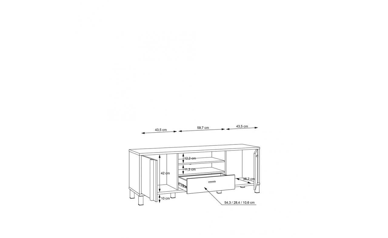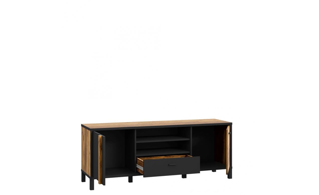 Szafka RTV HYTT231R o szerokości 155 cm wyposażona został w dwa fronty oraz praktyczną szufladę.