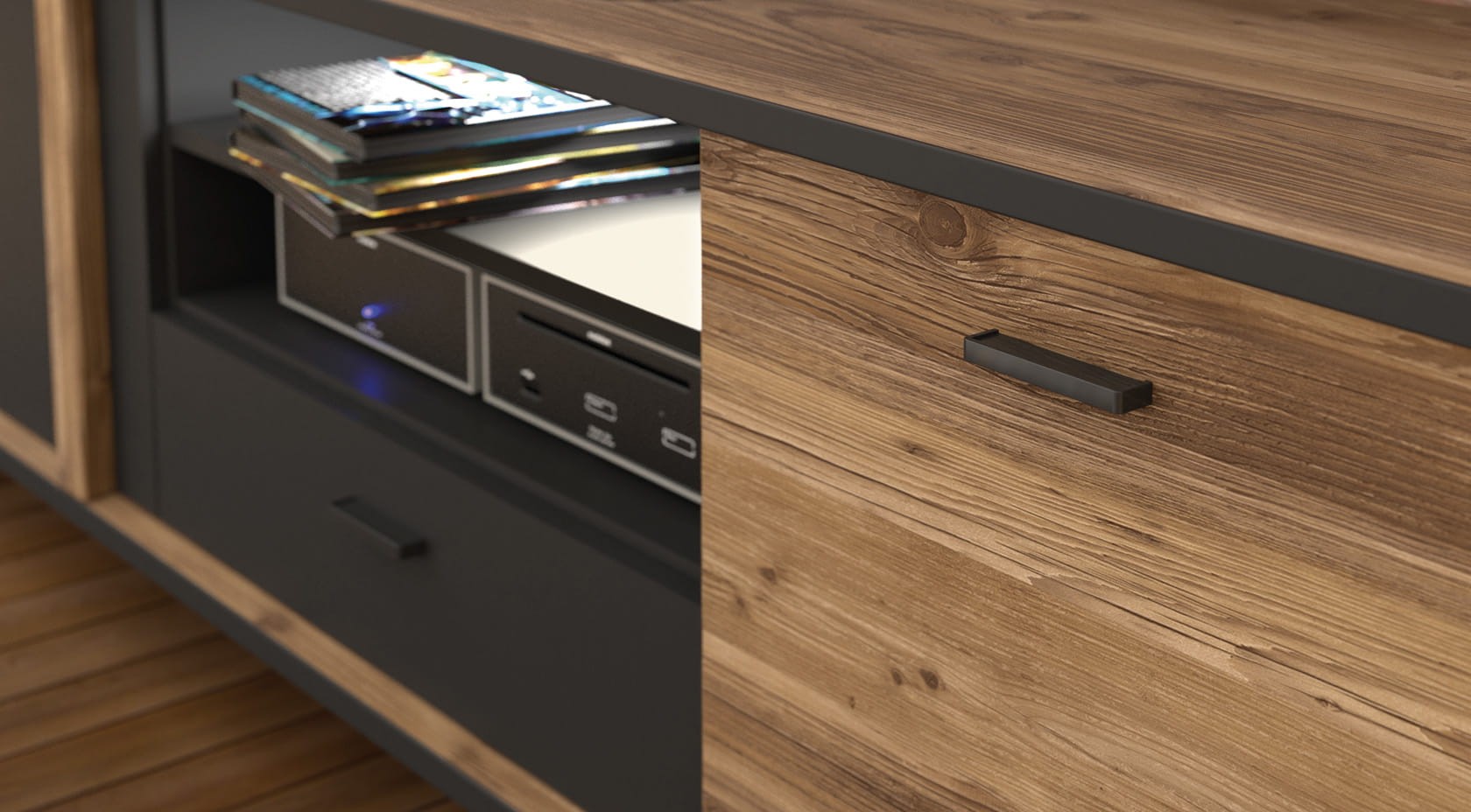 Kolekcja HAYATO dzięki połączeniu wyraźnego usłojenia drewna oraz głębokiej czerni tworzy niepowtarzalny charakter. Świerk alpejski zastosowany na korpusie i frontach mebla idealnie odzwierciedla prawdziwą starą deskę. Takie zestawienie kolorystyczne doskonale odnajdzie się w industrialnym lofcie, wnętrzu urządzonym w duchu japońskiego minimalizmu, a także klasycznej przestrzeni. Długi pionowy uchwyt jest nie tylko bardzo praktyczny ale też jest elementem dekoracyjnym. Krawędzie grubych korpusów i blatów oklejone zostały czarną okleiną podkreślającą obrys mebla. Wyższe, czarne metalowe nogi nadają kolekcji Hayato nieco lekkości.