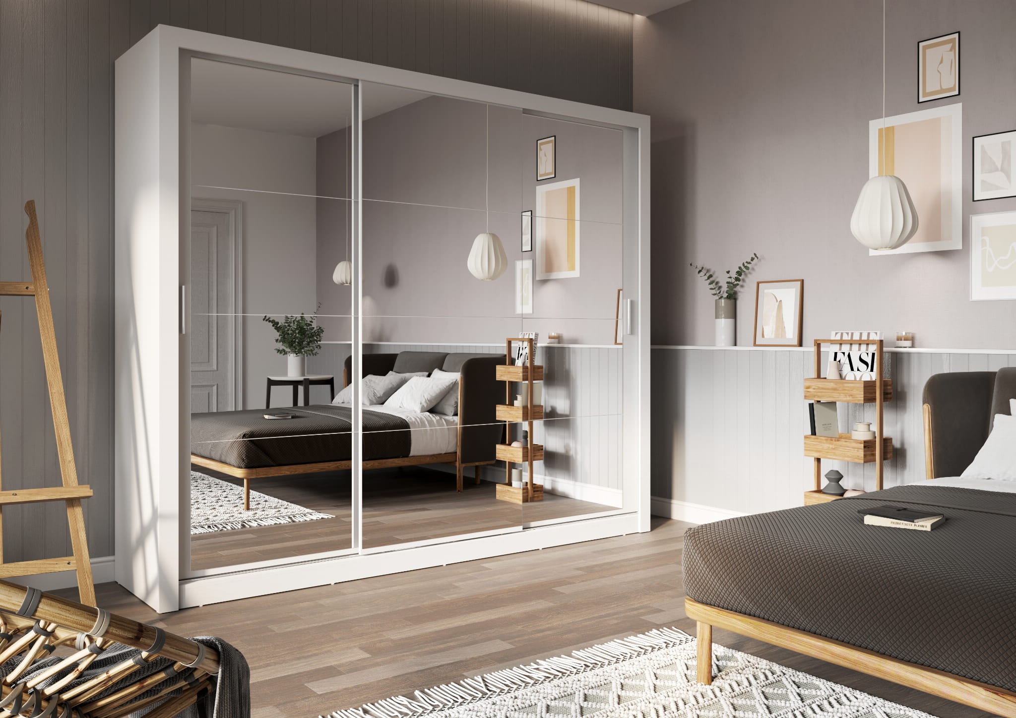 Bardzo pojemna, nowoczesna szafa z trojgiem drzwi przesuwnych, które świetnie oszczędzają przestrzeń. Idealna do sypialni, garderoby lub przedpokoju. Modny, a jednocześnie uniwersalny design to zasługa prostej formy oraz sprawdzonych wybarwień, w jakich dostępna jest szafa. Na każdym froncie znajduje się wielkie lustro, które optycznie powiększa przestrzeń i pozytywnie wpływa na komfort korzystania z szafy. Wnętrze szafy kryje dwa drążki na wieszaki oraz wewnętrzny regał z pojemnymi półkami. Na obszernych, górnych półkach z powodzeniem zmieszczą się rzadziej używane rzeczy lub walizki. Symetryczny układ mebla pozwala sprawiedliwie podzielić się miejscem z partnerem lub partnerką.
