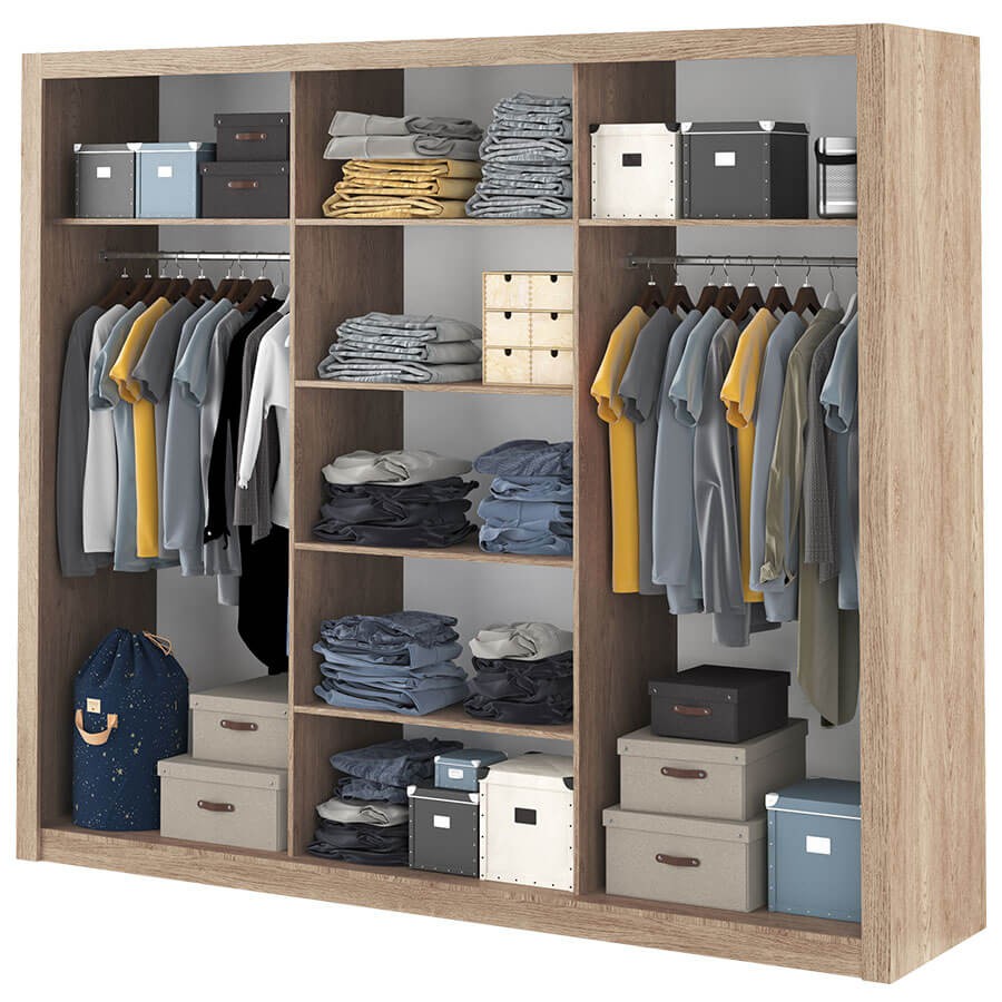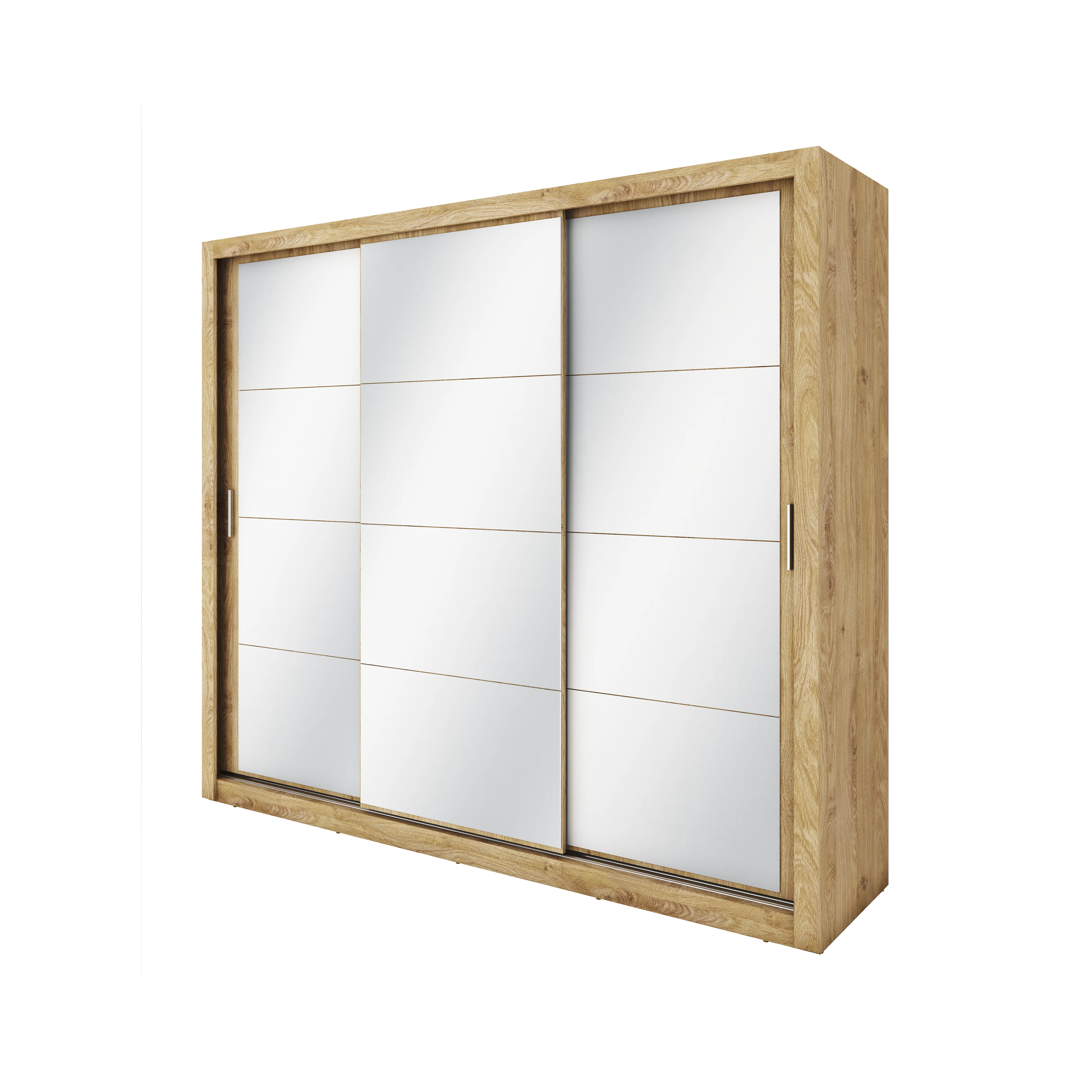 Bardzo pojemna, nowoczesna szafa z trojgiem drzwi przesuwnych, które świetnie oszczędzają przestrzeń. Idealna do sypialni, garderoby lub przedpokoju. Modny, a jednocześnie uniwersalny design to zasługa prostej formy oraz sprawdzonych wybarwień, w jakich dostępna jest szafa. Na każdym froncie znajduje się wielkie lustro, które optycznie powiększa przestrzeń i pozytywnie wpływa na komfort korzystania z szafy. Wnętrze szafy kryje dwa drążki na wieszaki oraz wewnętrzny regał z pojemnymi półkami. Na obszernych, górnych półkach z powodzeniem zmieszczą się rzadziej używane rzeczy lub walizki. Symetryczny układ mebla pozwala sprawiedliwie podzielić się miejscem z partnerem lub partnerką.