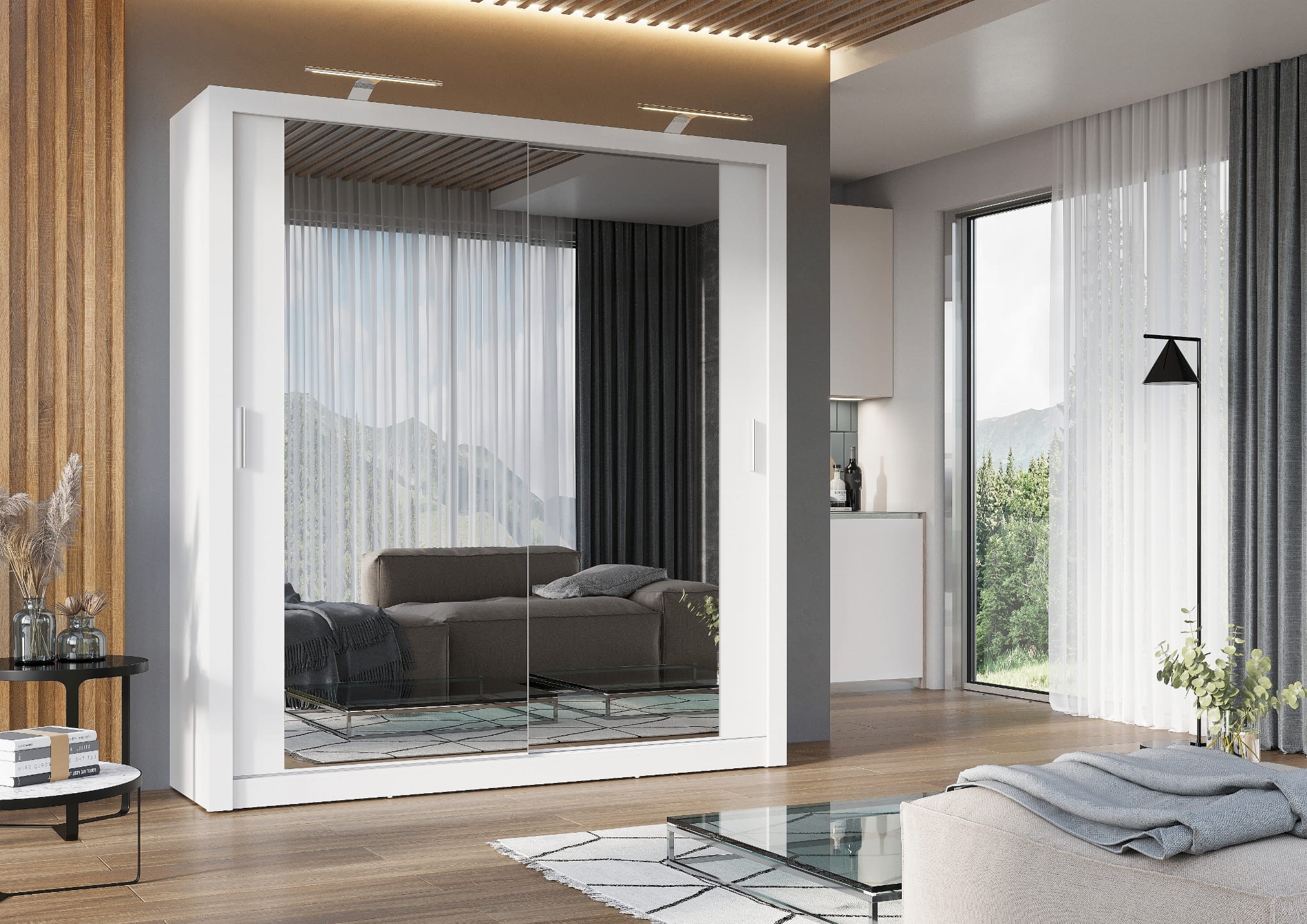 Niezwykle pojemna szafa przesuwna w nowoczesnym stylu. Idealnie sprawdzi się nie tylko w sypialni, ale również w garderobie, przedpokoju lub pokoju nastolatki/nastolatka. Jej niewątpliwą zaletą jest duże lustro na obu frontach, które optycznie powiększa przestrzeń i wprowadza więcej światła. Wnętrze szafy oczaruje Cię przyjaznym i funkcjonalnym układem - znajdziesz tam drążek na wieszaki oraz wewnętrzny regał z półkami. Idealne miejsce na ubrania i nie tylko!