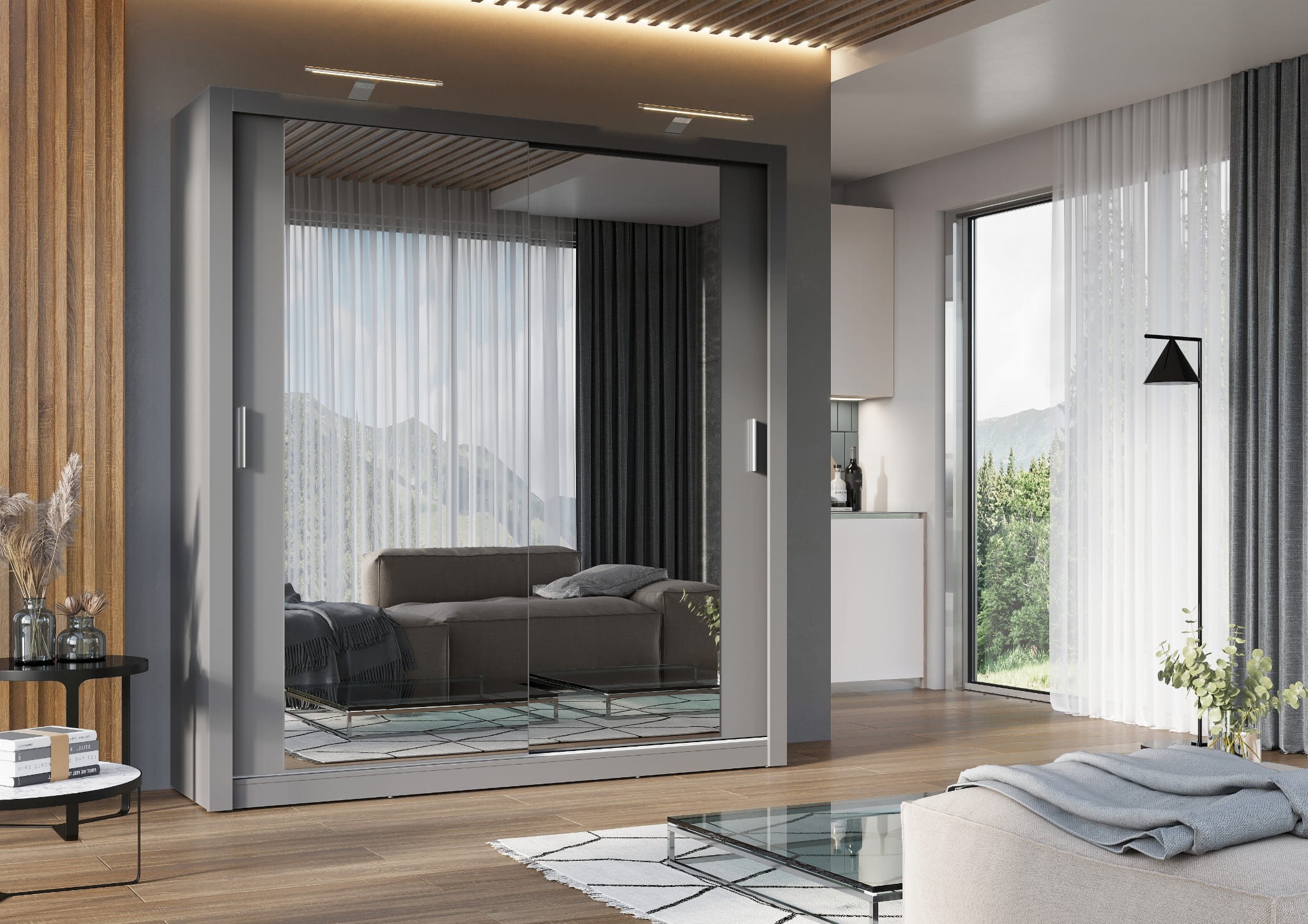 Niezwykle pojemna szafa przesuwna w nowoczesnym stylu. Idealnie sprawdzi się nie tylko w sypialni, ale również w garderobie, przedpokoju lub pokoju nastolatki/nastolatka. Jej niewątpliwą zaletą jest duże lustro na obu frontach, które optycznie powiększa przestrzeń i wprowadza więcej światła. Wnętrze szafy oczaruje Cię przyjaznym i funkcjonalnym układem - znajdziesz tam drążek na wieszaki oraz wewnętrzny regał z półkami. Idealne miejsce na ubrania i nie tylko!