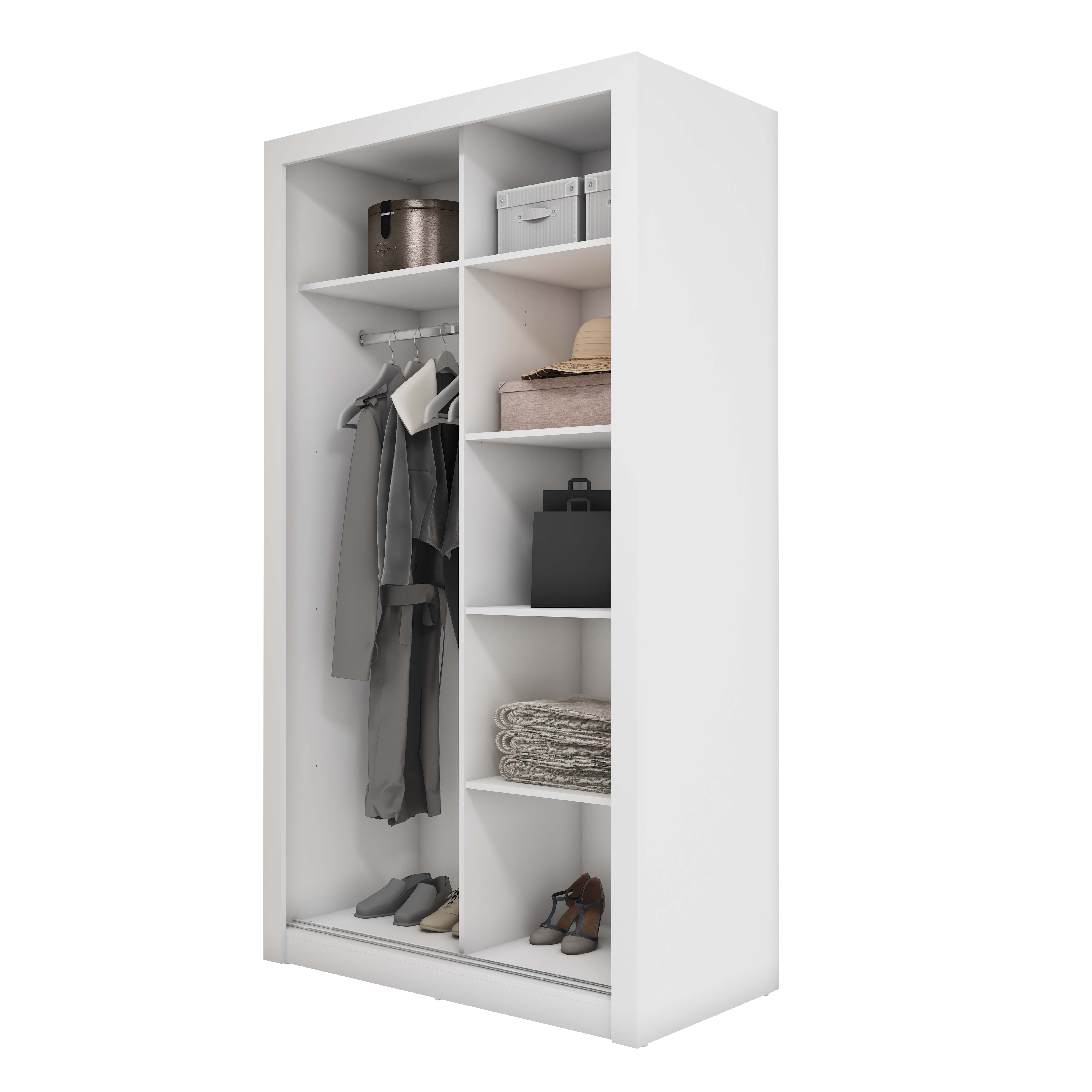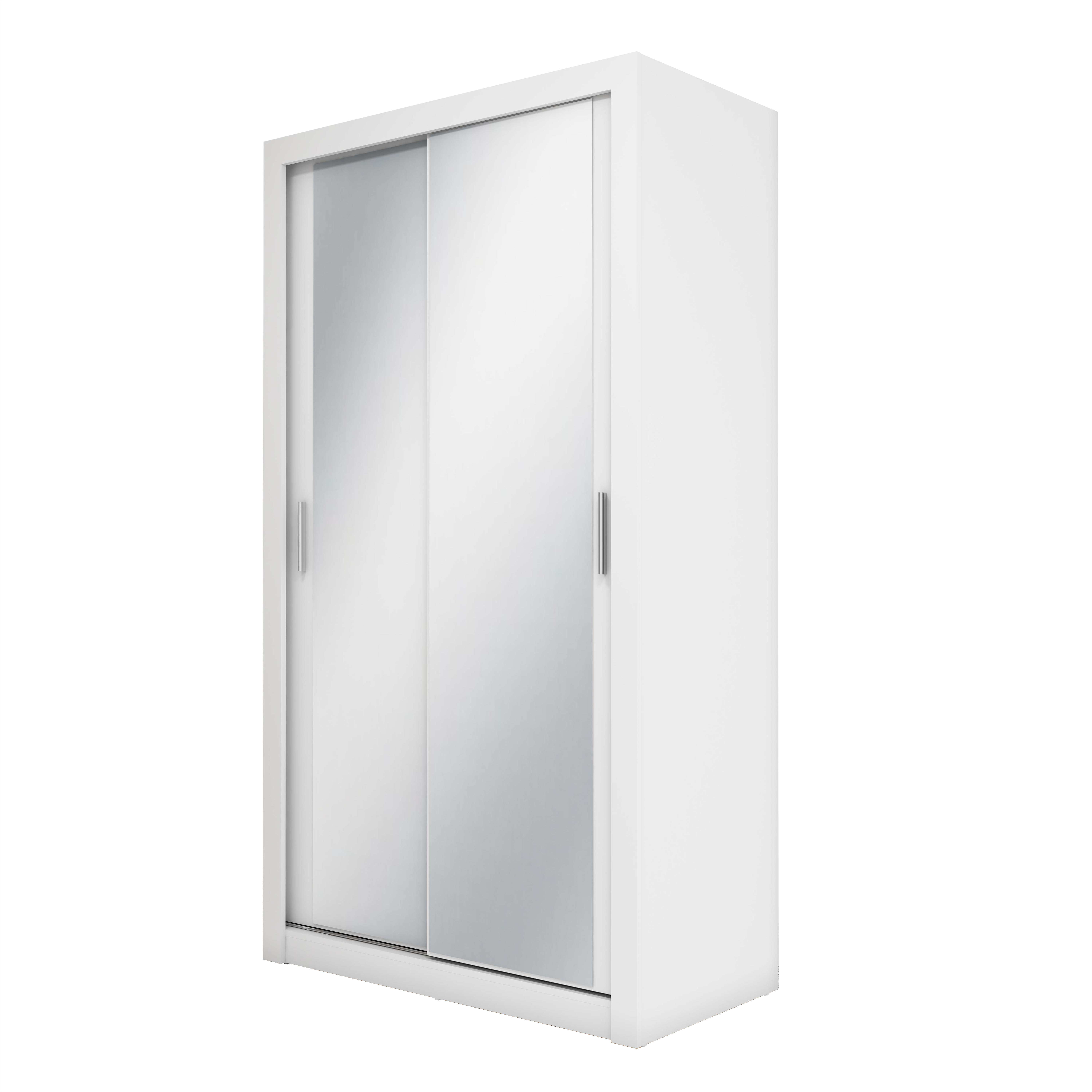 Niewielka szafa z dwojgiem drzwi przesuwnych, które świetnie oszczędzają przestrzeń. Idealna do sypialni, garderoby, przedpokoju lub pokoju nastolatki/nastolatka. Modny, a jednocześnie uniwersalny design to zasługa prostej formy oraz sprawdzonych wybarwień, w jakich dostępna jest szafa. Uzupełnieniem jest duże lustro na obu frontach, które optycznie powiększa przestrzeń i pozytywnie wpływa na komfort korzystania z szafy. Wnętrze szafy kryje drążek na wieszaki oraz wewnętrzny regał z pojemnymi półkami. Na obszernych, górnych półkach z powodzeniem zmieszczą się rzadziej używane rzeczy lub walizki.