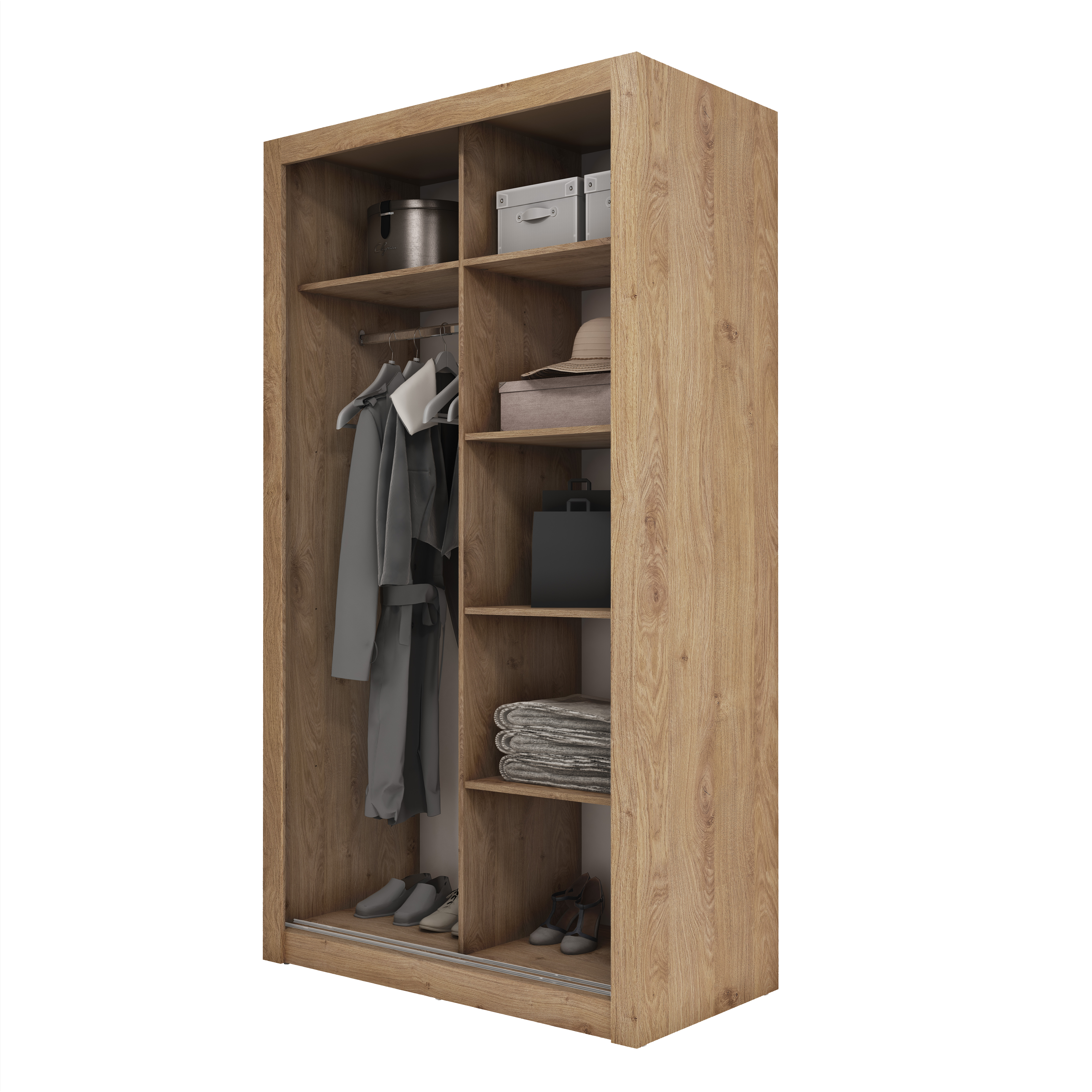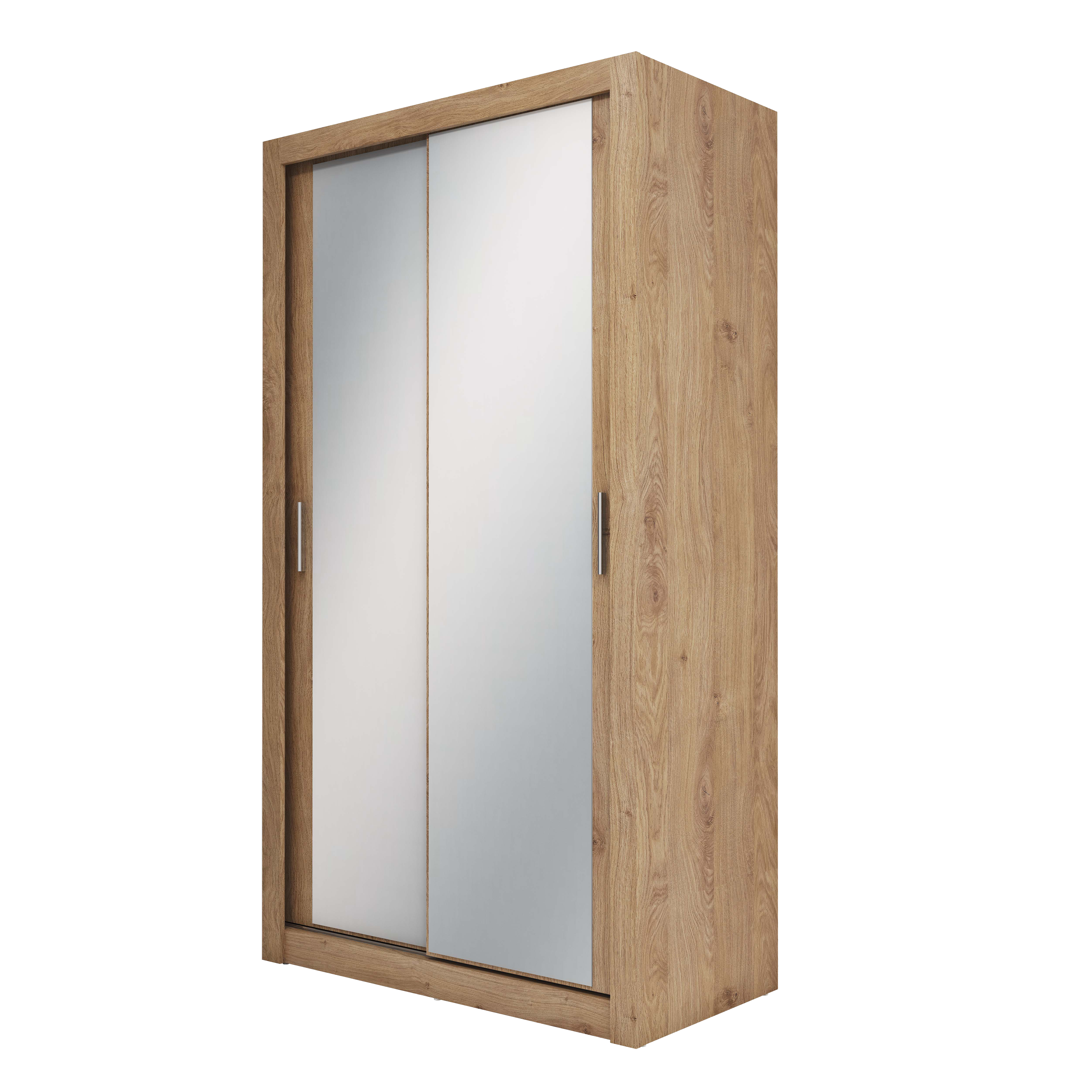 Niewielka szafa z dwojgiem drzwi przesuwnych, które świetnie oszczędzają przestrzeń. Idealna do sypialni, garderoby, przedpokoju lub pokoju nastolatki/nastolatka. Modny, a jednocześnie uniwersalny design to zasługa prostej formy oraz sprawdzonych wybarwień, w jakich dostępna jest szafa. Uzupełnieniem jest duże lustro na obu frontach, które optycznie powiększa przestrzeń i pozytywnie wpływa na komfort korzystania z szafy. Wnętrze szafy kryje drążek na wieszaki oraz wewnętrzny regał z pojemnymi półkami. Na obszernych, górnych półkach z powodzeniem zmieszczą się rzadziej używane rzeczy lub walizki.