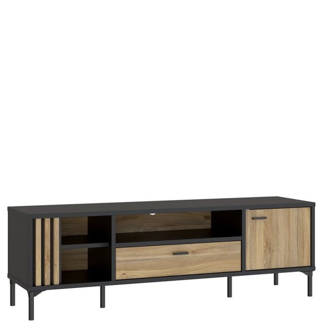 Szafka RTV z kolekcji JOAKIMIS będzie podstawą strefy rozrywki w Twoim salonie. Na blacie możesz ustawić telewizor o wielkości do 70 cali. 1 szuflada, 3 otwarte wnęki oraz 1 zamykana szafka pomogą w komfortowym przechowywaniu sprzętu RTV i akcesoriów kina domowego. Natomiast otwory w tylnej ścianie szafki umożliwią łatwą organizację kabli. Ciekawym wizualnie akcentem jest wstawka z lameli.