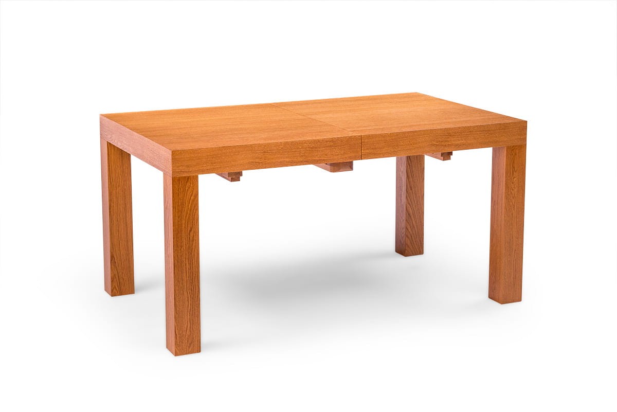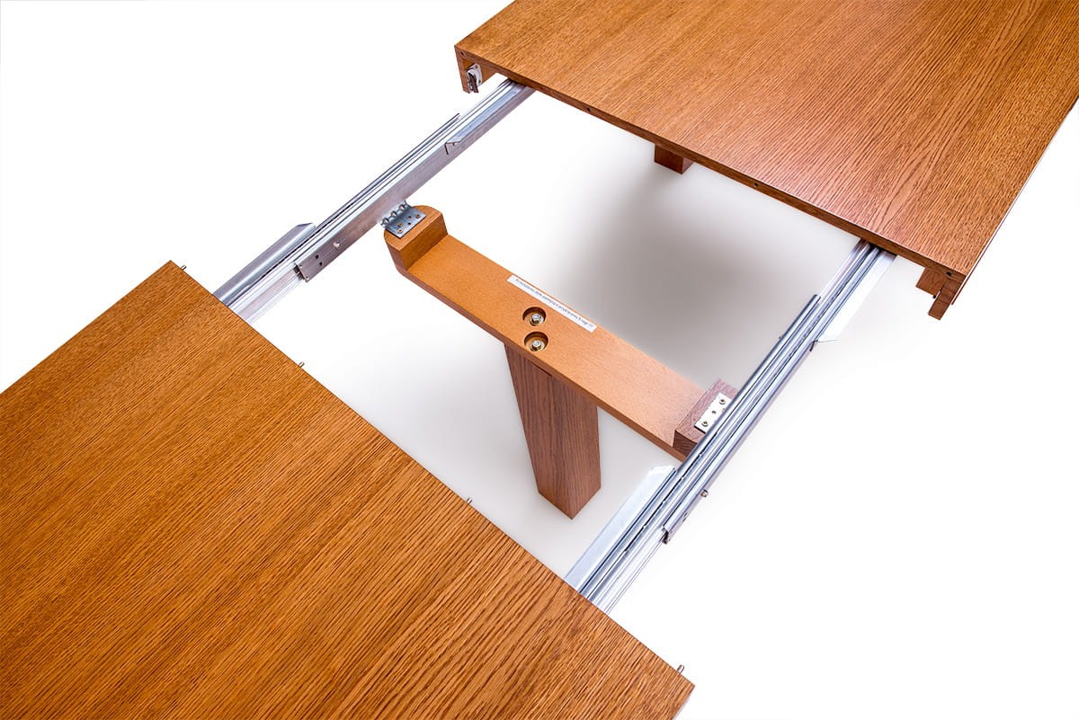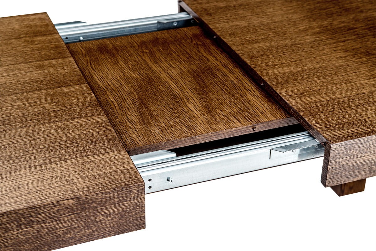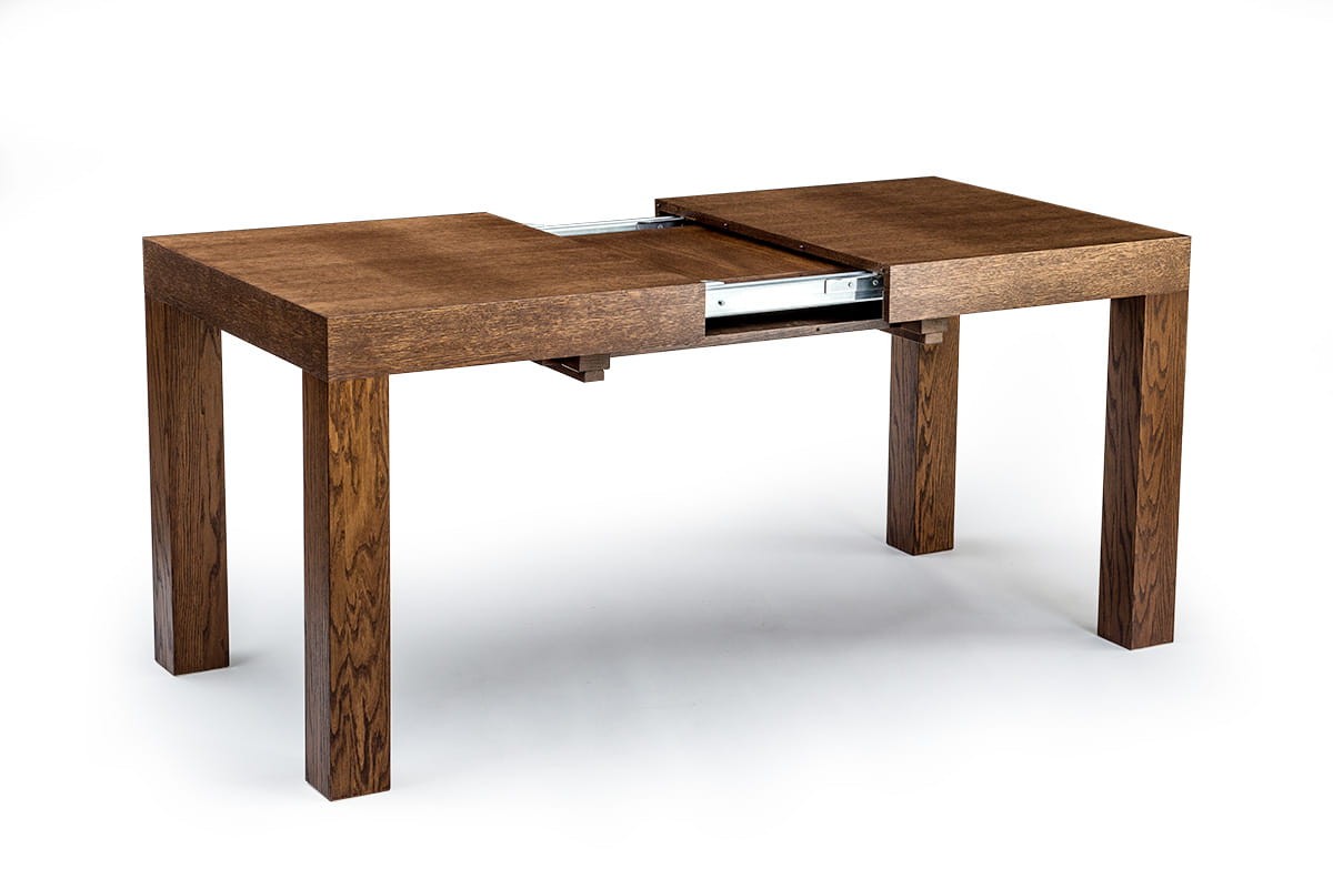 Stół dębowy KARLOS to nasz hit sprzedaży. Bardzo duży wybór rozmiarów pozwala dopasować go zarówno do małego jak i bardzo dużego wnętrza. Najmniejszy rozmiar przed rozłożeniem to zaledwie 115 cm x 80 cm a największy po rozłożeniu 380x100 cm. Mechanizm rozkładania na prowadnicach metalowych, przy rozkładaniu przesuwają się nogi, dzięki temu wszystkie krzesła mieszczą się pod stołem. Dwie wkładki mieszczą się pod blatem. Przy trzech i czterech wkładkach konieczna do zamontowania jest dodatkowa noga (w zestawie). Grube dębowe nogi i fornirowany blat zapewniają stabilność, trwałość oraz bardzo elegancki wygląd.