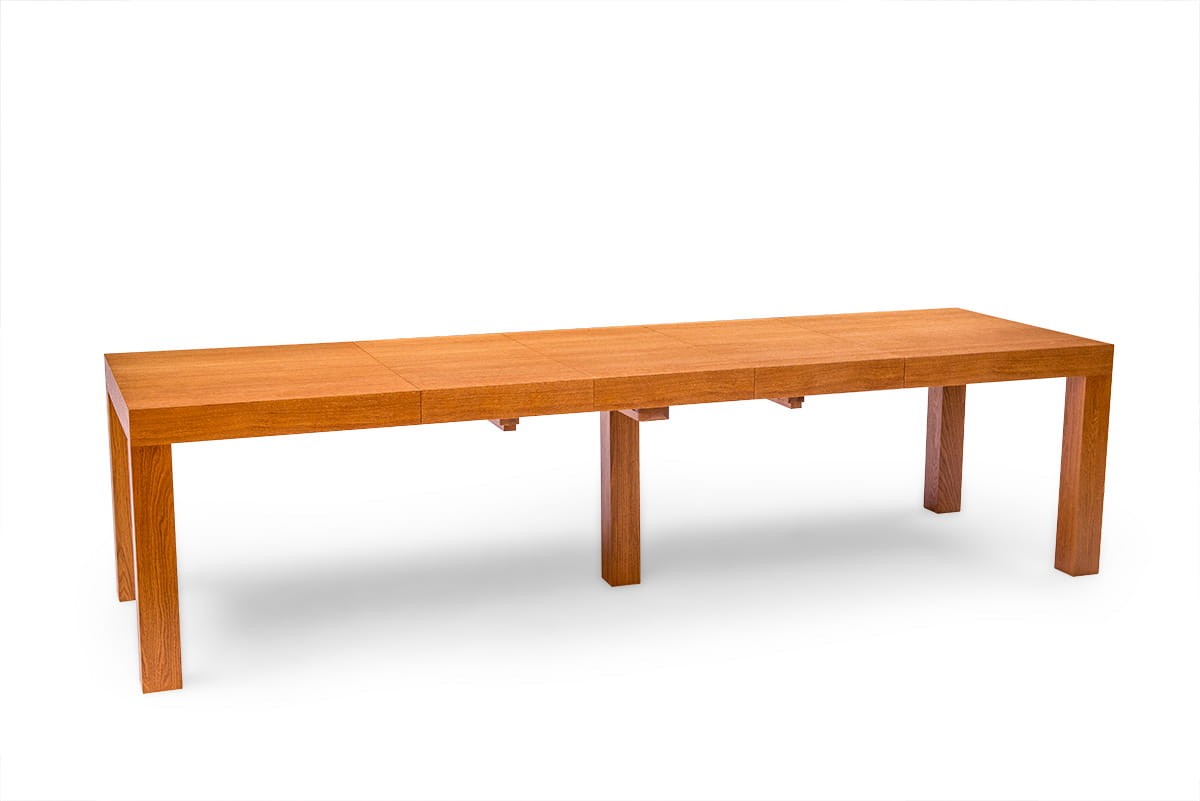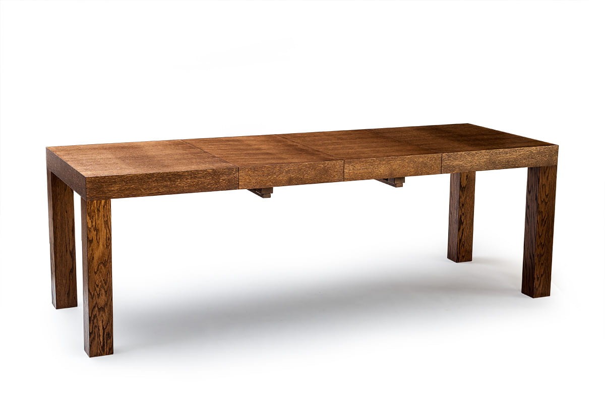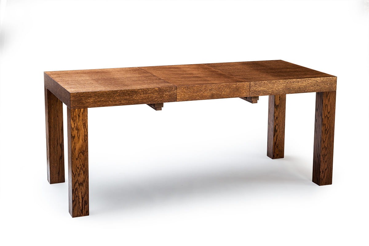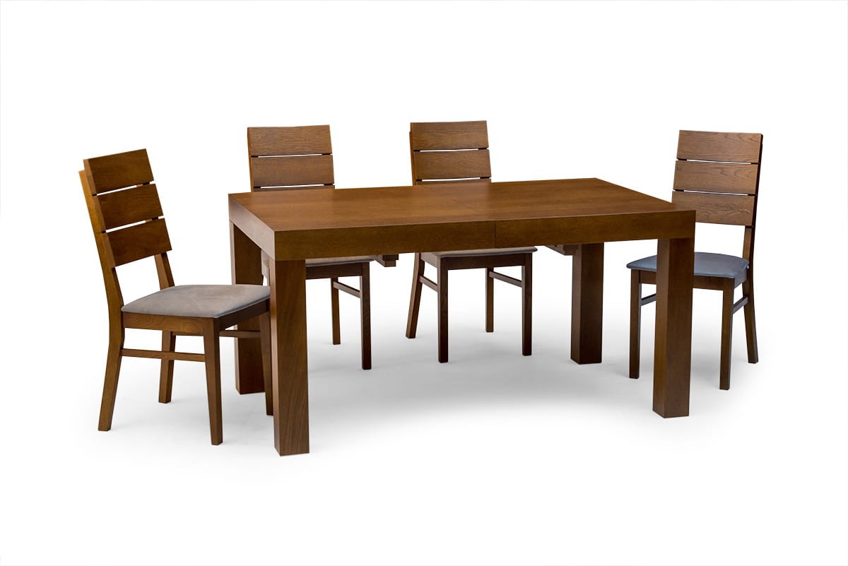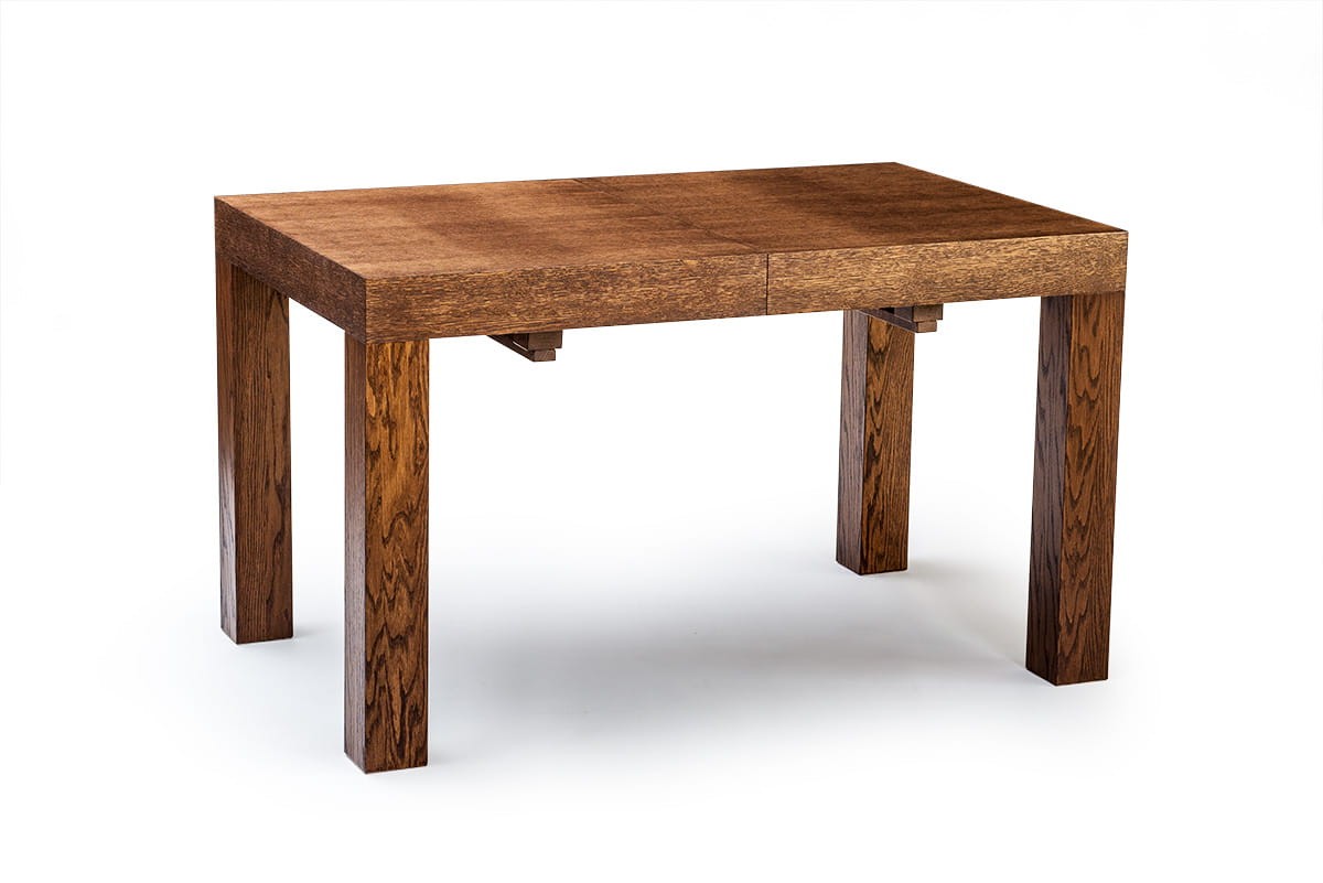 Stół dębowy KARLOS to nasz hit sprzedaży. Bardzo duży wybór rozmiarów pozwala dopasować go zarówno do małego jak i bardzo dużego wnętrza. Najmniejszy rozmiar przed rozłożeniem to zaledwie 115 cm x 80 cm a największy po rozłożeniu 380x100 cm. Mechanizm rozkładania na prowadnicach metalowych, przy rozkładaniu przesuwają się nogi, dzięki temu wszystkie krzesła mieszczą się pod stołem. Dwie wkładki mieszczą się pod blatem. Przy trzech i czterech wkładkach konieczna do zamontowania jest dodatkowa noga (w zestawie). Grube dębowe nogi i fornirowany blat zapewniają stabilność, trwałość oraz bardzo elegancki wygląd.