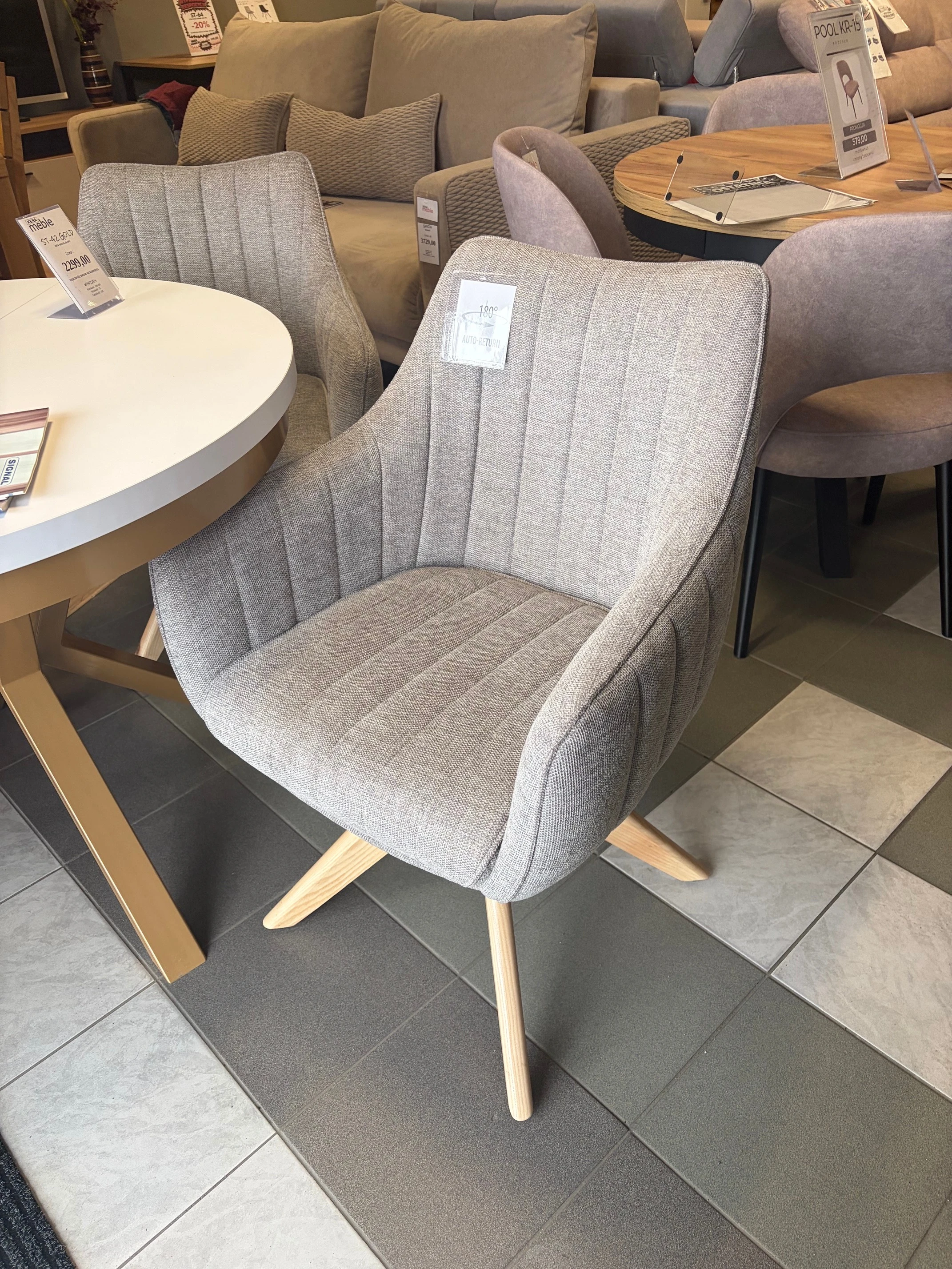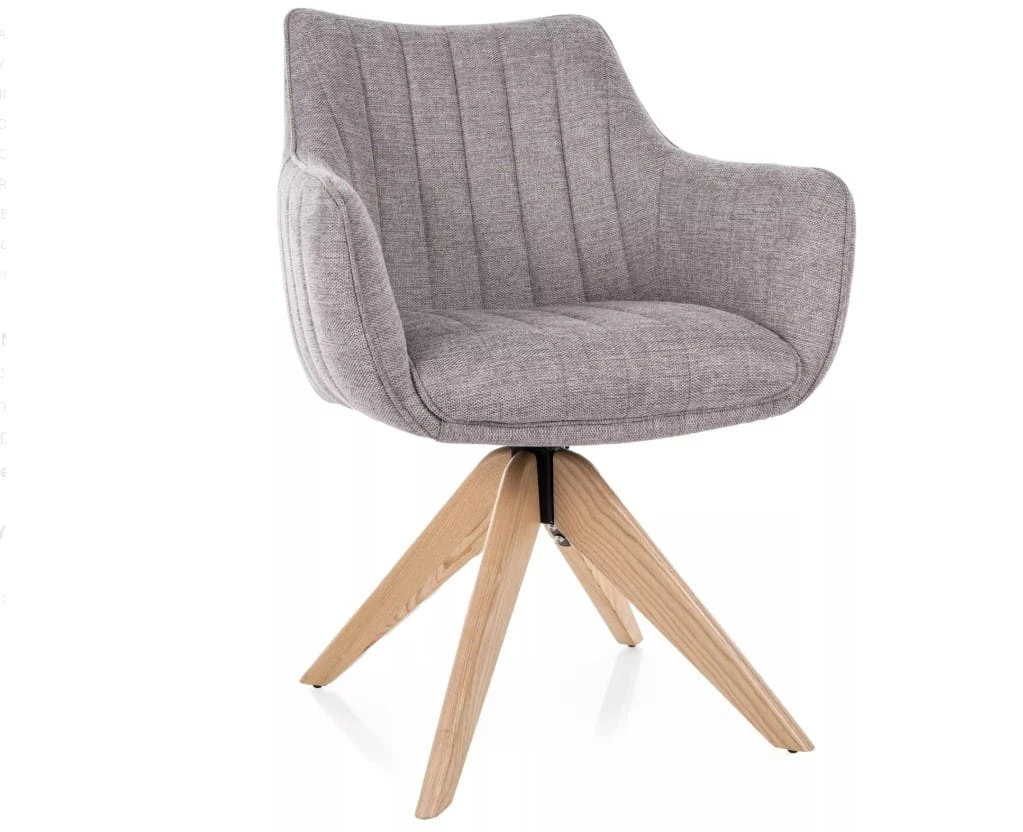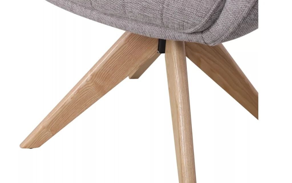 Miękkie siedzisko pokryte wysokiej jakości tkaniną BREGO zapewnia komfort użytkowania na co dzień, a solidny stelaż z drewna jesionowego gwarantuje trwałość i stabilność konstrukcji. Dodatkowym atutem jest funkcja Auto-Return – siedzisko obraca się w zakresie 180° i automatycznie wraca do pozycji wyjściowej, co zwiększa wygodę i utrzymuje porządek przy stole.