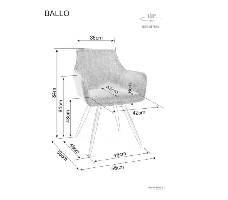 Krzesło Ballo łączy to co wygodne krzesło powinno posiadać: jest wygodne, wytrzymałe i dobrze wygląda. Niewątpliwą zaletą tego modelu jest obrotowy mechanizm z auto powrotem do pozycji wyjściowej. Zapewnia to dużą funkcjonalność i pewność, że krzesła zawsze dobrze będą wyglądały przy stole. Wysokie podłokietniki oraz miękkie siedzisko zapewnia wysoki komfort podczas użytkowania. Czarny metalowy stelaż zapewnia solidną i stabilną podstawę.