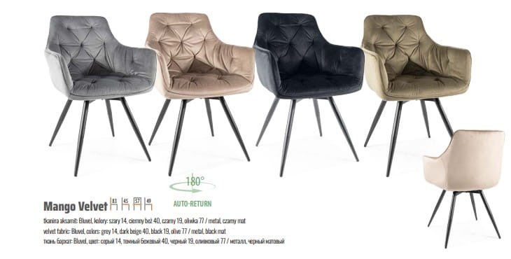 Krzesło Mango wyróżnia się dużą wygodą oraz funkcjonalnością. Mocno pikowane siedzisko i oparcia sprawia, że trudno przejść obok tego modelu obojętnie. Na pewno dużą zaletą krzesła jest możliwość obracania 180 stopni i powrotu do pozycji pierwotnej. Metalowe czarne nogi stanowią solidne podparcie a przy tym są bardzo uniwersalne i będą pasować do każdego wnętrza. Krzesło Mango świetnie sprawdzi się w każdej nowoczesnej jadalni, a dzięki możliwości obracania także jako krzesło do biurka lub toaletki.