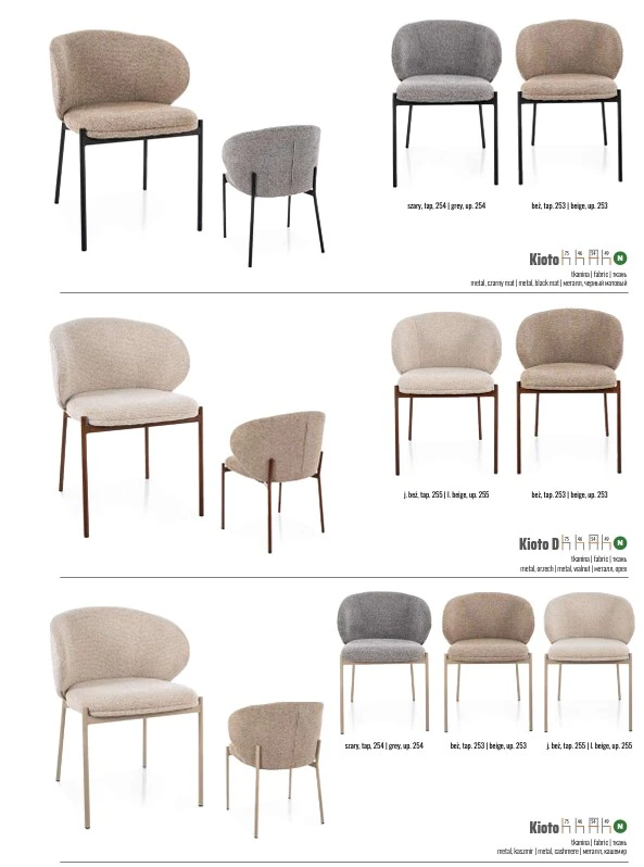 Krzesło Kioto to eleganckie i kompaktowe krzesło tapicerowane, które świetnie odnajduje się w nowoczesnych wnętrzach inspirowanych stylem japandi, skandynawskim i minimalistycznym. Prosta forma, miękkie linie oraz naturalna kolorystyka sprawiają, że model dobrze wygląda przy stole i łatwo dopasować go do różnych aranżacji.