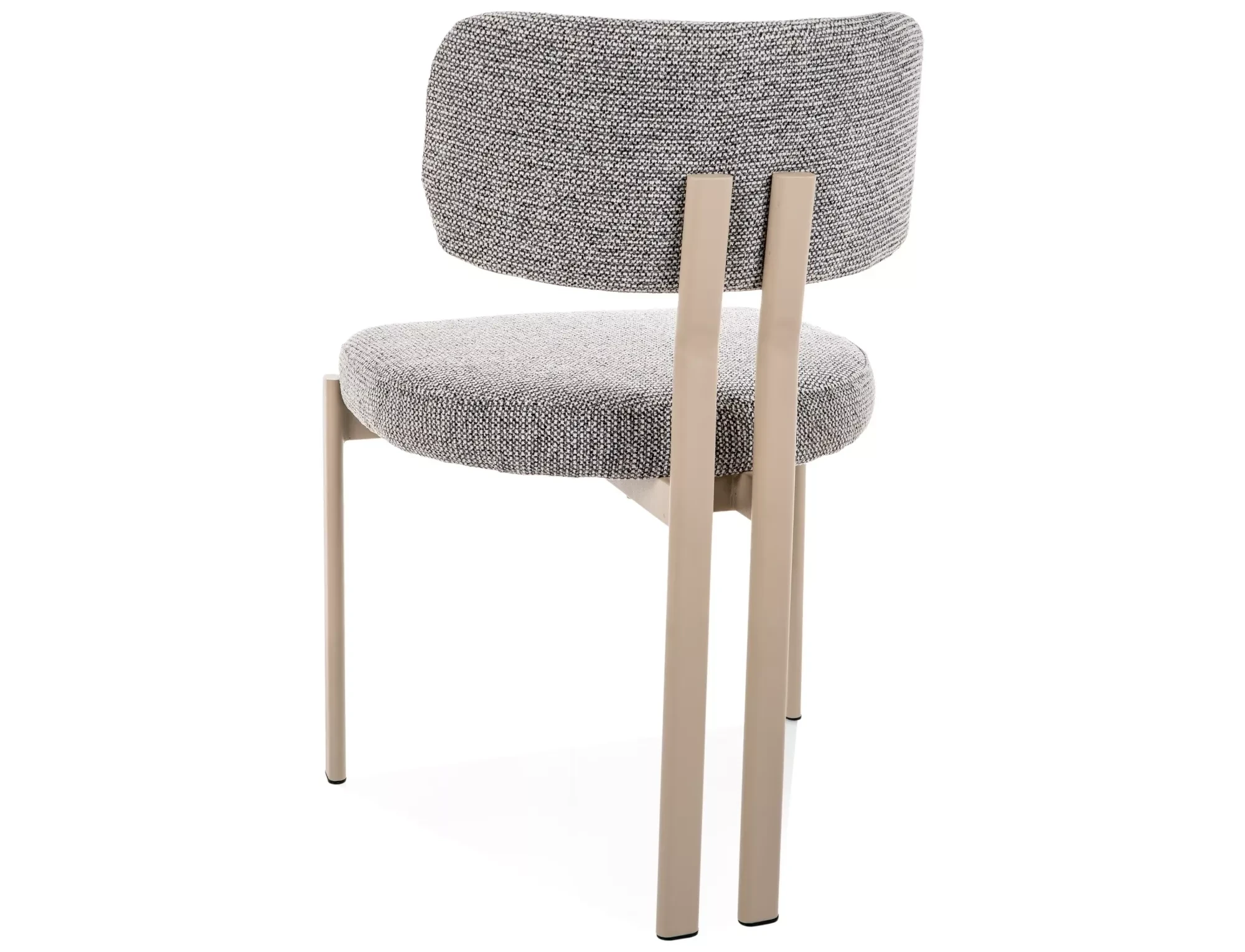Model stoi na czterech metalowych nogach, jednak jego charakterystyczną cechą jest nietypowa konstrukcja tylnej części stelaża – dwie tylne nogi znajdują się blisko siebie. Dzięki temu krzesło wygląda bardzo lekko i ciekawie przy stole, a jednocześnie pozostaje stabilne.