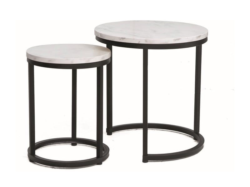 W prezentowanej wersji stelaż wykonany został z metalu pomalowanego na kolor czarny. Blat to wytrzymała płyta laminowana z efektem białego marmuru. Nowoczesna forma oraz duża funkcjonalność sprawia, że stoliki te świetnie sprawdzą się w twoim salonie.