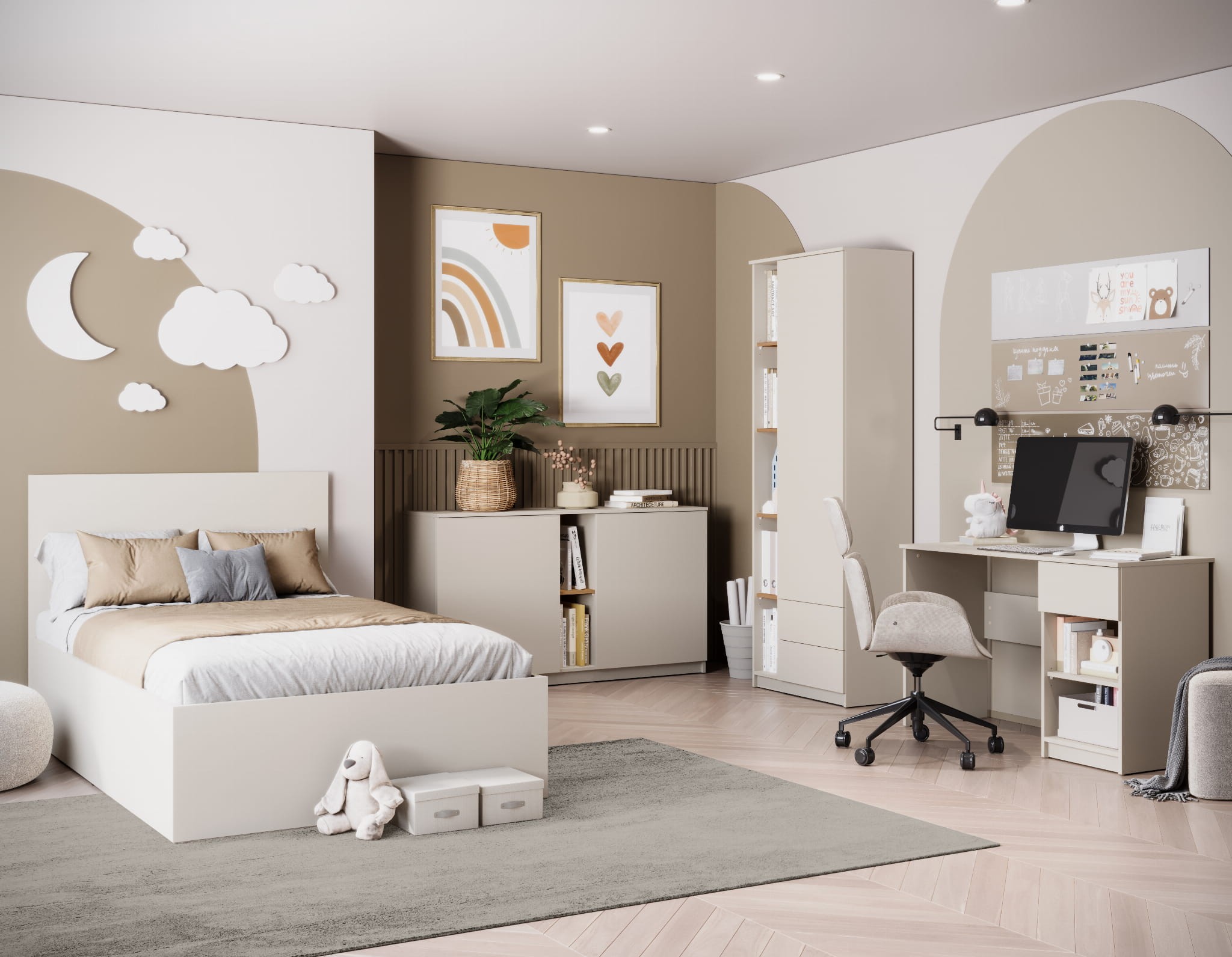 Kolekcja mebli FANO do pokoju młodzieżowego charakteryzuje się minimalistycznym designem i bezuchwytowymi bryłami. Eleganckie połączenie kolorów kaszmiru i karmelowego dębu sprawia, że meble te pasują do różnych stylów aranżacyjnych. FANO łączy praktyczność z estetyką, oferując nowoczesne i uniwersalne rozwiązania dekoracyjne.