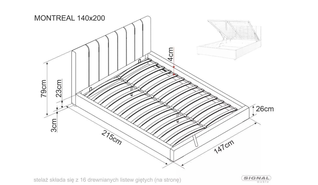 Wyróżnia się miękkim, pikowanym zagłówkiem, który zapewnia komfort podczas odpoczynku lub czytania. Łóżko MONTREAL jest wyposażone w stelaż z listew giętych, osadzonych w elastycznych uchwytach, co gwarantuje odpowiednie podparcie dla materaca.