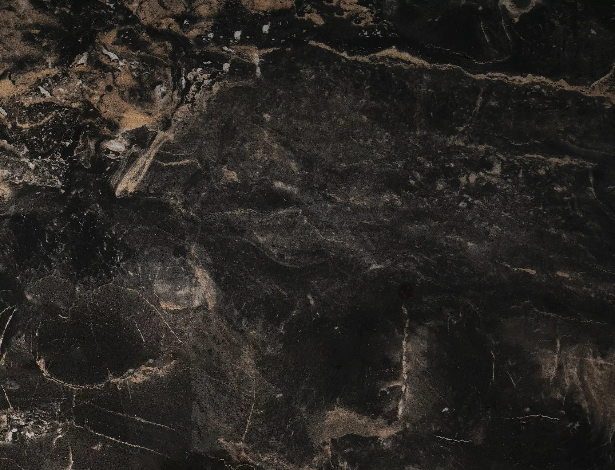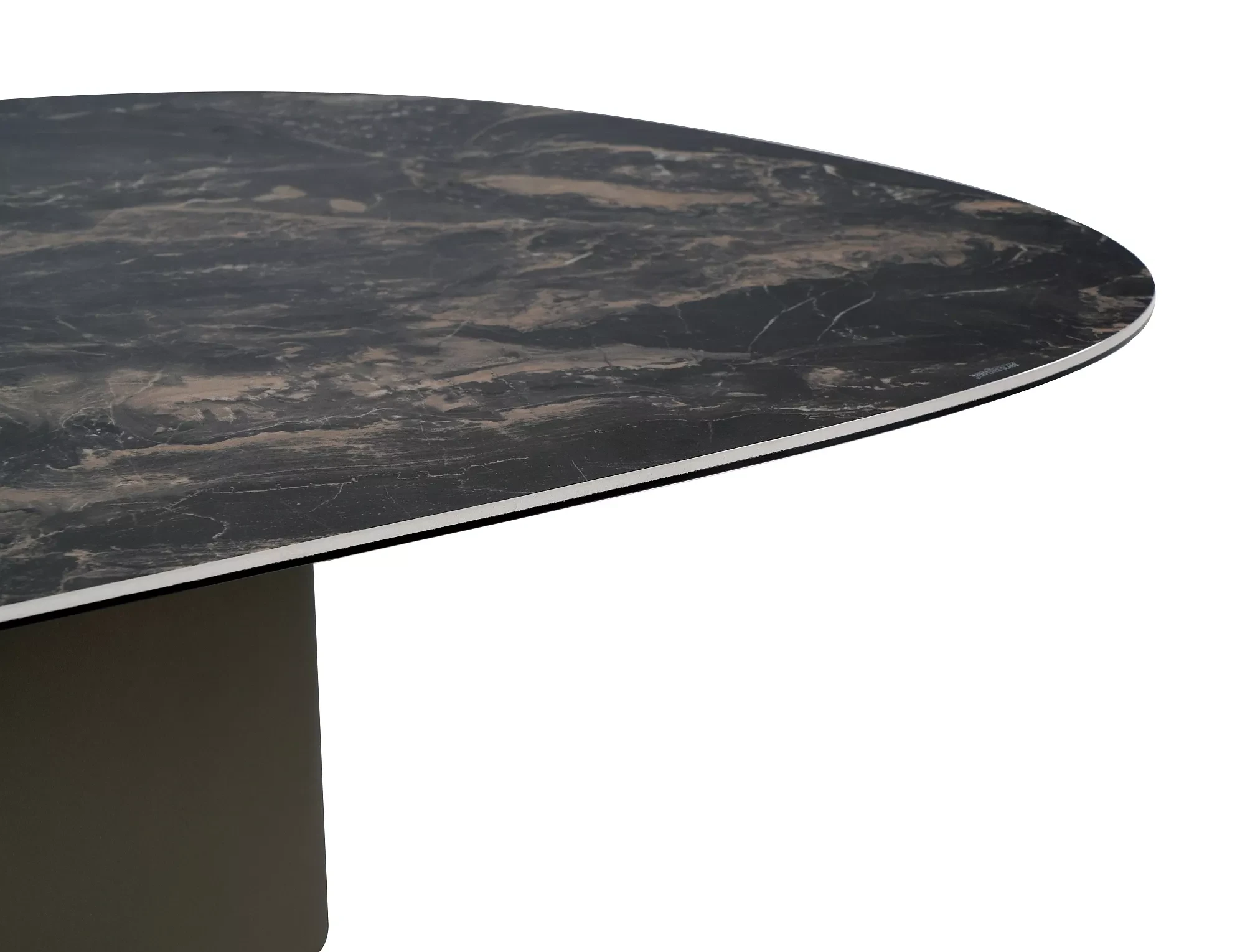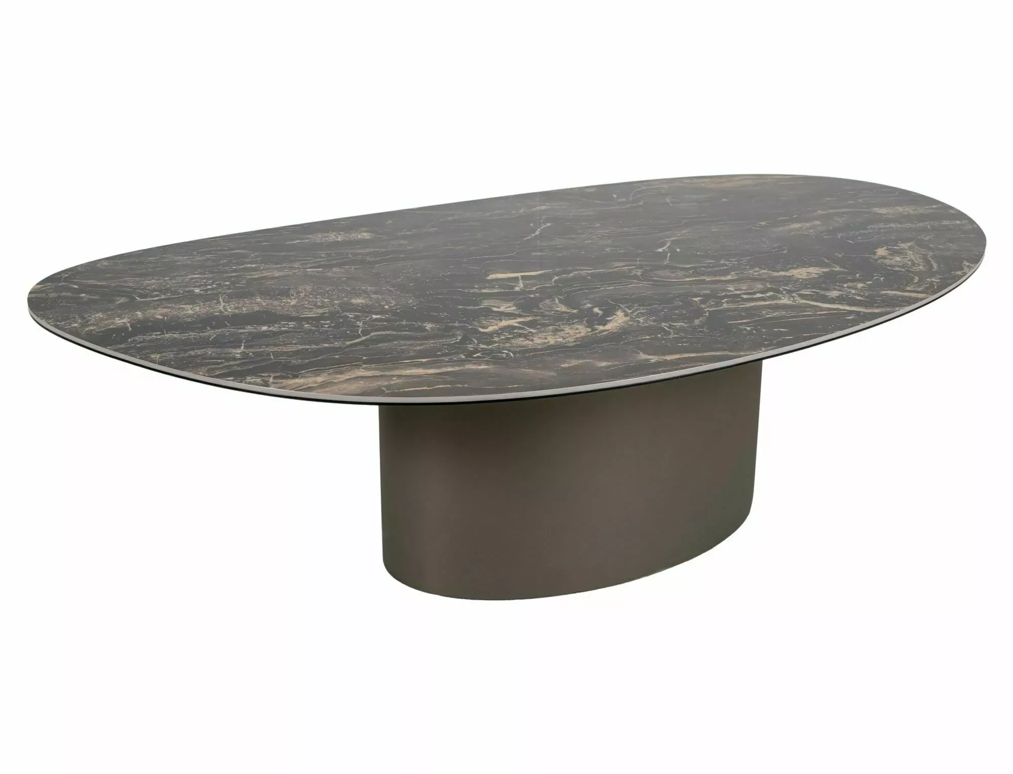 Ława, blat: szkło hartowane + hiszpańska ceramika Vulcano, stelaż: metal, kolor: czarny połysk / miedziany.