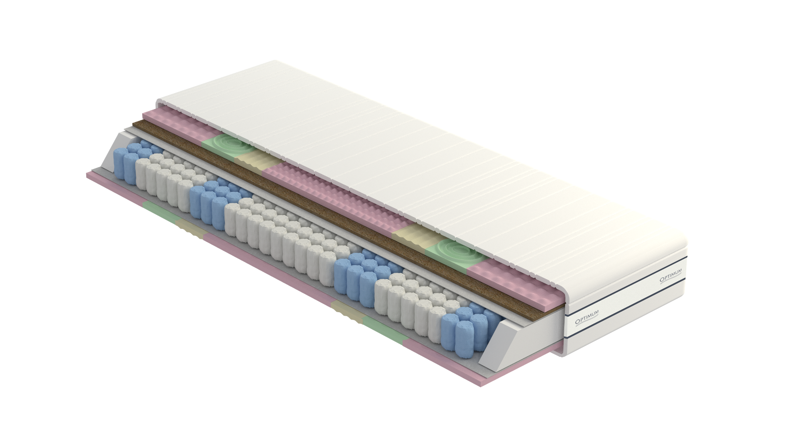 Wkład: sprężyny kieszeniowe 7-strefowe (około 270 sprężyn na m²), przekładki tapicerskie, płyty z pianki wysokoelastycznej HR profilowanej (3cm/2cm), kokos (1cm).