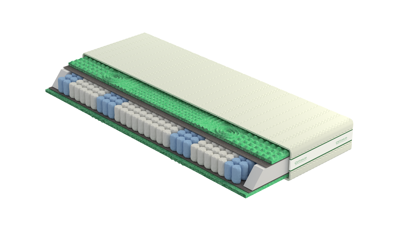 Wkład: sprężyny kieszeniowe 7-strefowe (około 270 sprężyn na m²), przekładki tapicerskie, płyty z pianki wysokoelastycznej HR profilowanej o zwiększonej gęstości (4cm/2,5cm).