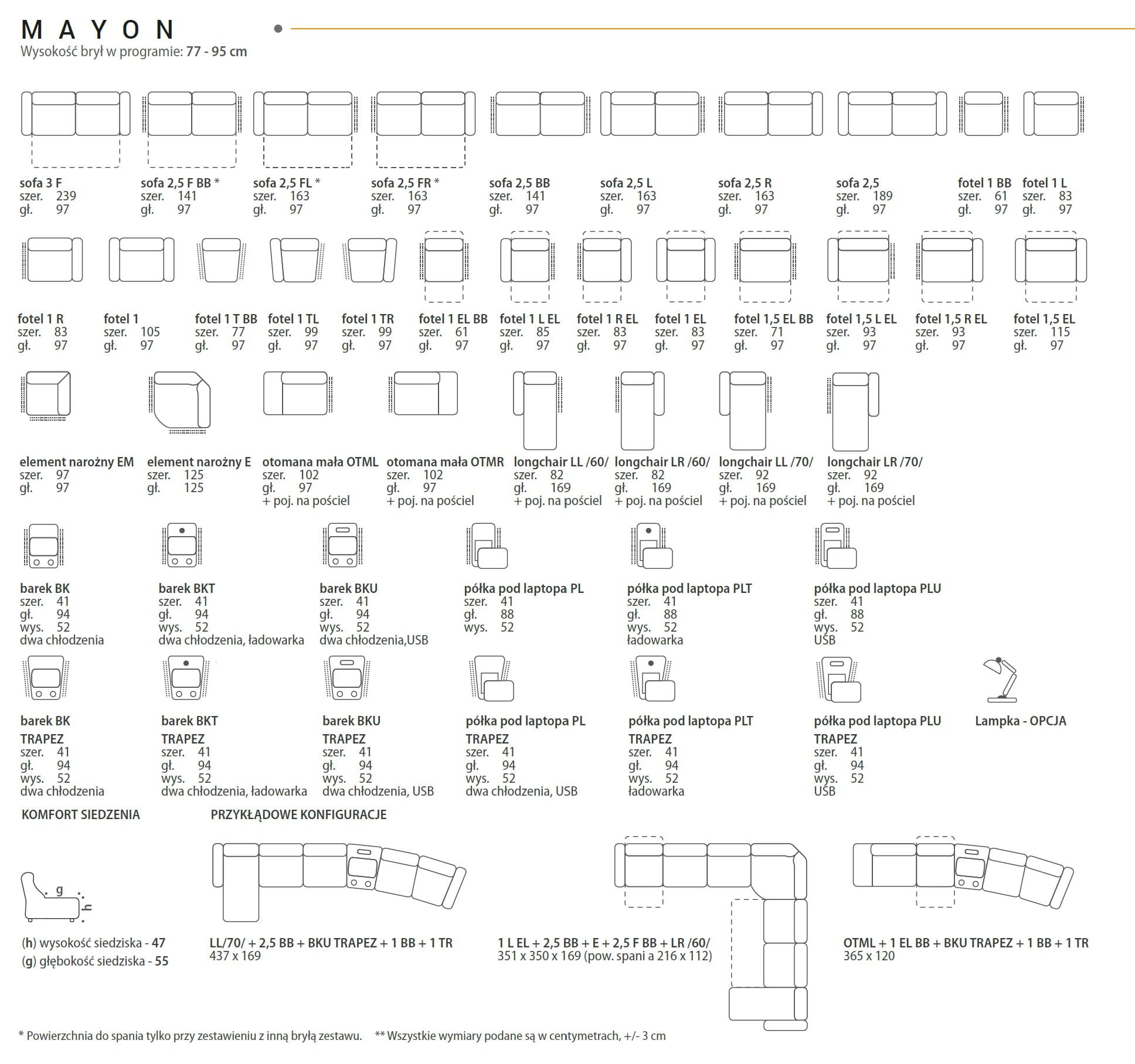 W naszych meblach zestawy narożne charakteryzują się obszernymi powierzchniami do spania. Tak też jest w programie mebli MAYON. Mechanizm typu „Delfin” to wręcz dziecinnie prosty sposób aby z całodziennej bryły meblowej stworzyć iście sypialniane miejsce o dobrym komforcie do spania.