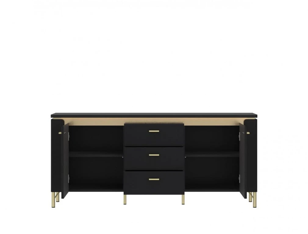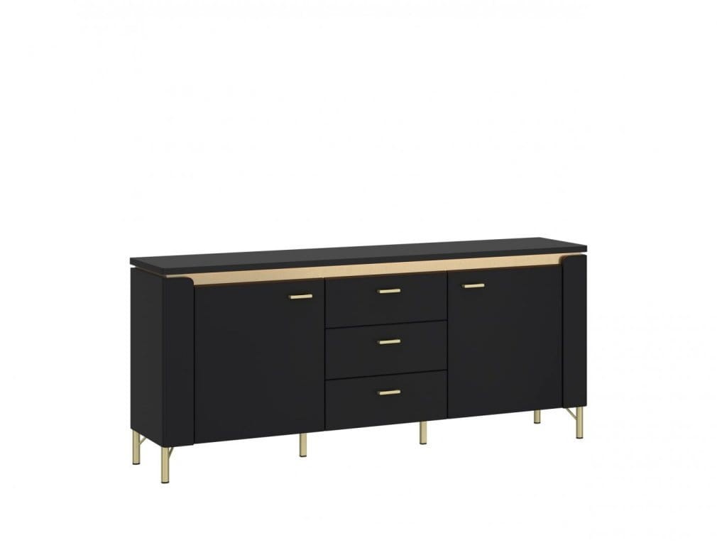 Komoda RTV Norica, wykonana z płyty wiórowej laminowanej oraz MDF w odcieniach Czarny Mat i Złoty wyposażona została w stylowe uchwyty i nóżki, wykonane z metalu, zabarwione na odcień złoty. Bryła zawiera dwa fronty drzwiowe z zawiasami cichodomykającymi się oraz trzy pojemne szuflady, przesuwane na prowadnicach kulkowych. Pasek LED TREND, prezentowany w konstrukcji mebla zapewnia nowoczesny efekt wizualny, podkreślając stylowe wyposażenie części multimedialnej w salonie.