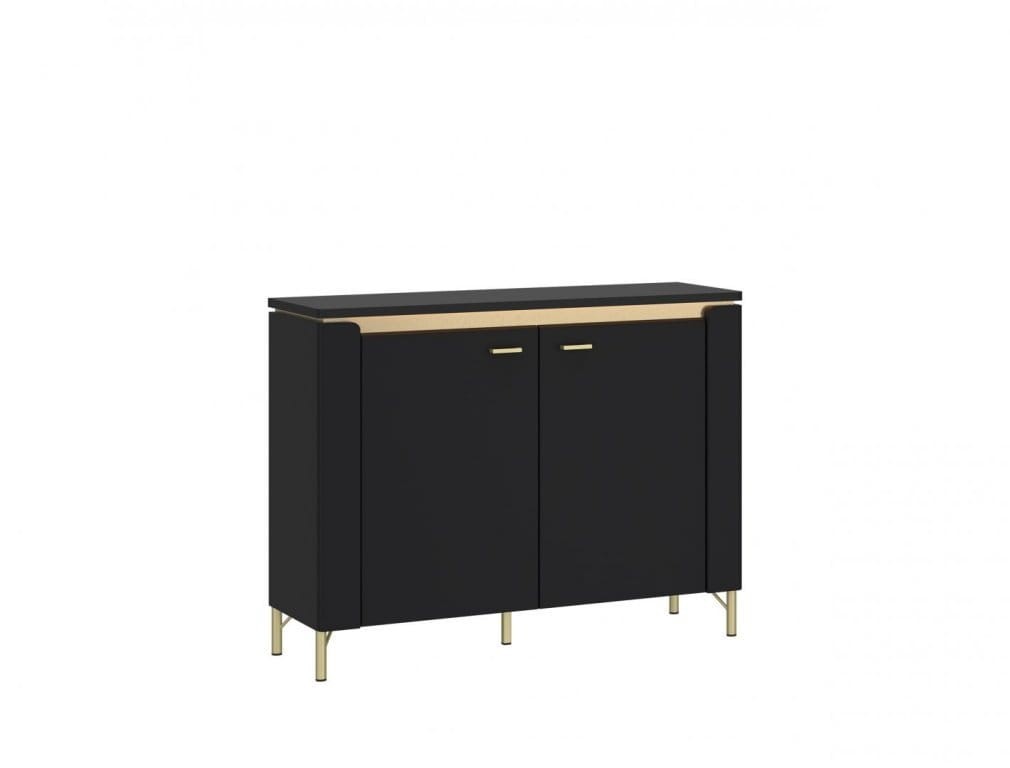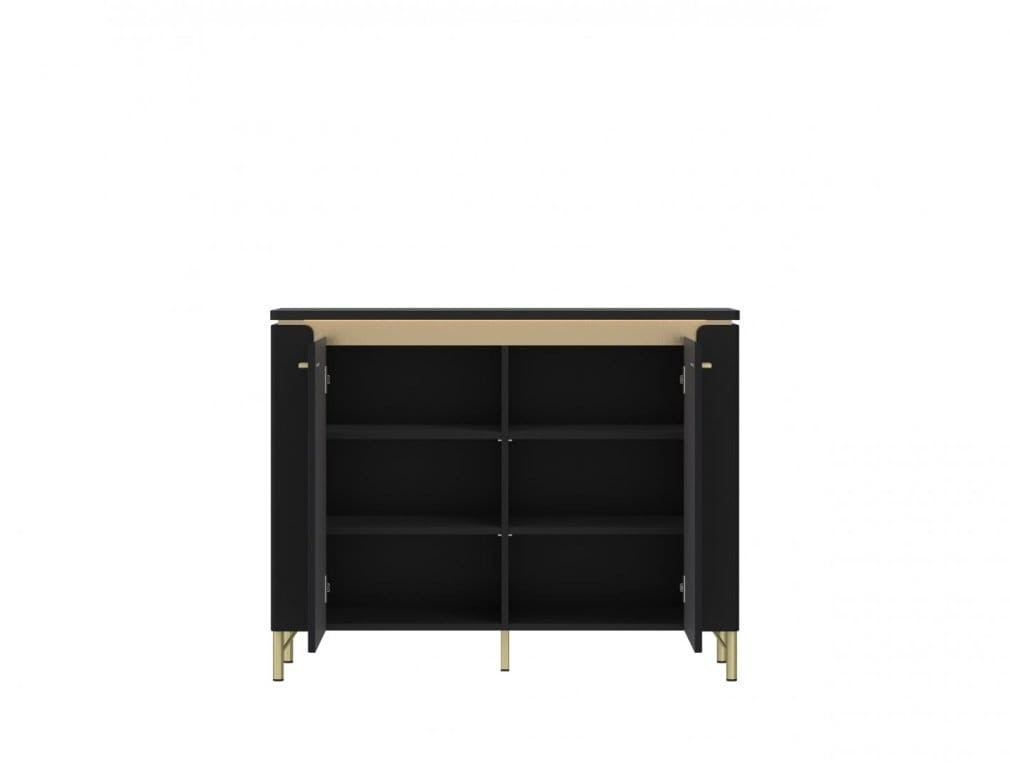 Komoda dwudrzwiowa Norica ukazuje ponadczasowe, luksusowo wyglądające zestawienie matowej czerni z odcieniem złota. Mebel, wyposażony w konstrukcyjne oświetlenie LED TREND posiada starannie dopracowany design, w którym element złoty doskonale spaja się z uchwytami i nóżkami metalowymi, również utrzymanymi z złotej tonacji. Komoda, wykonana z płyty wiórowej laminowanej oraz płyty MDF zachwyca pojemnością przechowywania na półkach, umieszczonych za pełnymi frontami drzwiowymi. Mebel posiada zawiasy, zapewniające cichy domyk.