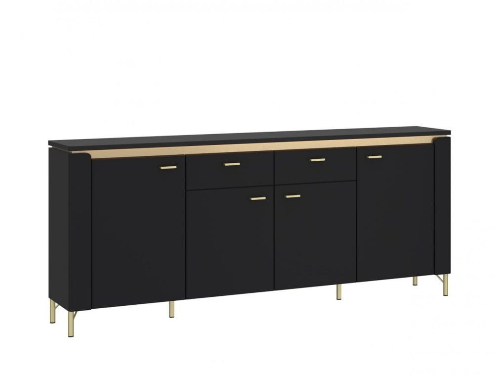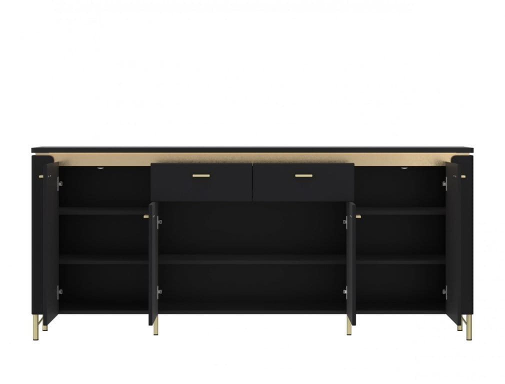 Największa spośród komód serii Norica wyposażona została w pojemne półki, umieszczone za czterema, pełnymi frontami drzwiowymi, wykonanymi z MDF. Fronty osadzono na zawiasach, zapewniających cichy domyk. Komoda, której korpus powstał z wiórowej płyty laminowanej posiada dwie szuflady, wysuwane całkowicie dzięki niezawodnym prowadnicom kulkowym. W meblu zastosowano eleganckie uchwyty metalowe w odcieniu złota oraz metalowe nóżki w tym samym wybarwieniu. Całość utrzymana jest w tonacji matowej czerni z elementem złota. Konstrukcyjne oświetlenie w postaci paska LED TREND wraz z prostotą kształtu pozwala osiągnąć nowoczesny efekt designu mebla.