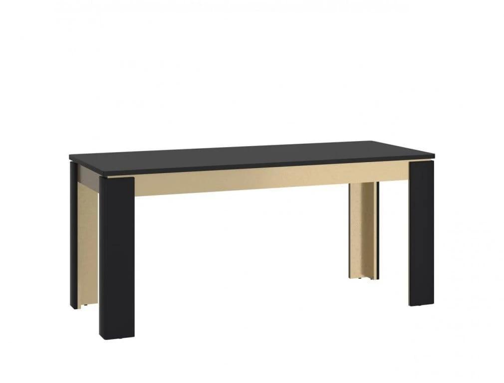 Praktyczny stół rozkładany Norica posiada czarny, matowy blat, wykonany z płyty wiórowej laminowanej. Mechanizm rozkładania oparto na prowadnicy synchronicznej. Nogi stołu, łączące kolorystykę złota z matową czernią powstały z MDF i płyty wiórowej laminowanej. Widoczne elementy oskrzyni utrzymane są w kolorystyce złota.